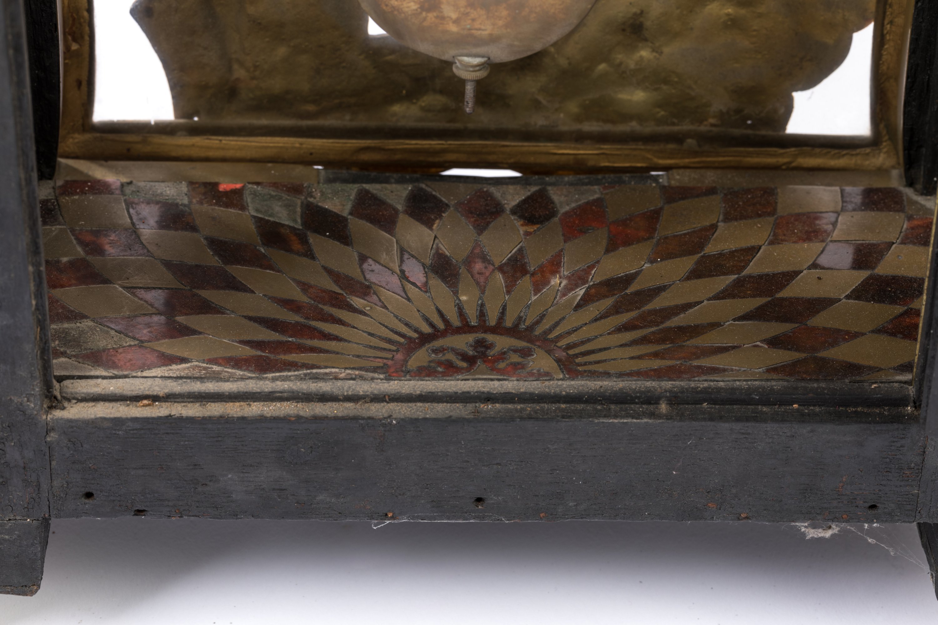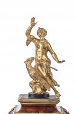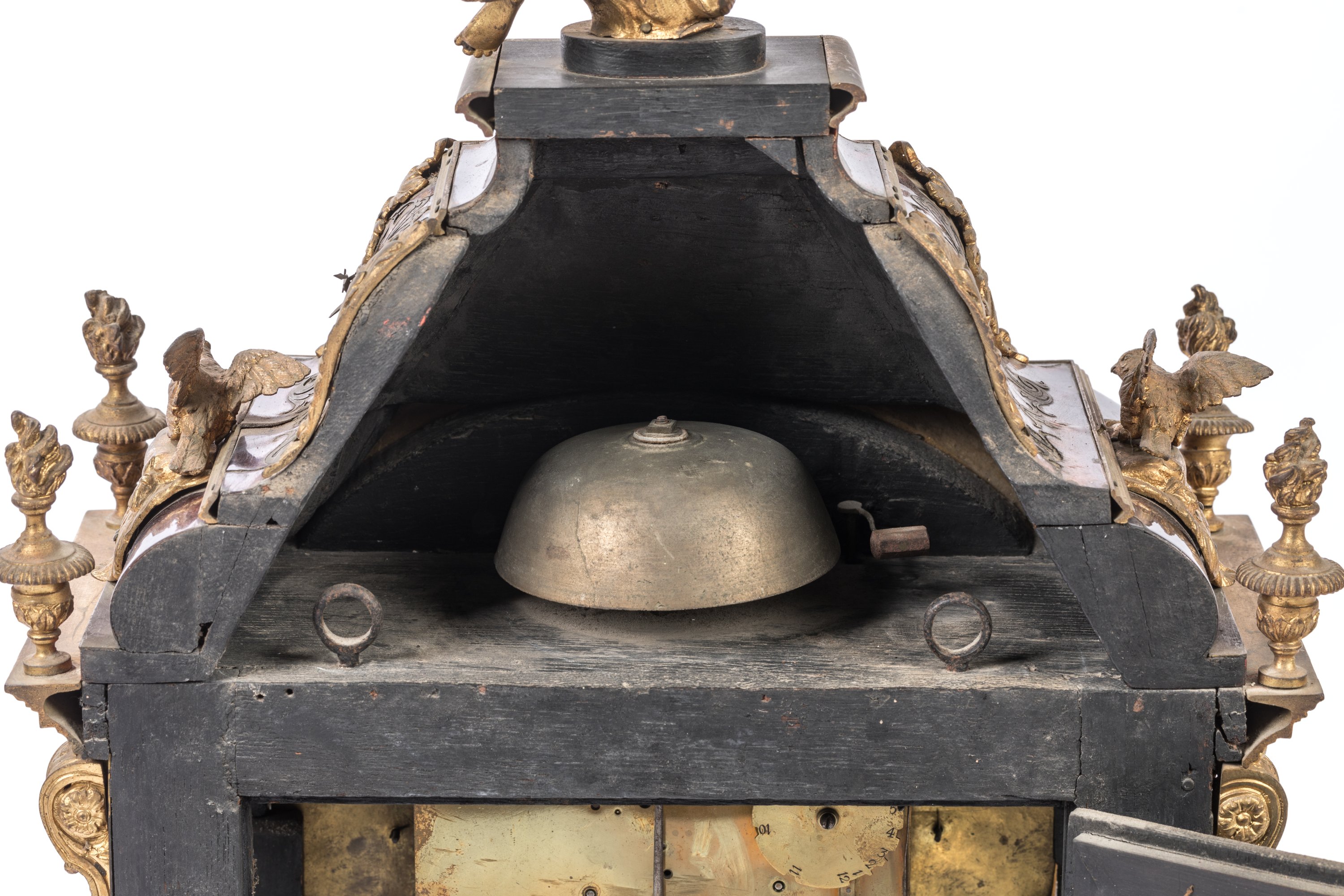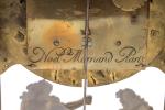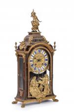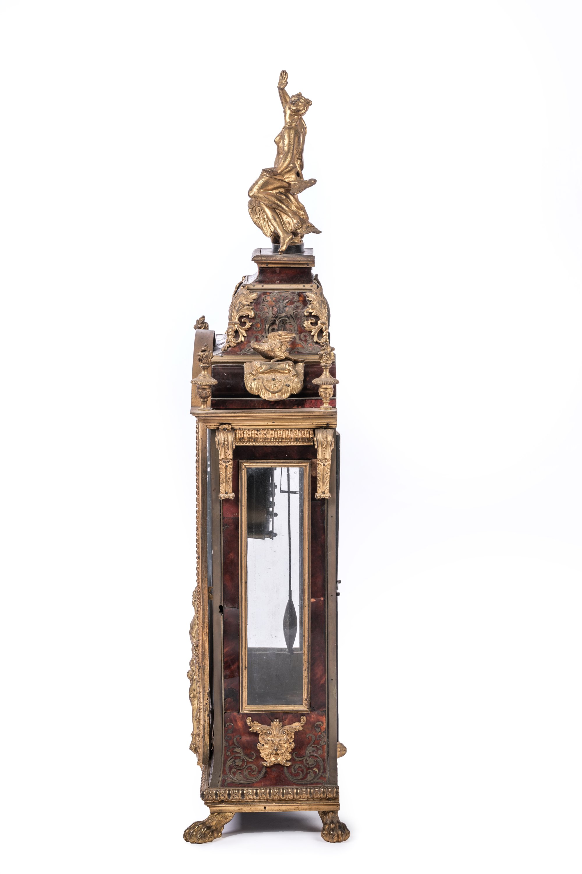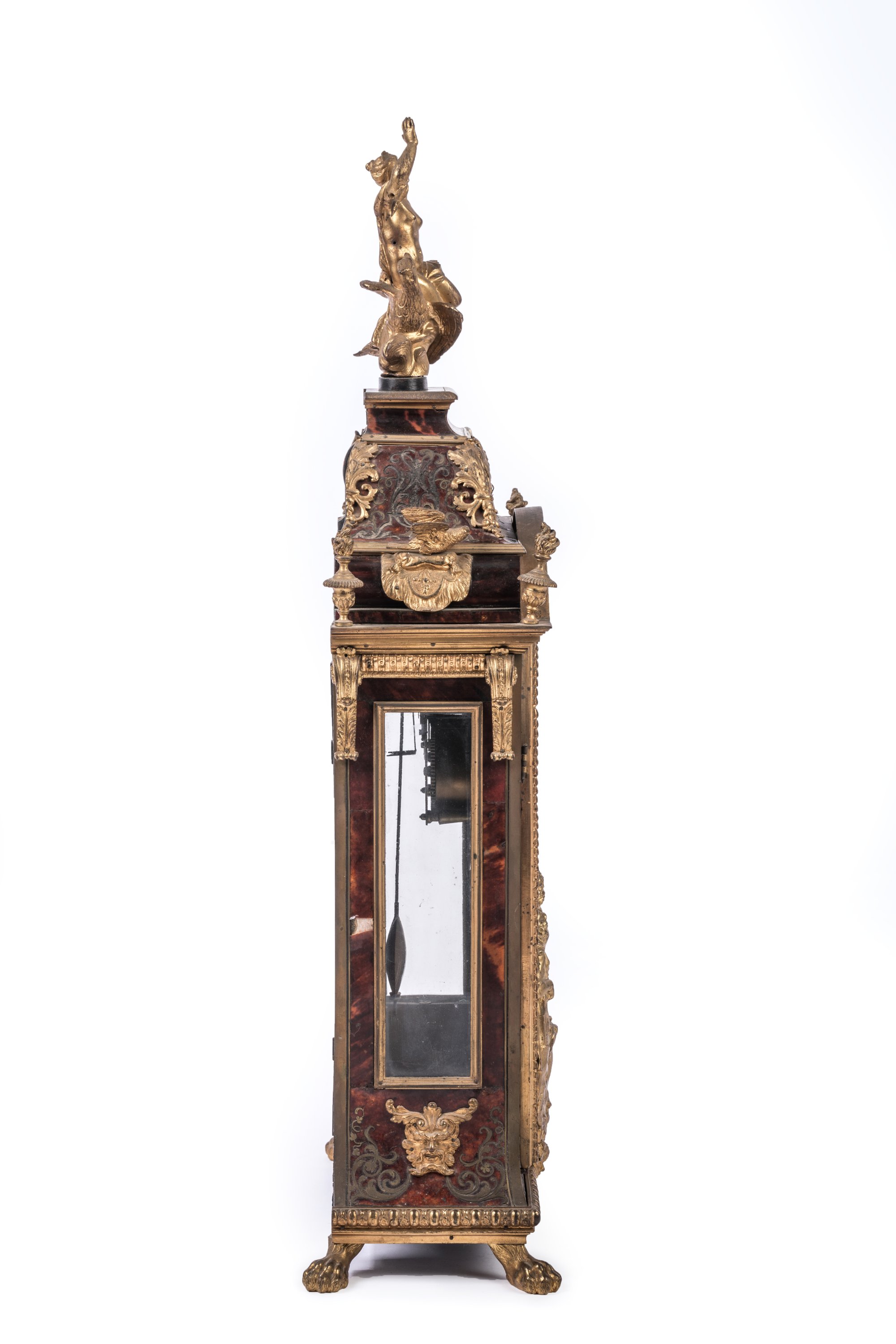 en écaille, laiton et bronze doré. La partie haute en forme de dôme est surmontée d'une figure de La Renommée sur l'aigle de Zeus. Le boitier d'horloge, de forme rectangulaire en laiton gravé sur fond d'écaille rouge, est orné de galeries, d'enroulements feuillagés, d'oiseaux et de pots-à-feux en bronze doré et ciselé. Il présente quatre consoles feuillagées. La porte vitrée en façade est ornée d'un bas-relief figurant Apollon et Héraclès se disputant le trépied de Delphes. Le cadran à chiffres romains est orné de quatorze pièces émaillées sur cuivre et signé "Noel Mornand à Paris". L'ensemble repose sur quatre pieds griffus.