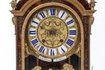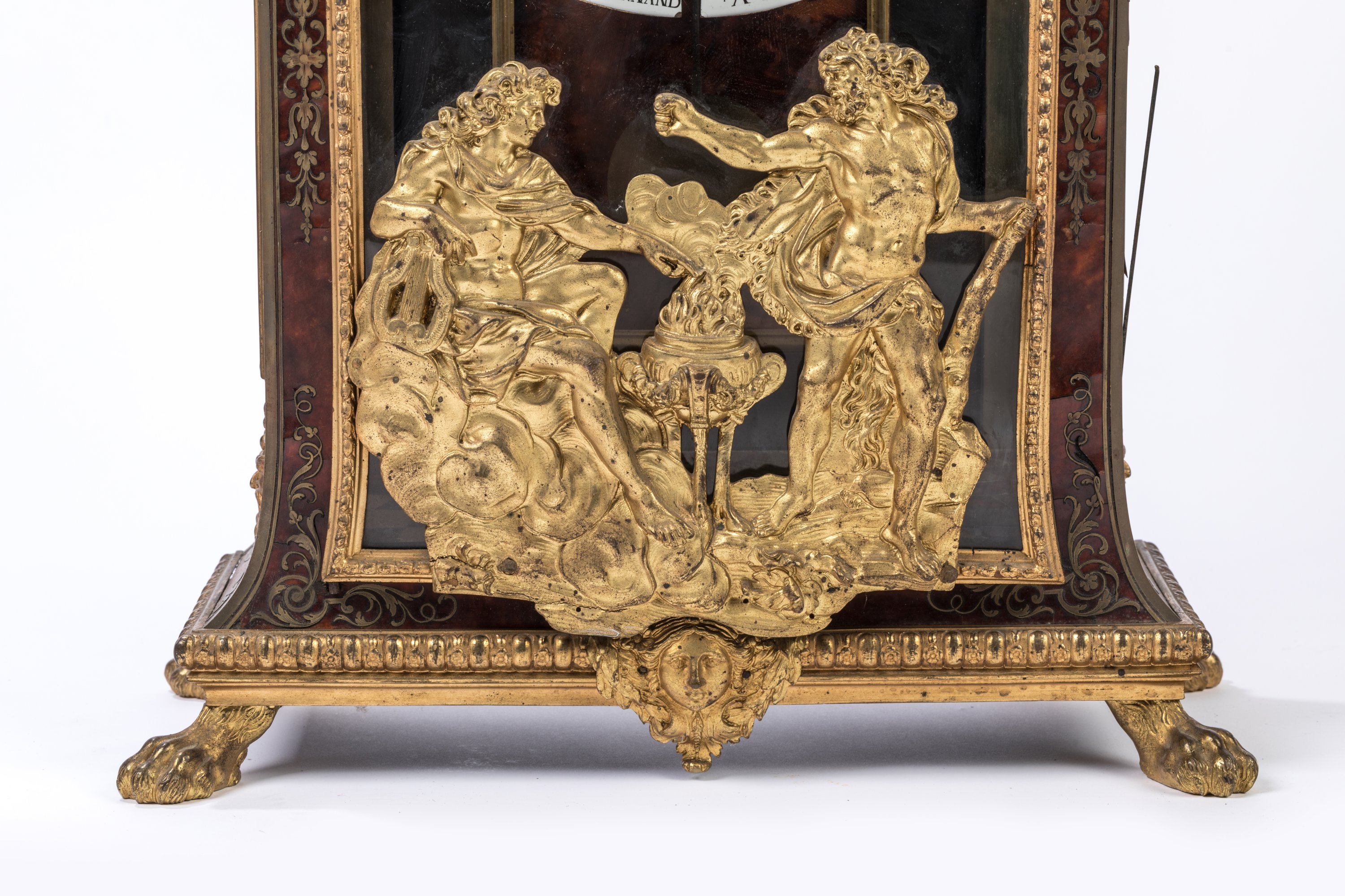 A Louis XIV brass wall clock depicting Heracles and Apollo's fight. Bronze ornaments, enameled face, four clawed feet.