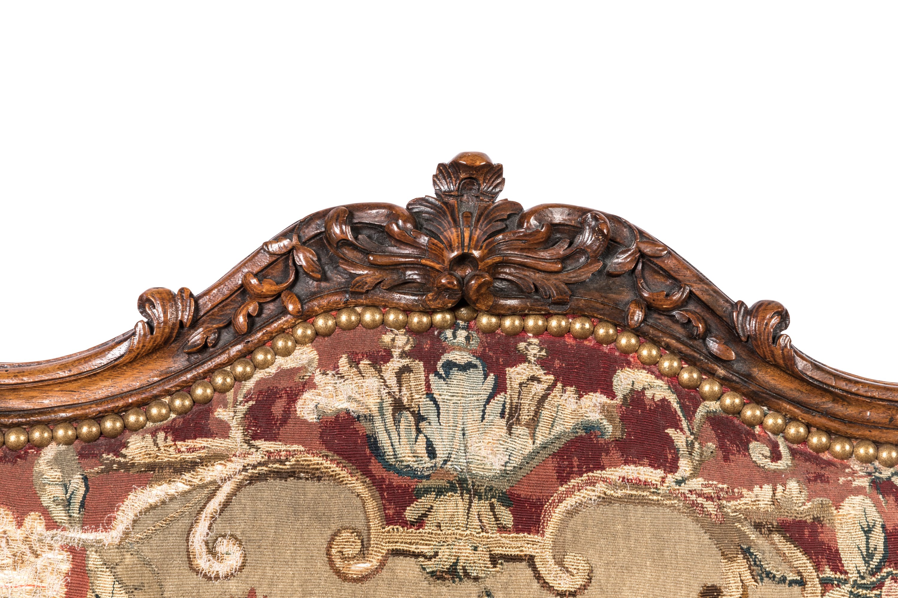 Two large 18th century walnut armchairs with flat backs attributed to Jean-Baptiste I Tilliard. Slightly different carvings and Aubusson upholstery. Early Louis XV rocaille style.