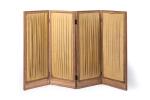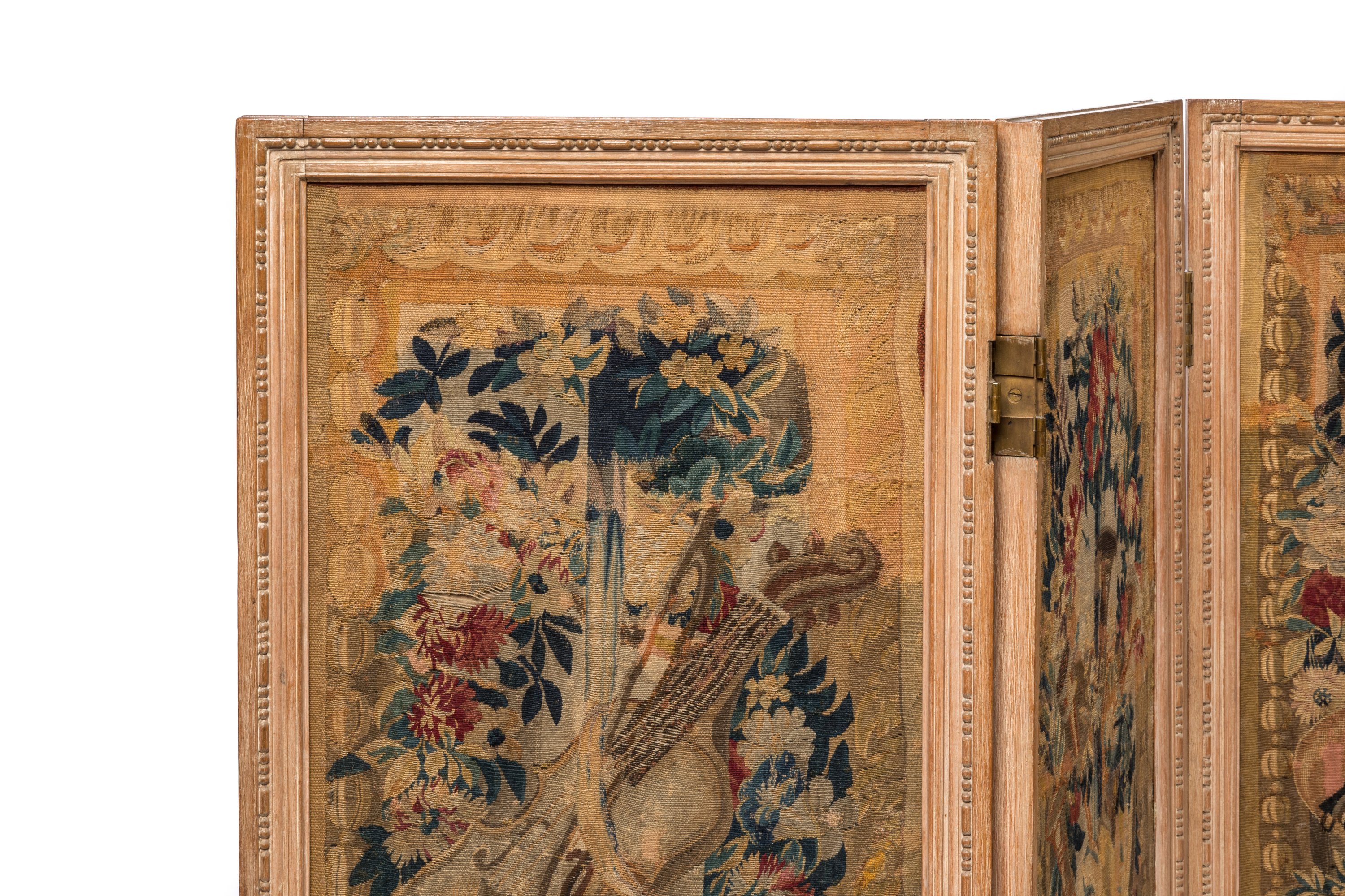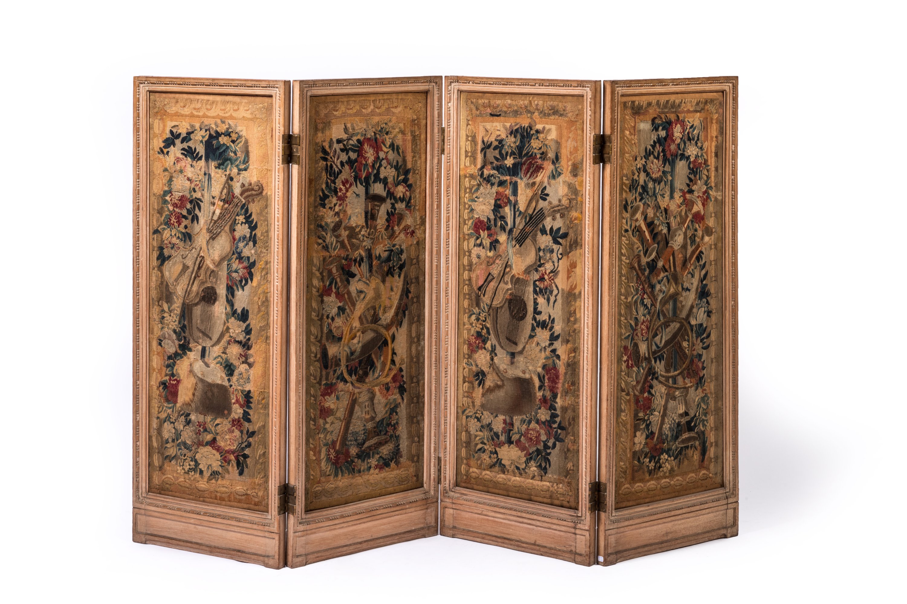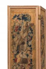 en tapisserie, laine et soie, fond crème, à décor polychrome de trophées de musique à cordes ou à vent, dans une guirlande de fleurs aux pavots, bordure d’un cadre figuré (usures, restauration). Les feuilles de tapisserie garnissent un châssis de paravent, de style Louis XVI, en bois mouluré et orné de rais de perles. Le dos du paravent est garni de feuilles de taffetas jaune plissé et bordé d’un galon.