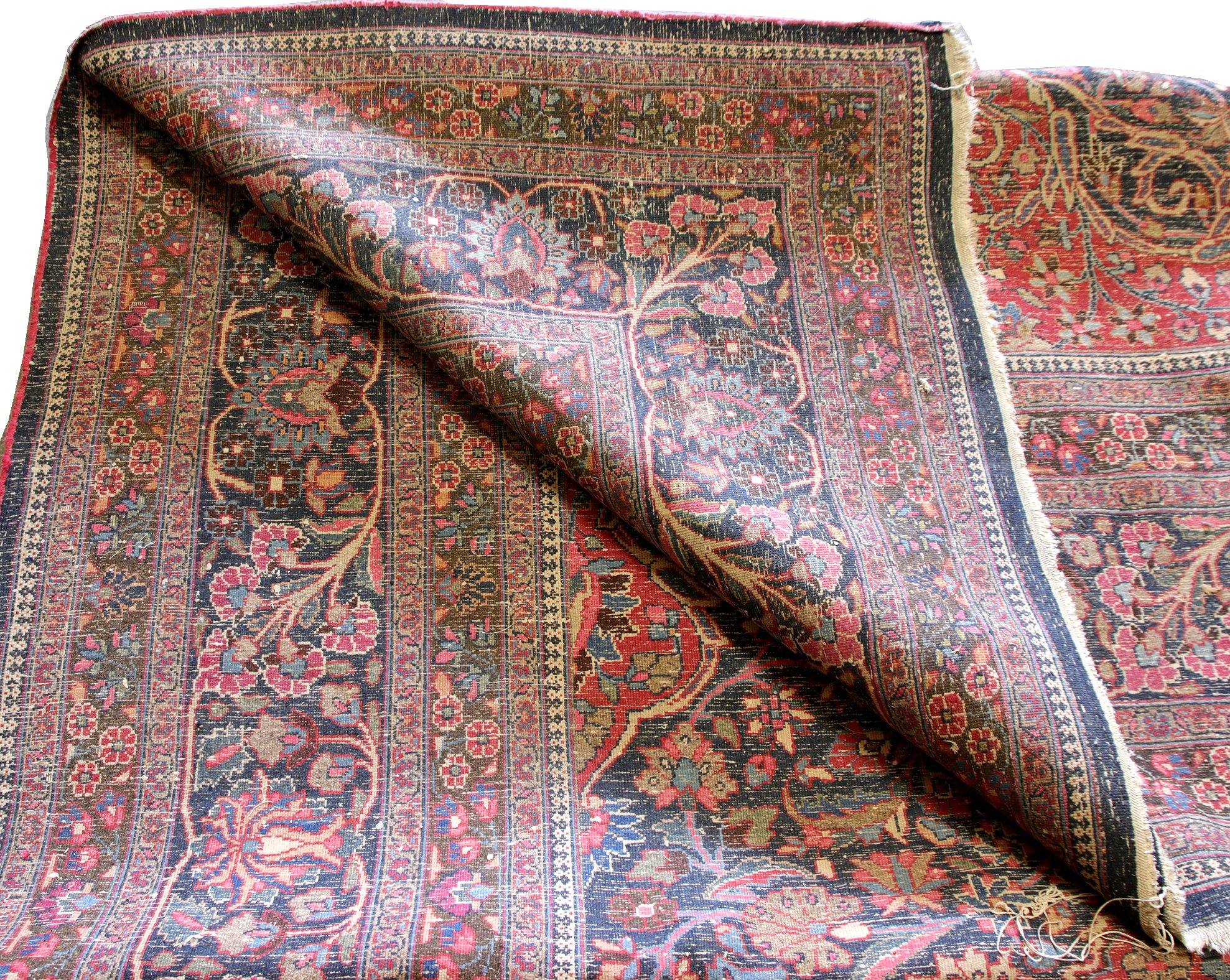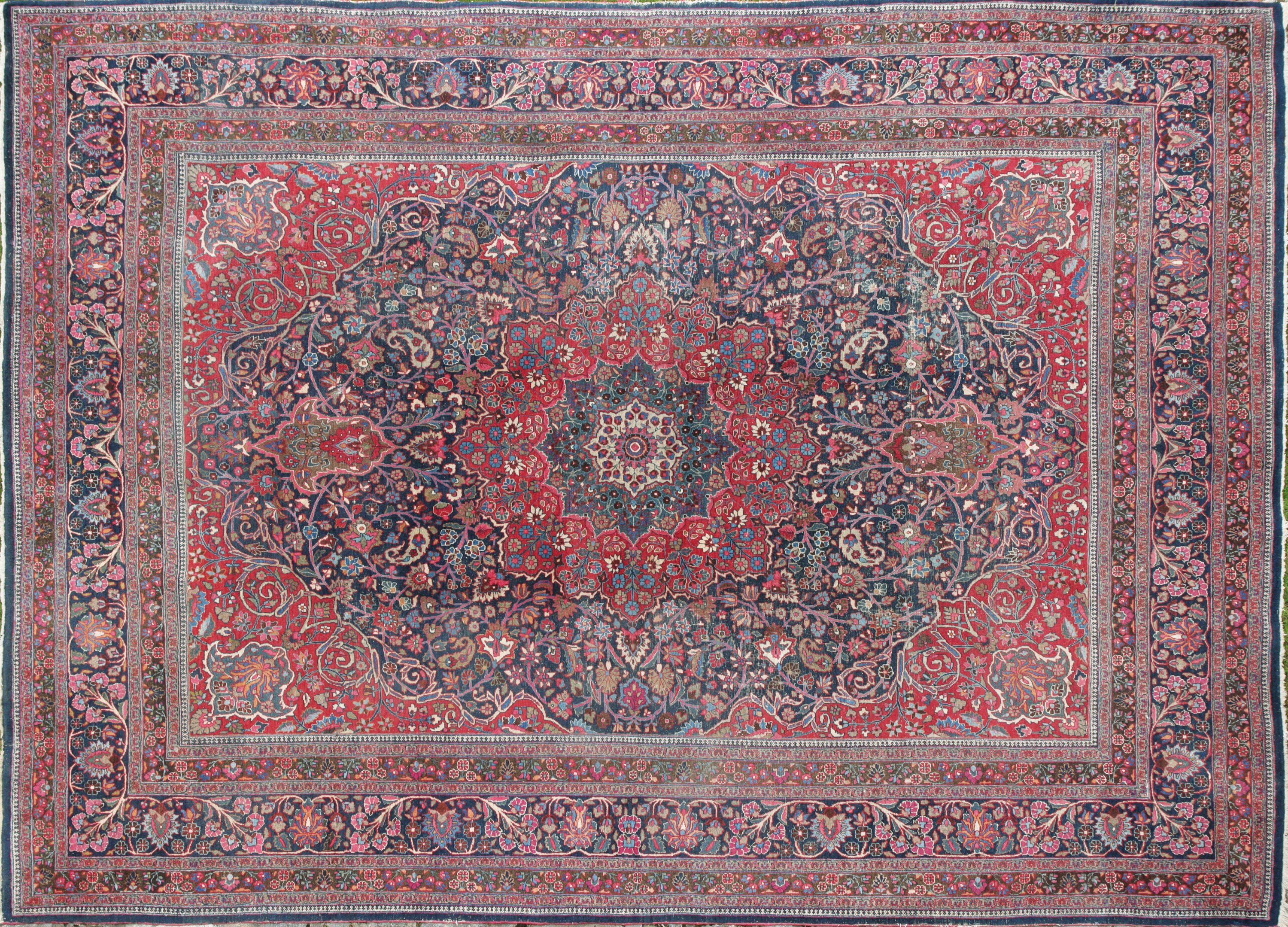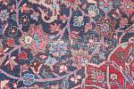 A Kashan (Persia) rug with a blue field and a design of scrolling flowers and palmettes surrounding an off-white, lilac and red medallion.