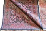 à fond bleu densément chargé de tiges enroulées avec fleurs et palmettes, autour dun médaillon crème, lilas et rouge, écoinçons rouges, bordure bleue de rinceaux de fleurs et palmes, entre des galons pistaches.
