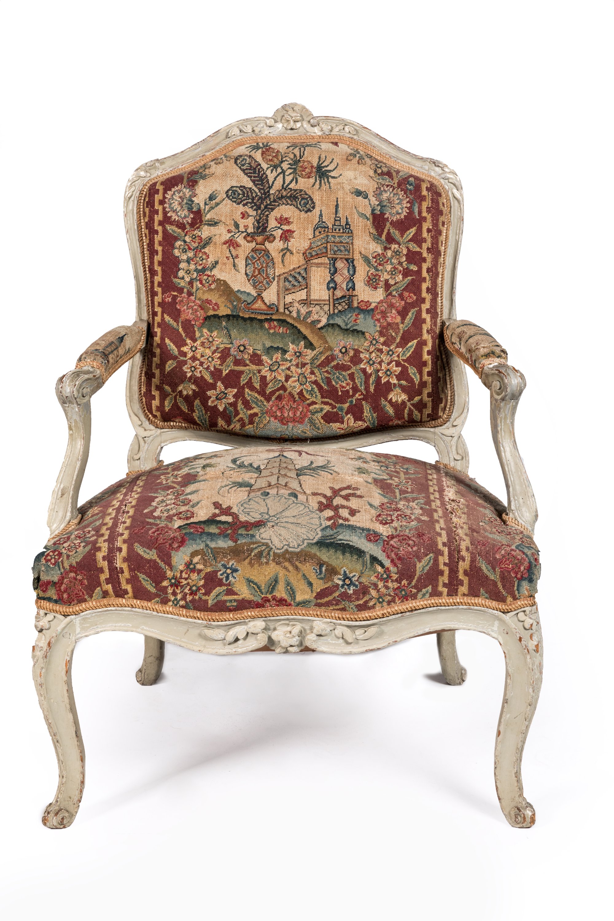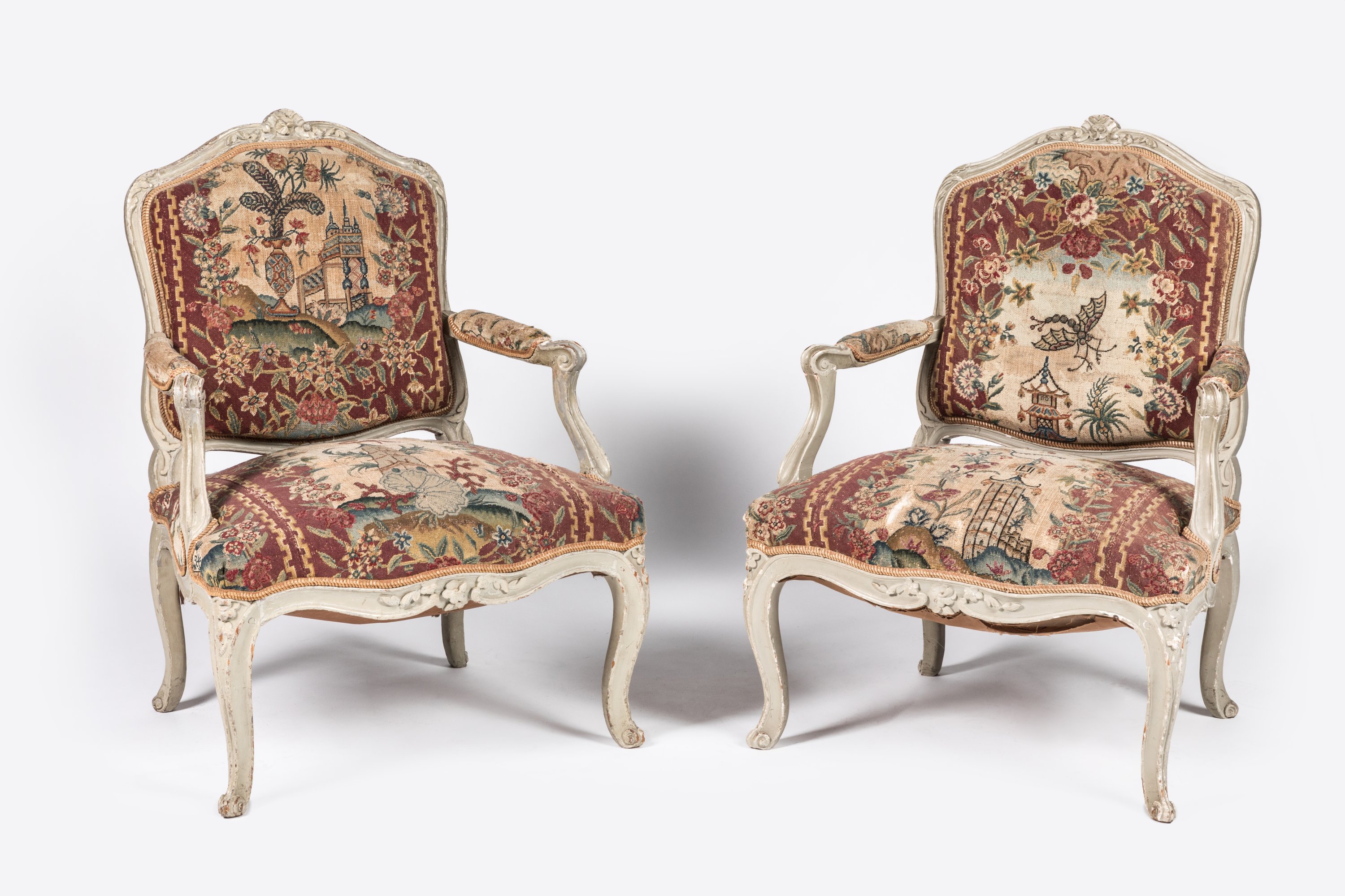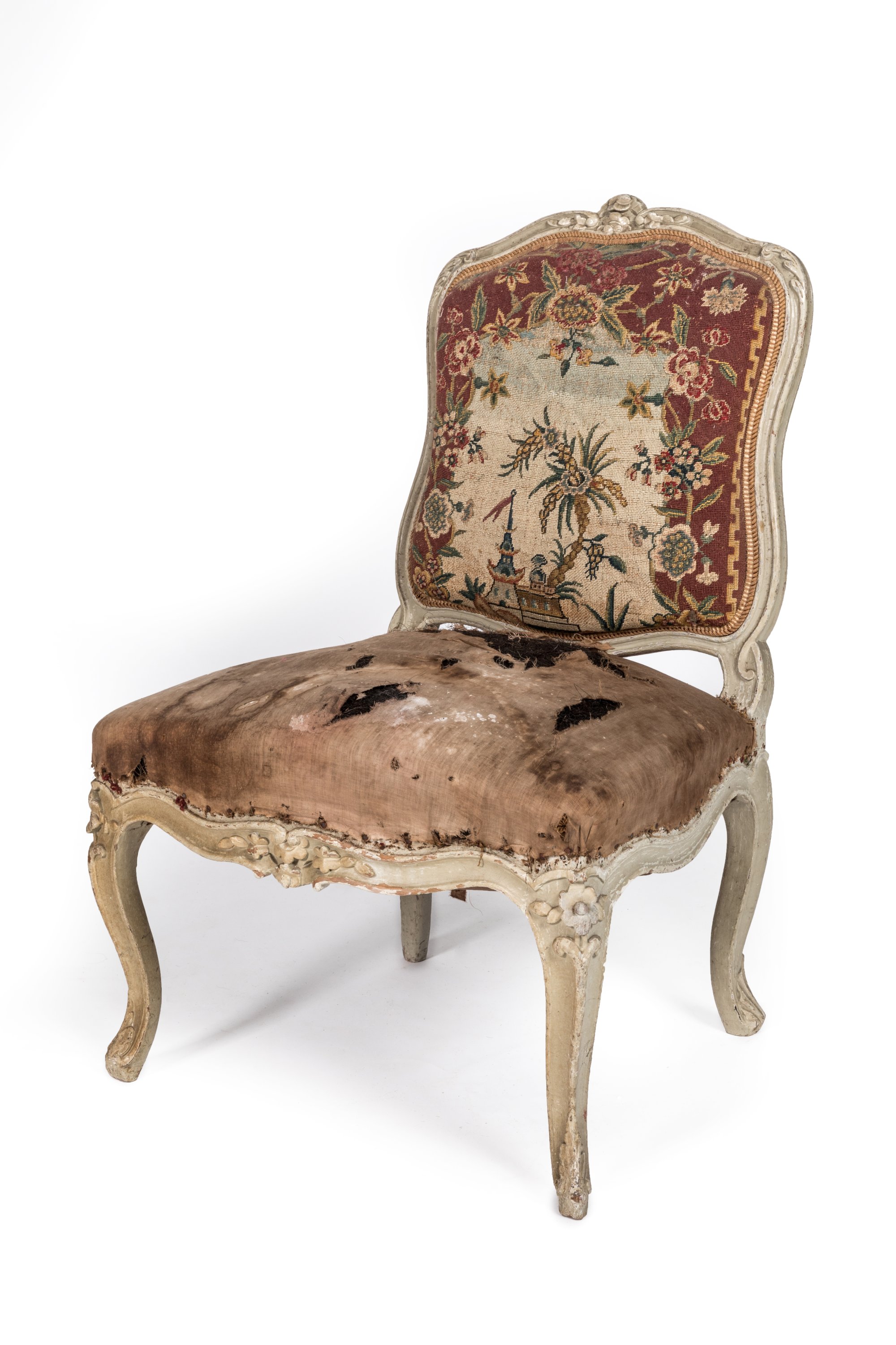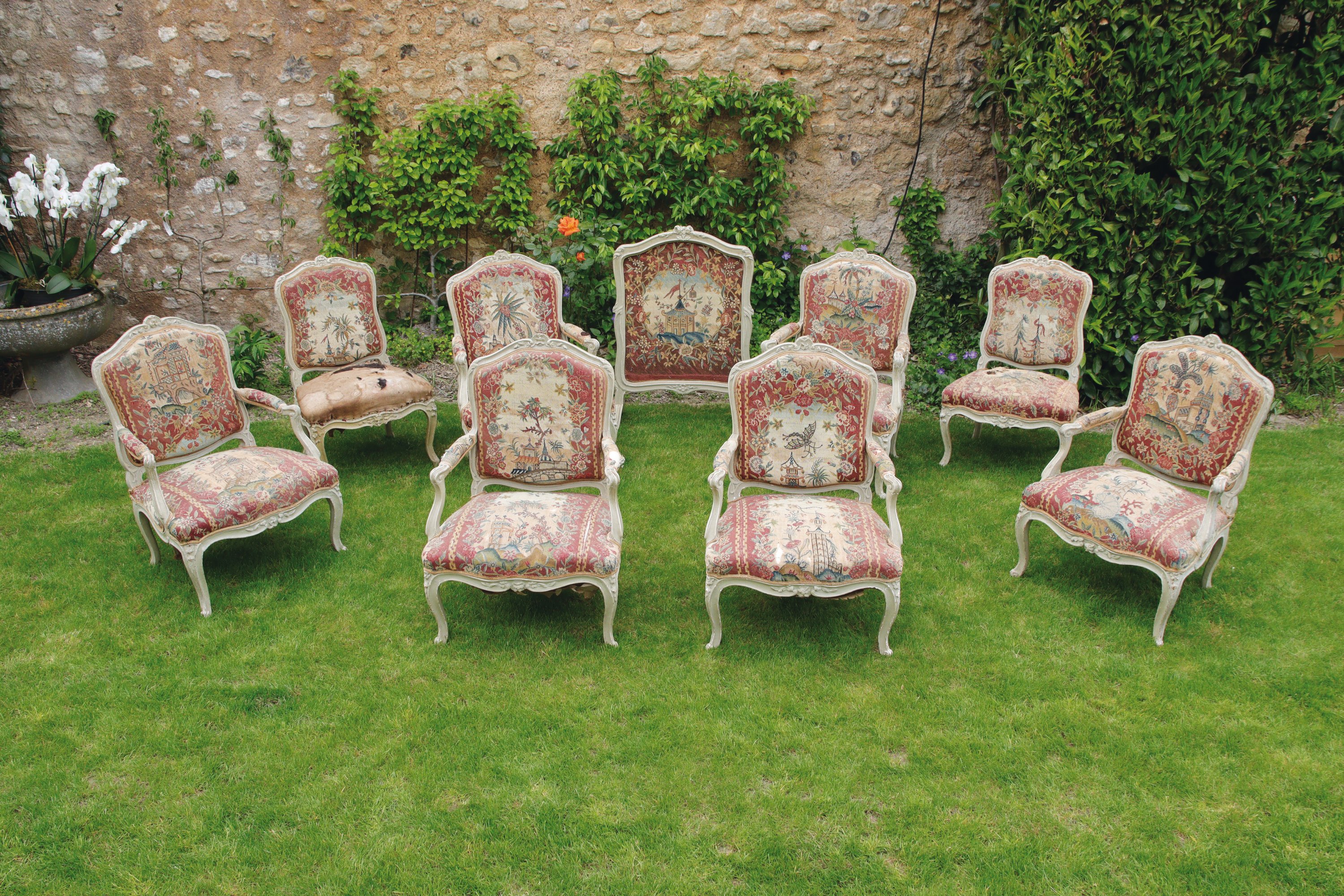 A rare 18th century set of six lacquered wood armchairs, two matching chairs and a fire screen by Jean Avisse and Claude-Louis Burgat. Stamped. Louis XV period.