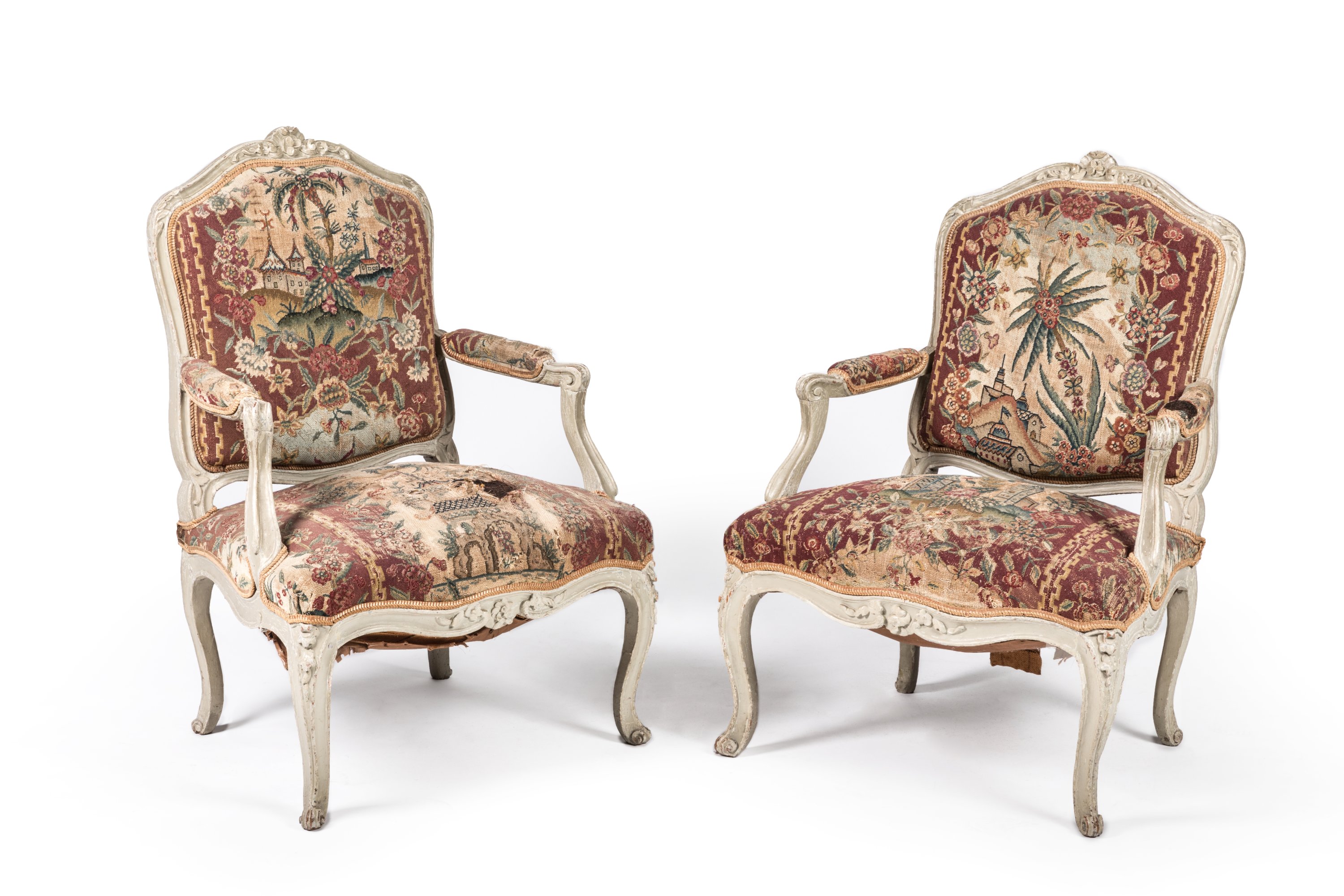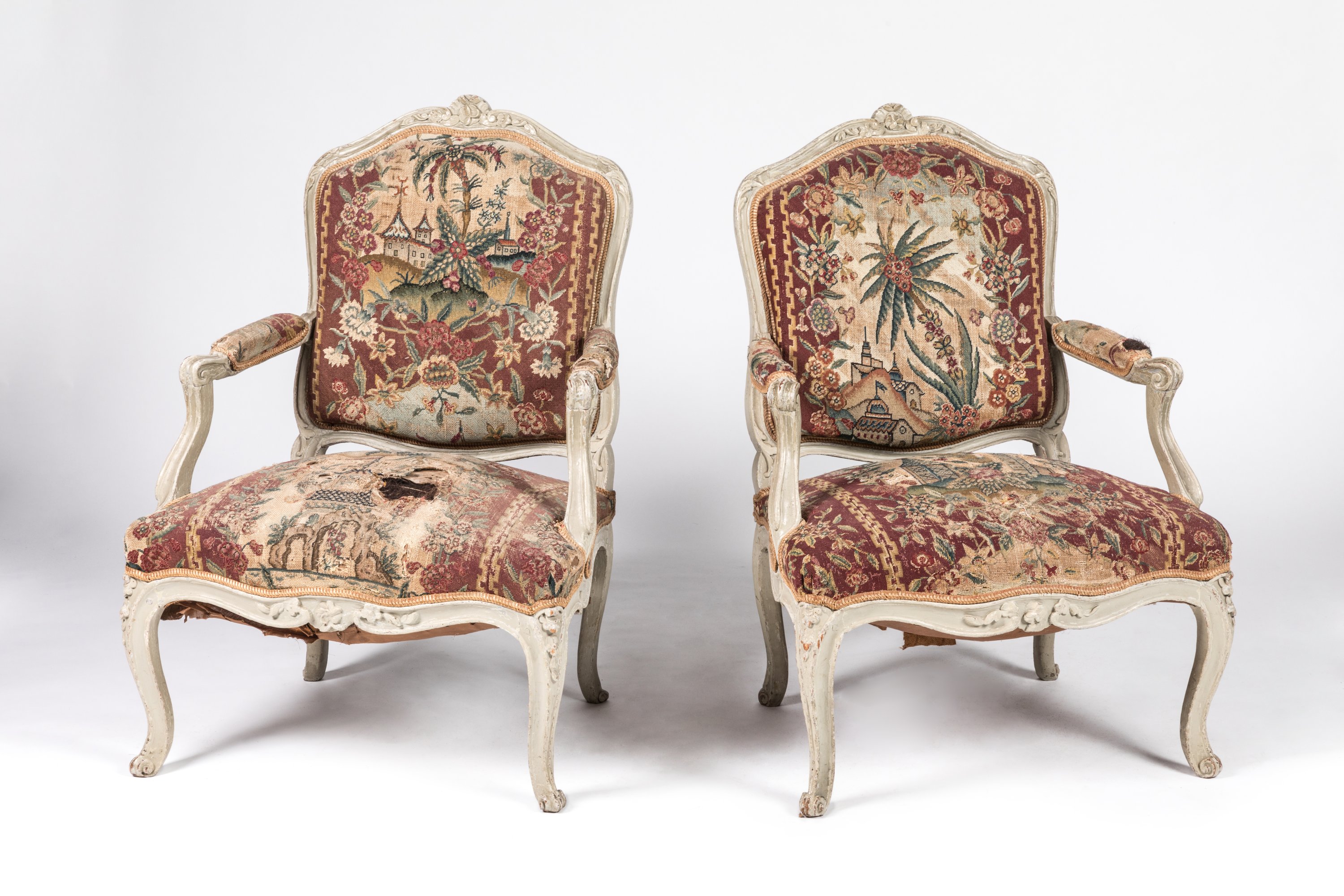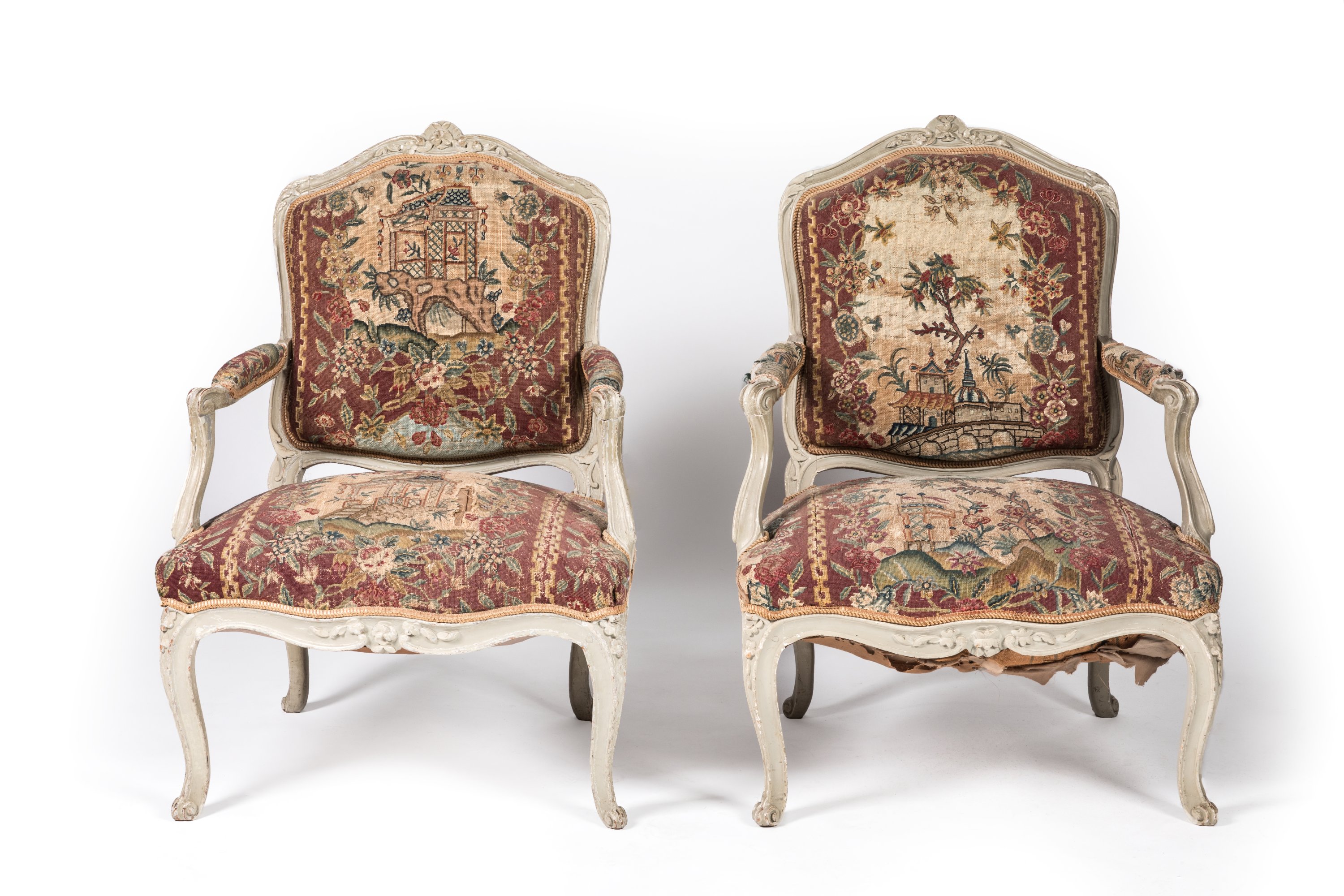 A rare 18th century set of six lacquered wood armchairs, two matching chairs and a fire screen by Jean Avisse and Claude-Louis Burgat. Stamped. Louis XV period.