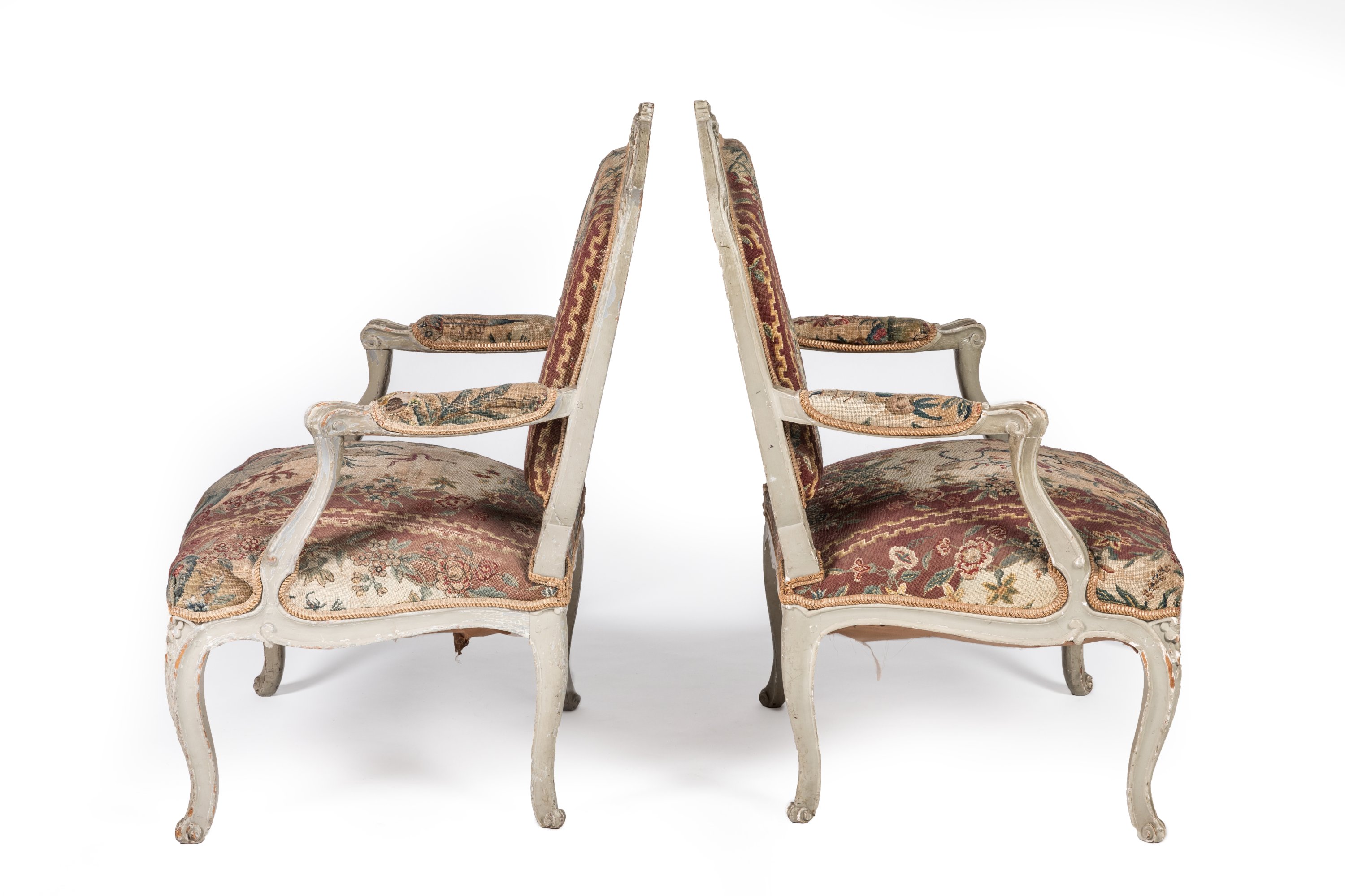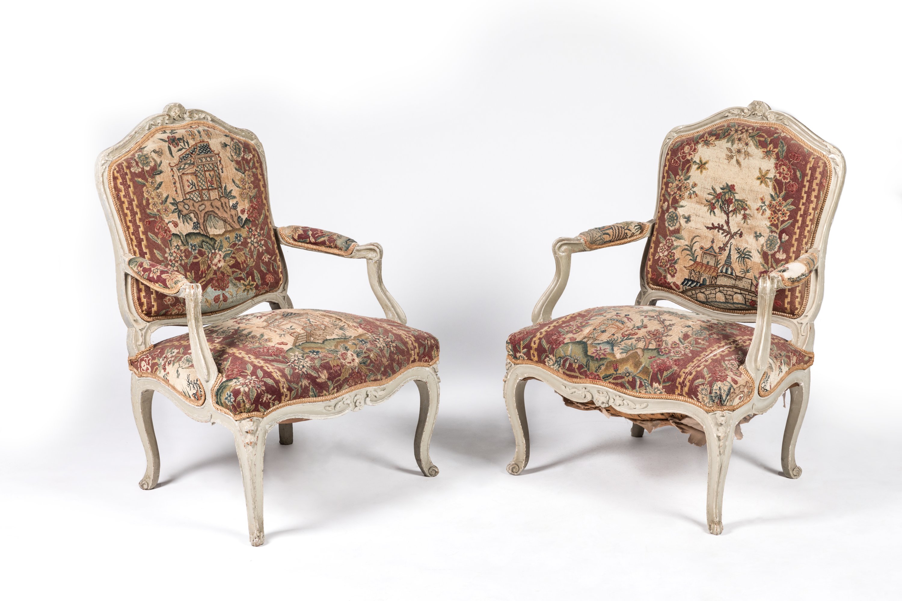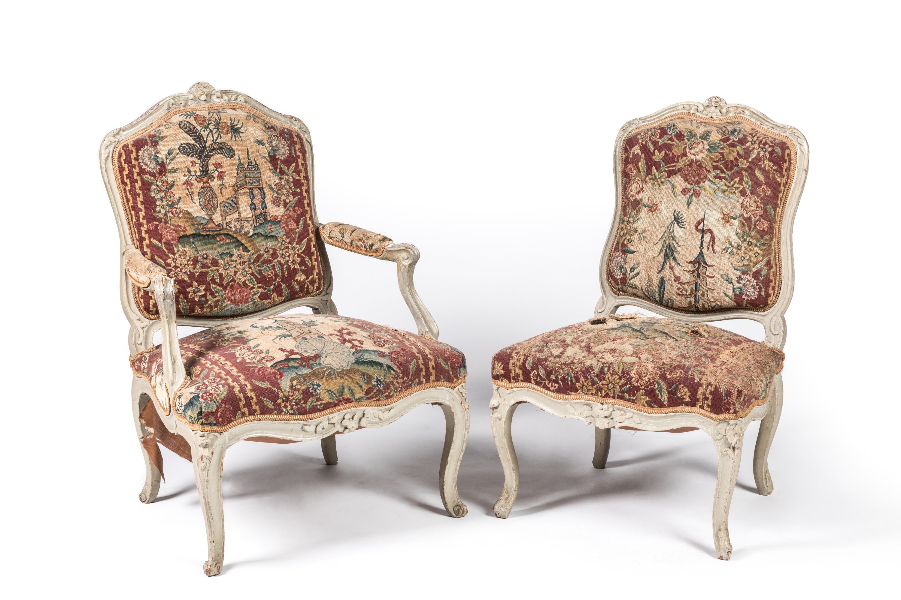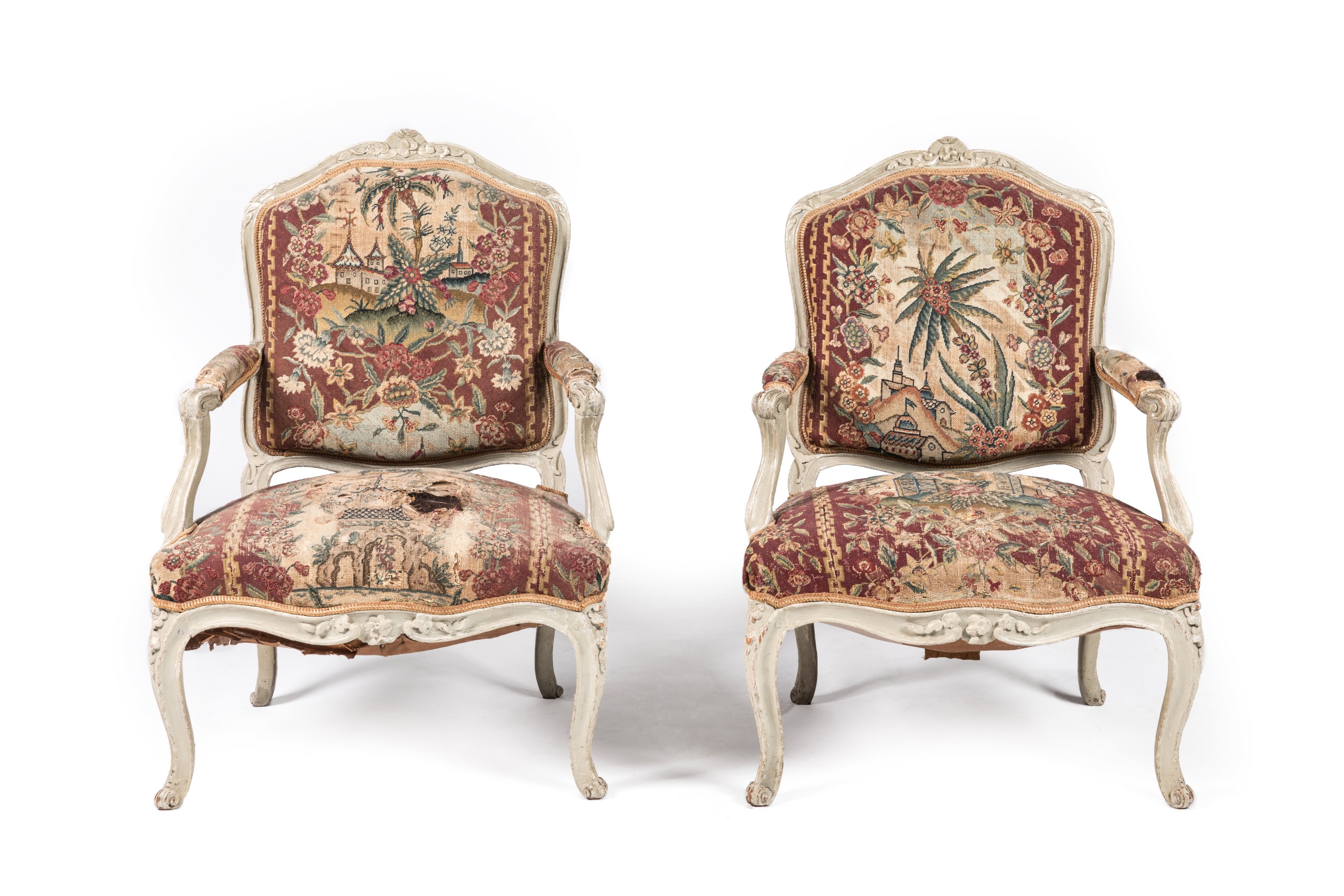A rare 18th century set of six lacquered wood armchairs, two matching chairs and a fire screen by Jean Avisse and Claude-Louis Burgat. Stamped. Louis XV period.