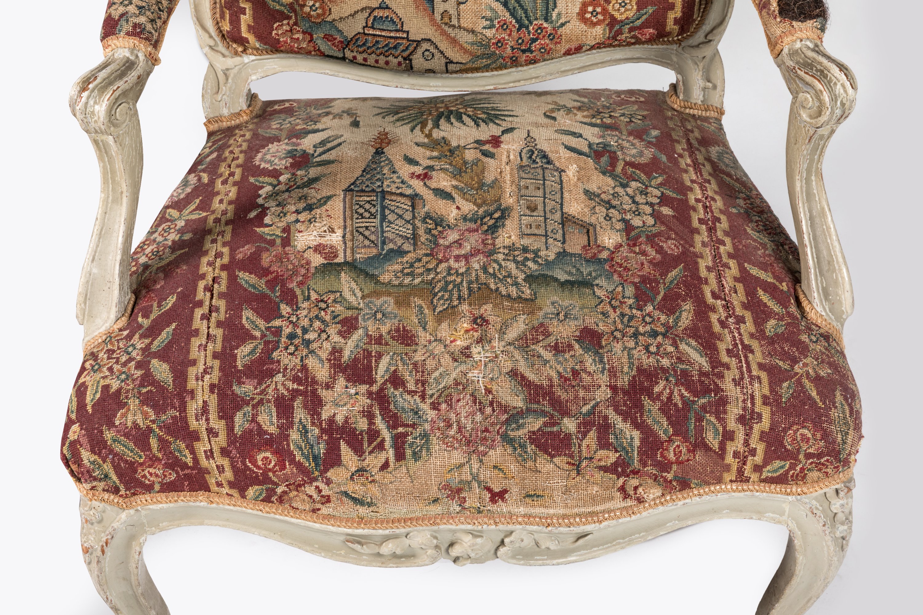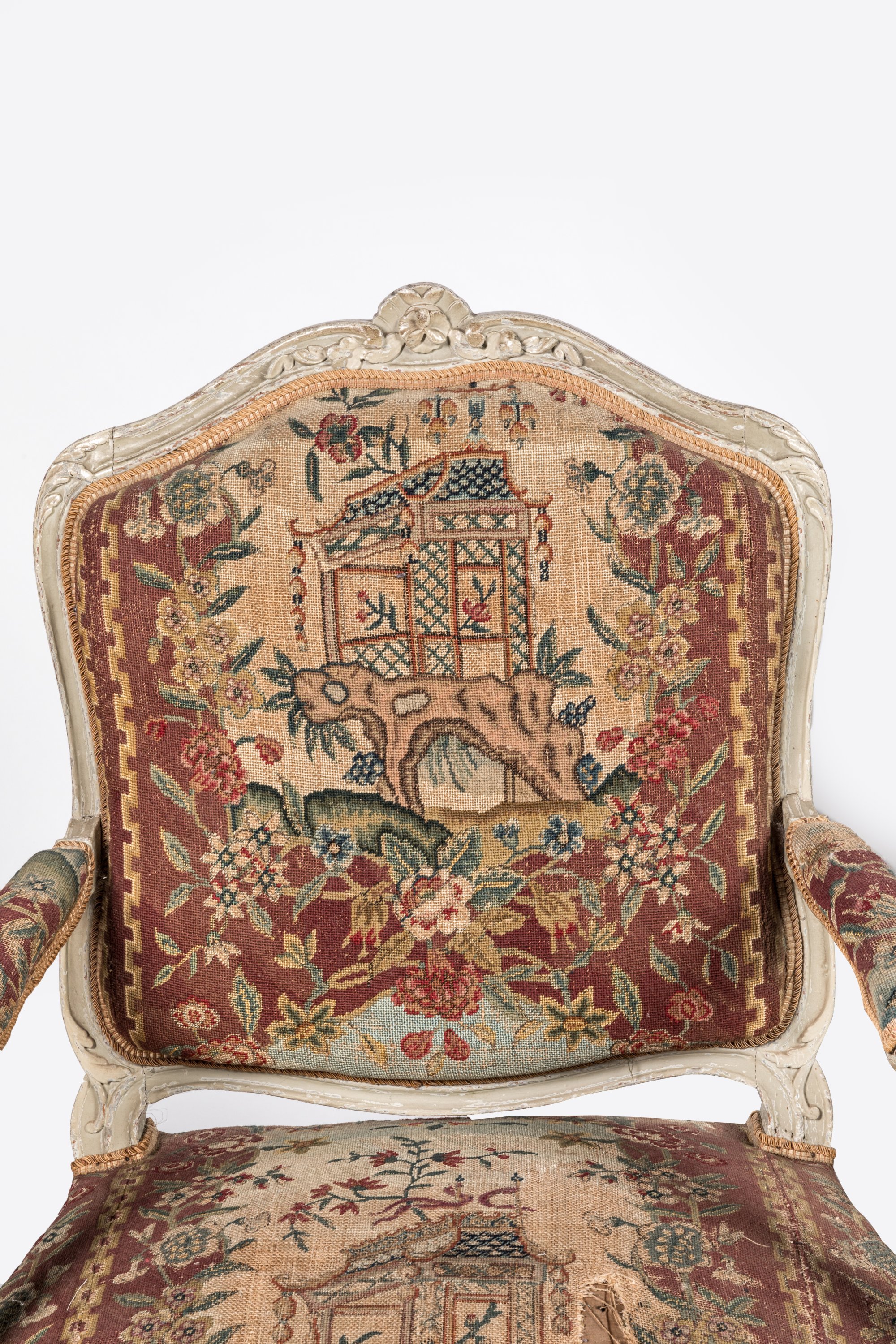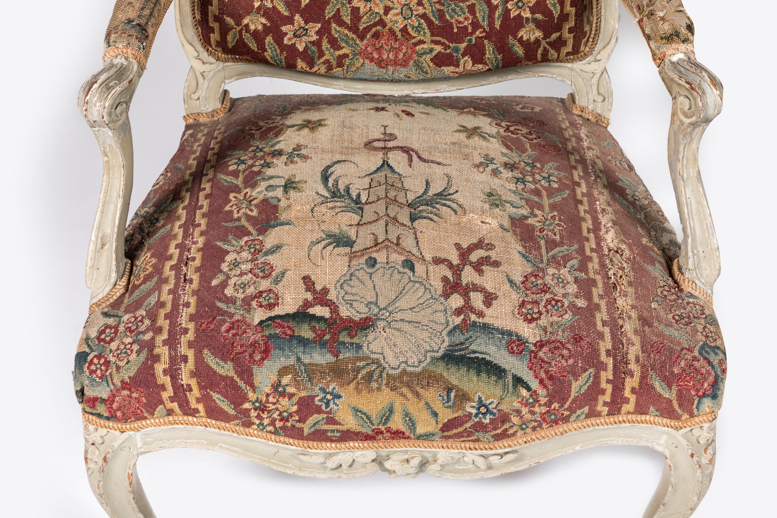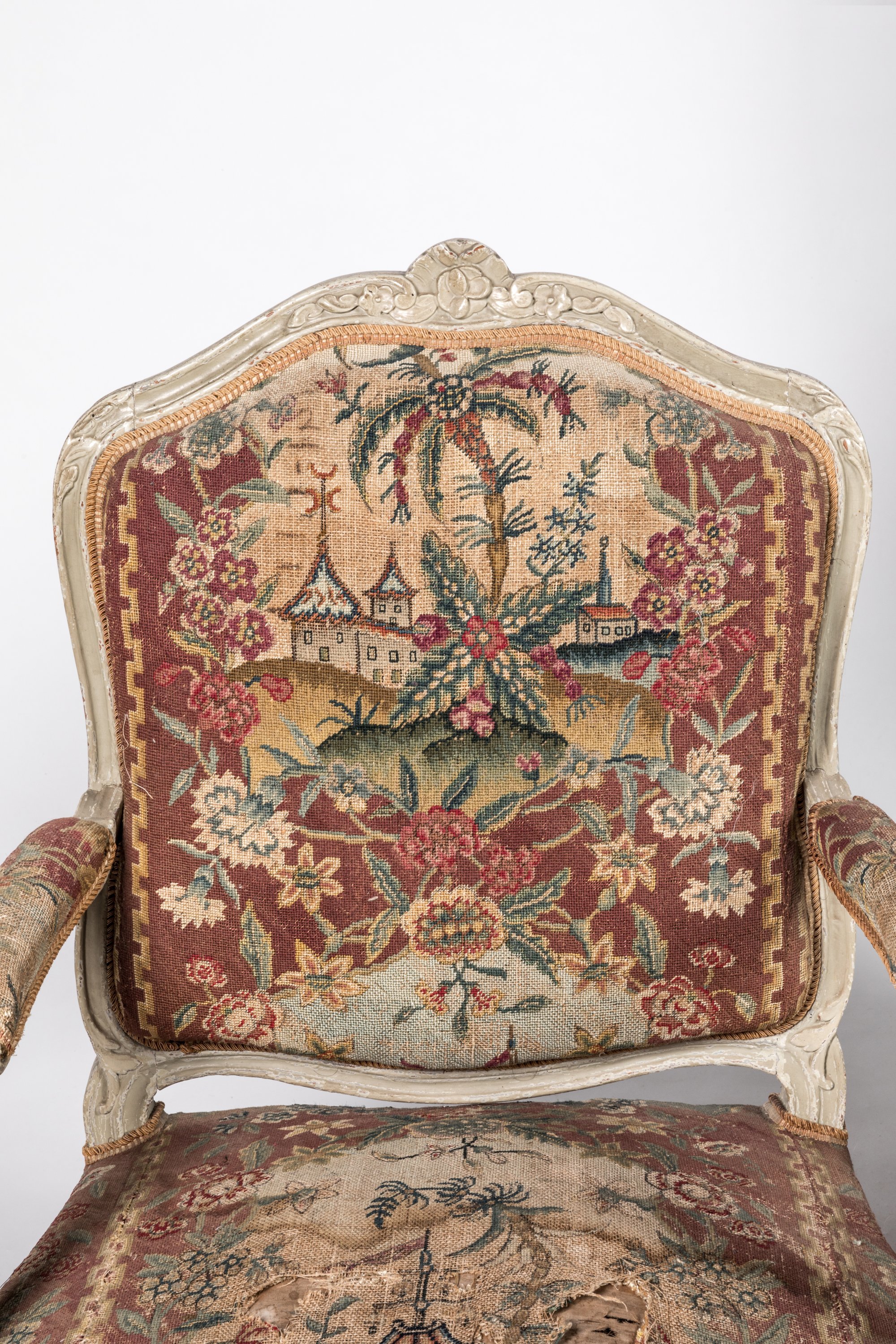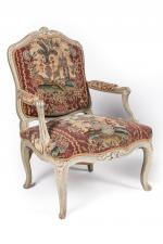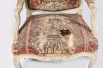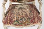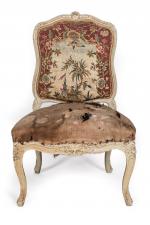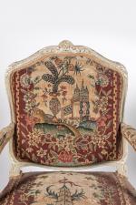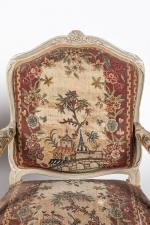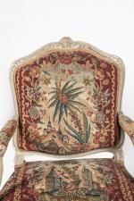 en bois mouluré, sculpté et re-laqué, composé de six fauteuils, deux chaises assorties et d'un écran de cheminée garnis d'une tapisserie au point au thème du Levant.