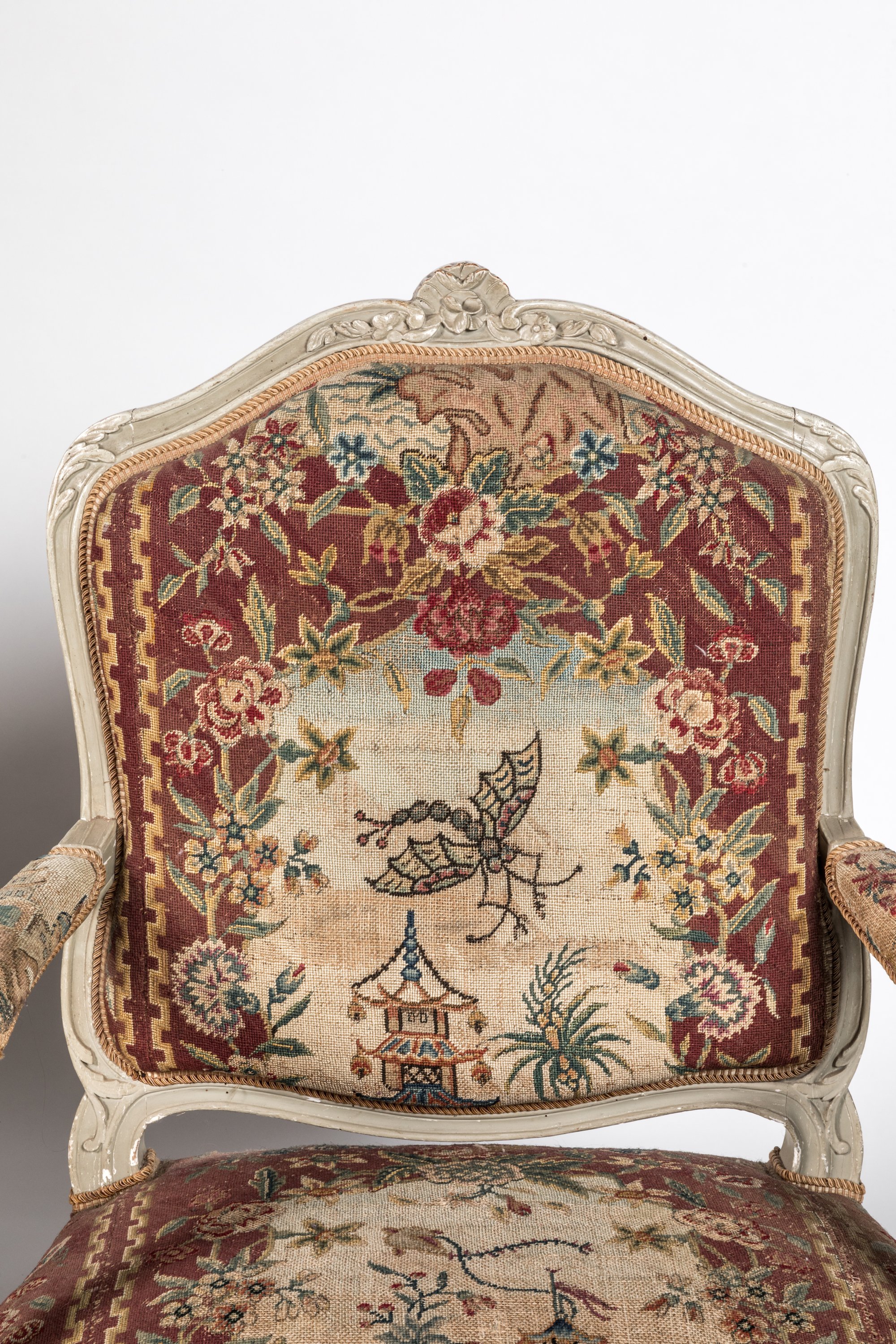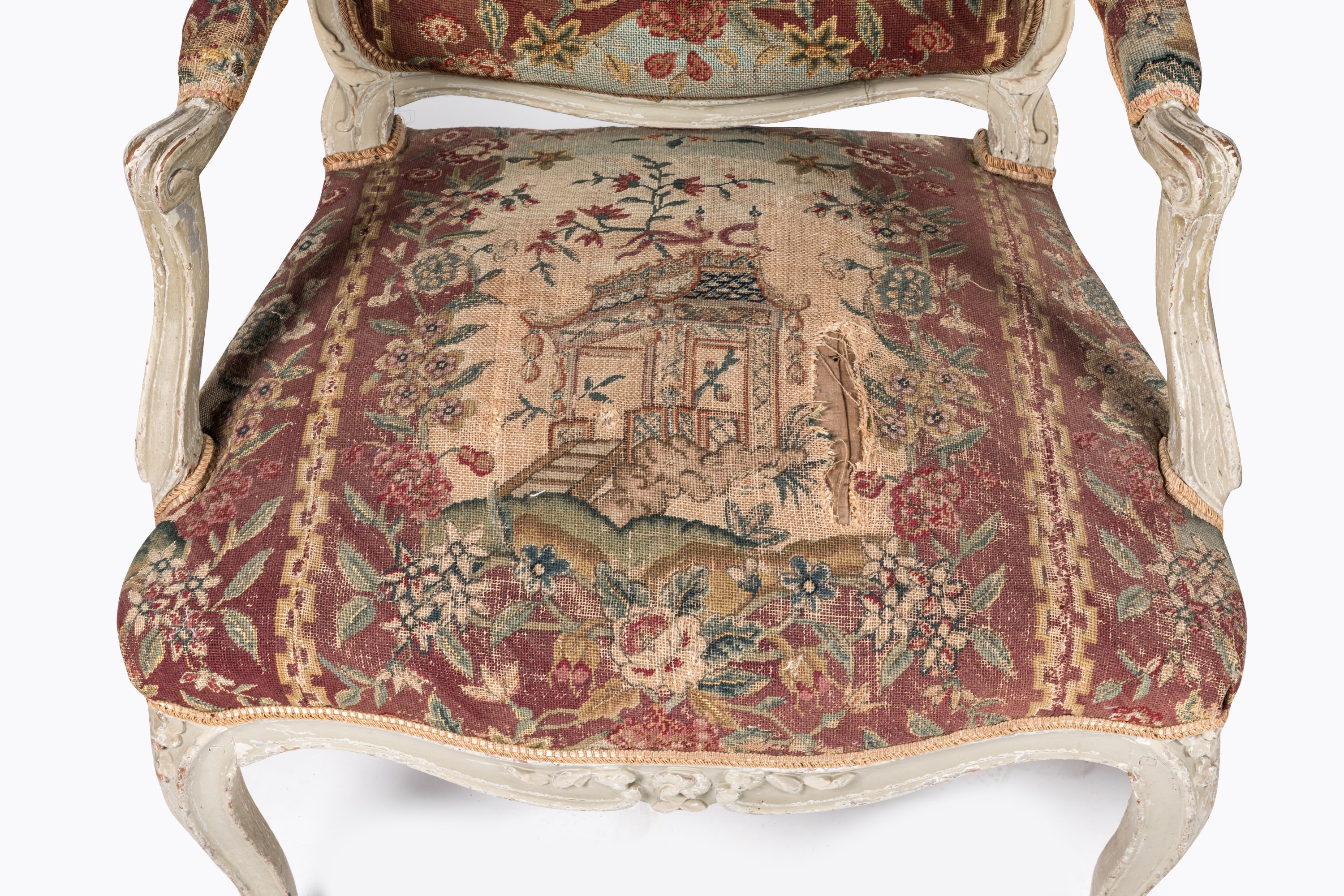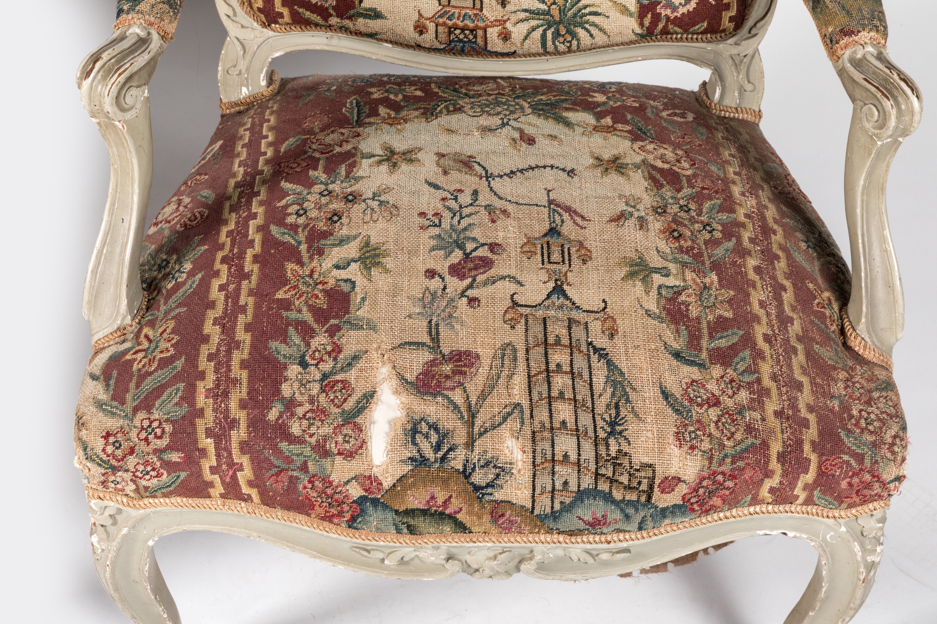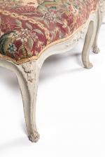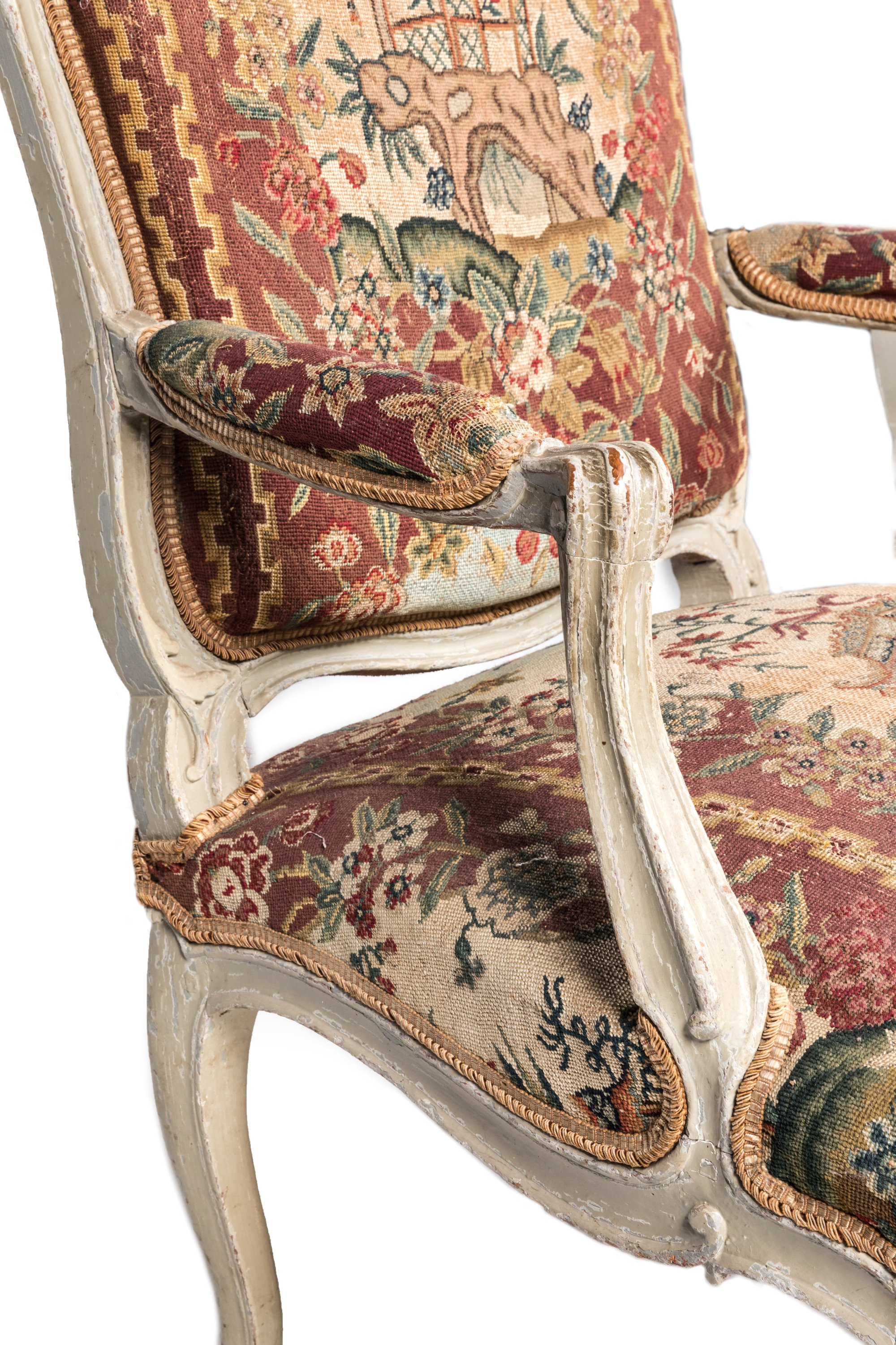 en bois mouluré, sculpté et re-laqué, composé de six fauteuils, deux chaises assorties et d'un écran de cheminée garnis d'une tapisserie au point au thème du Levant.