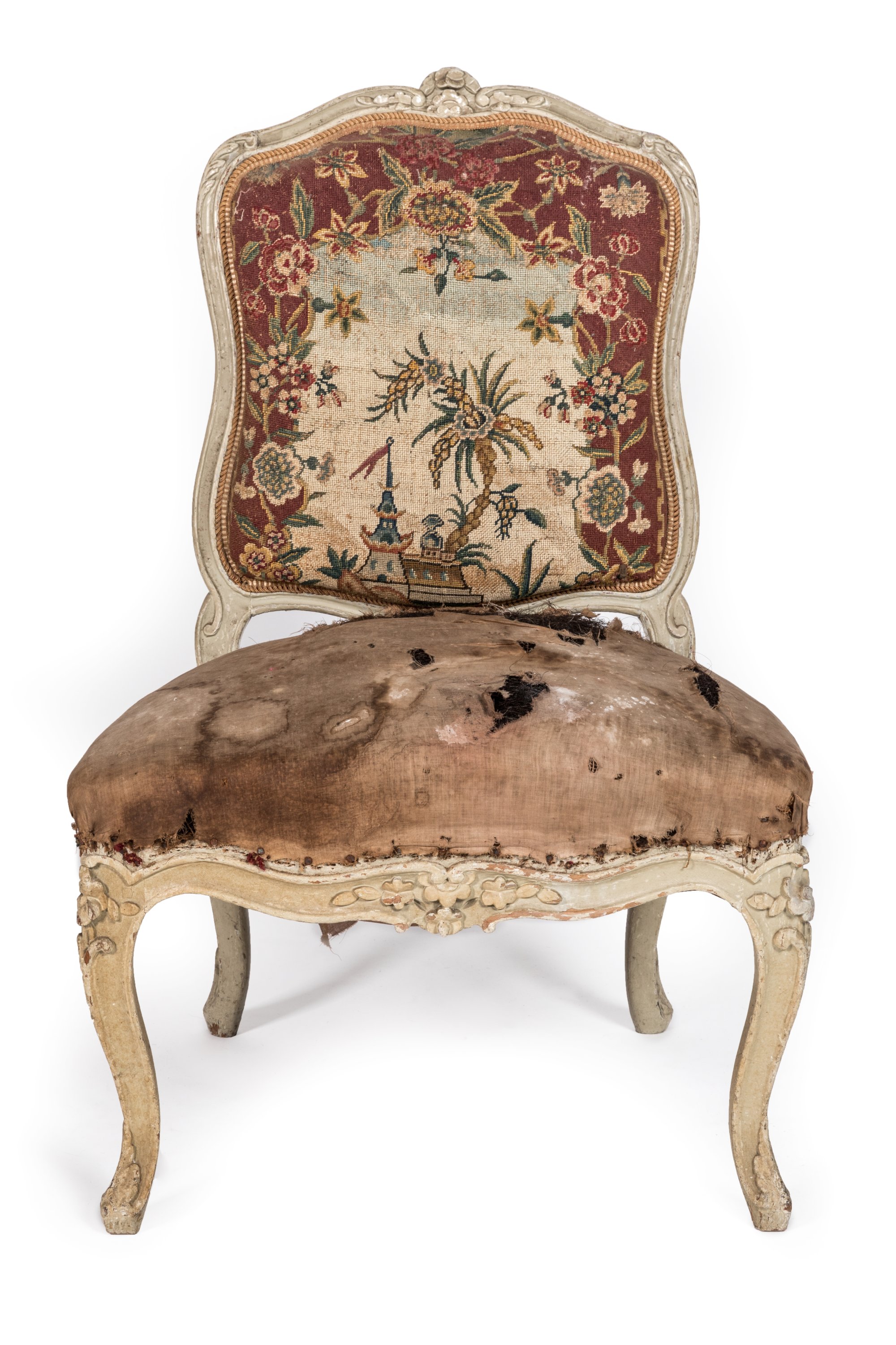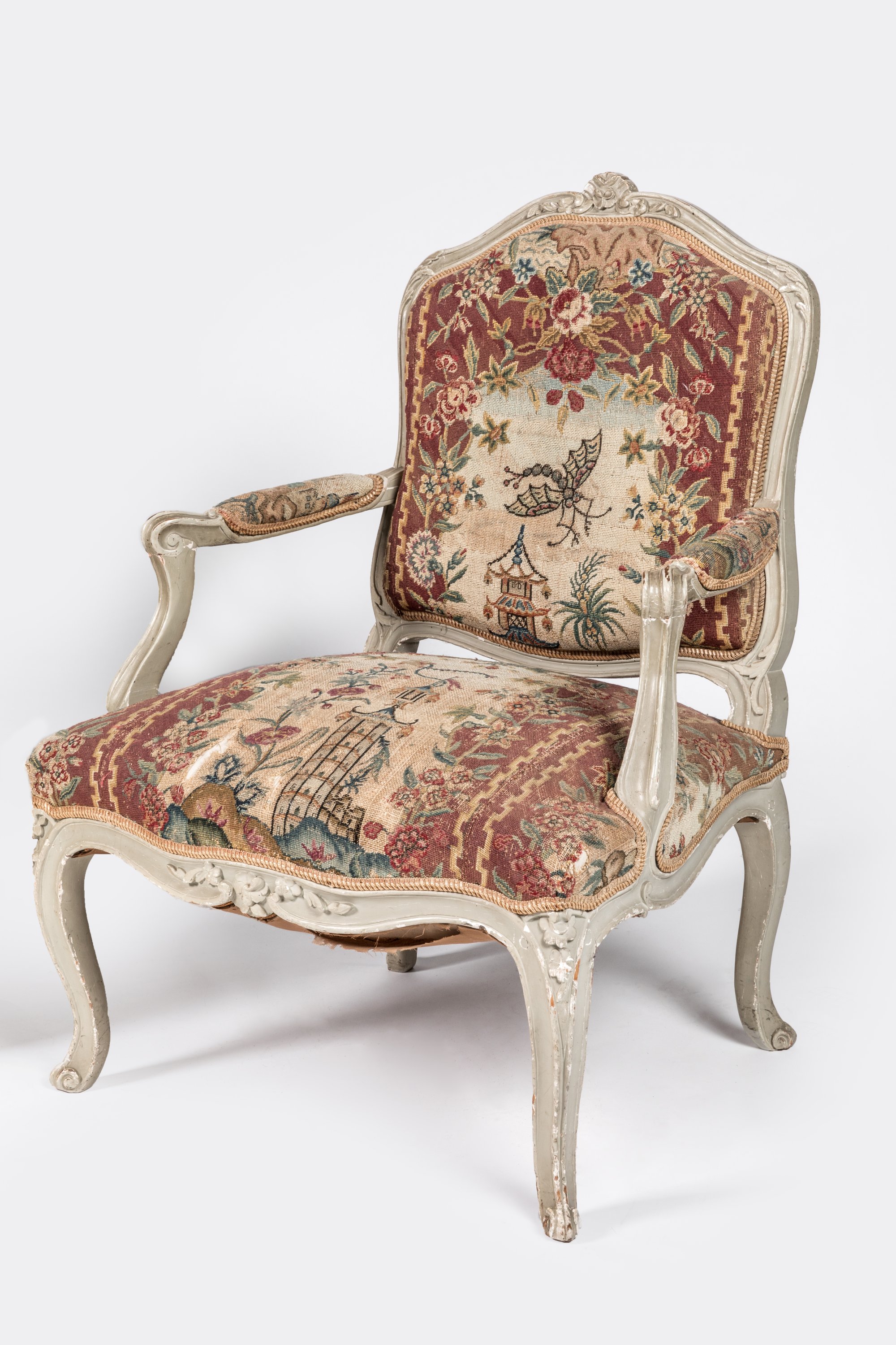 Les sièges aux dossiers droits dit "à la Reine" sculptés de bouquets et fleurs épanouies. Les dossiers chantournés à agrafes et les pieds cambrés à nervures. De légères variantes dans les sculptures florales des fauteuils et des chaises ne dépareillent pas un ensemble homogène.