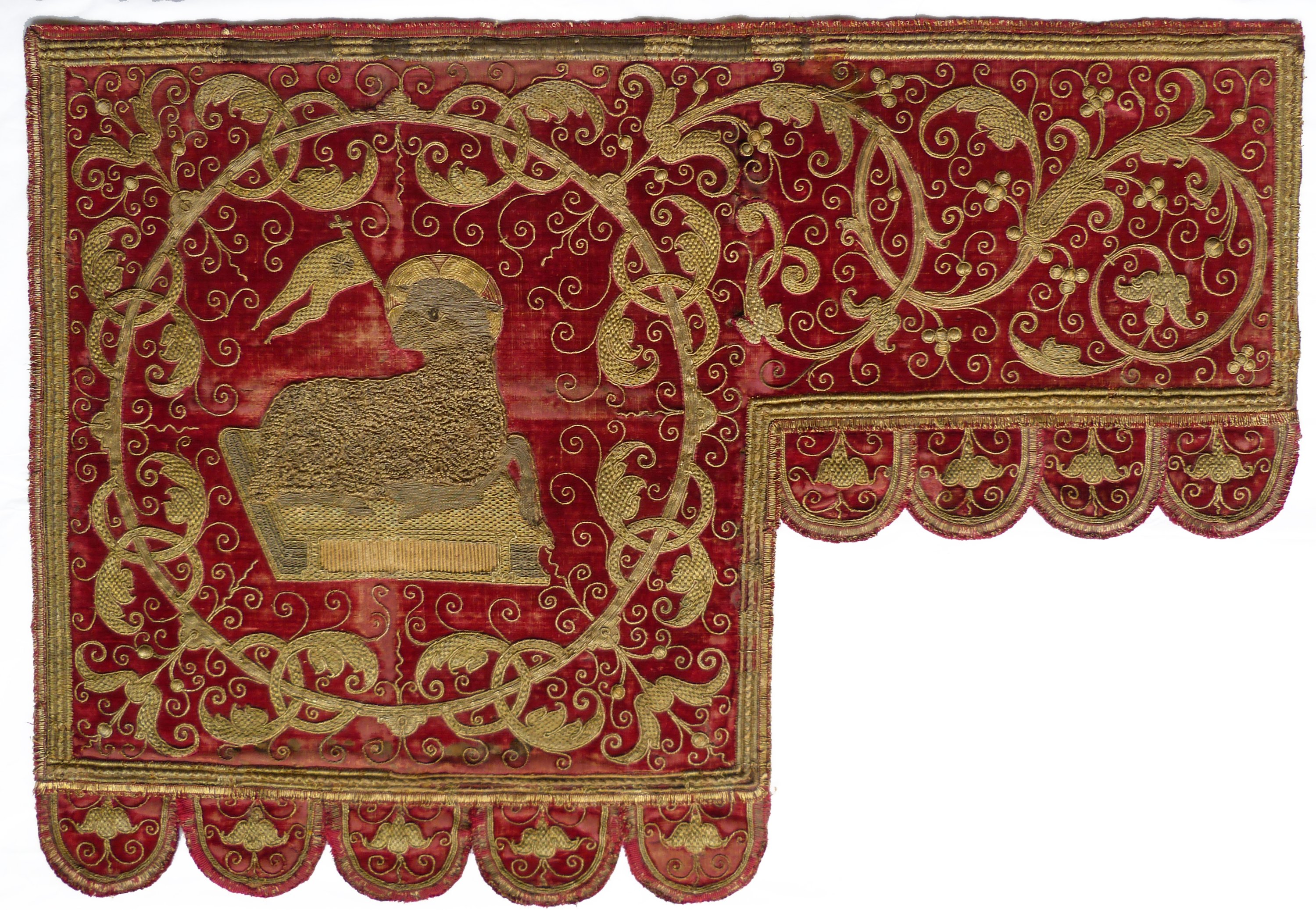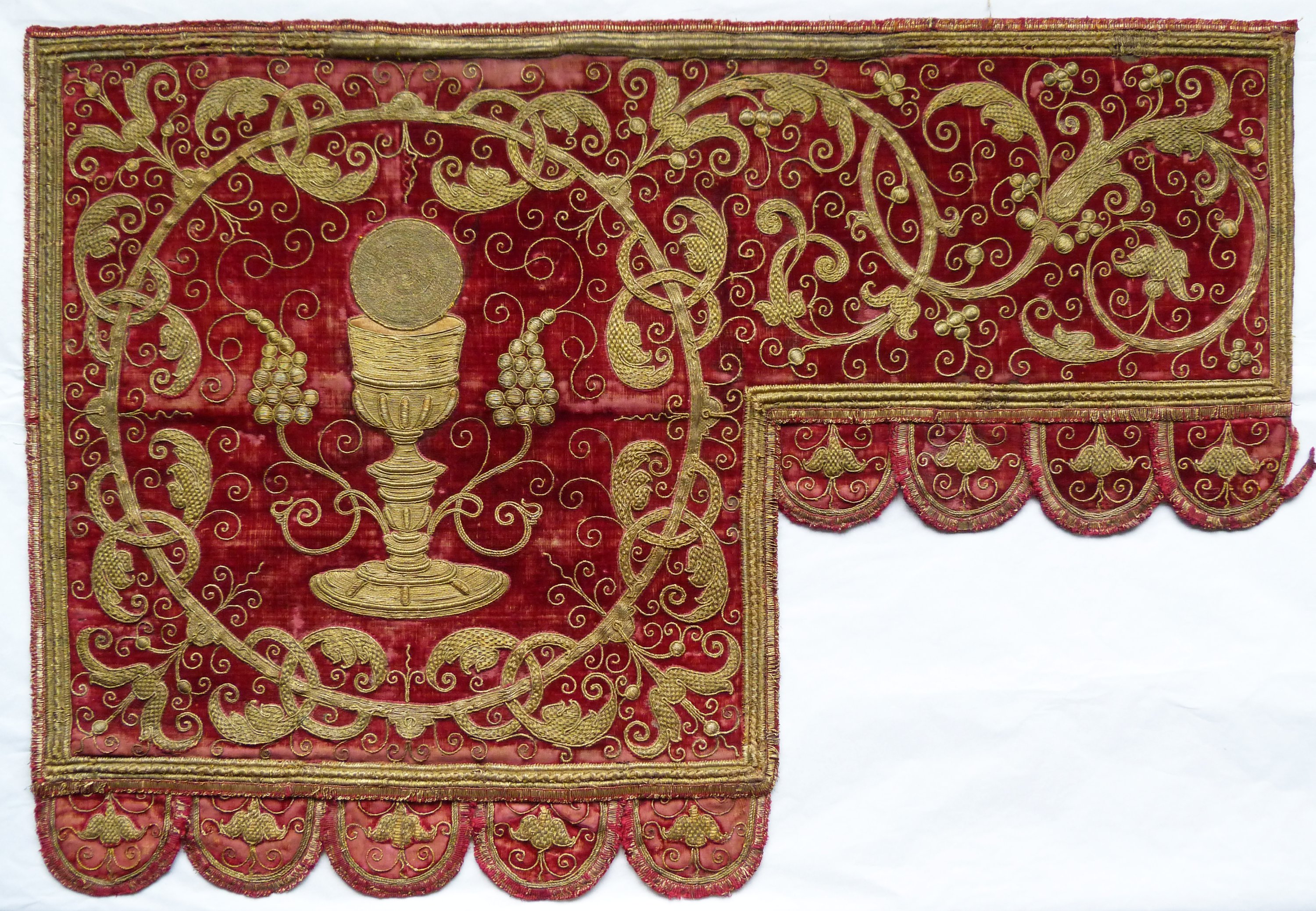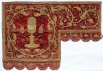 en broderie de filé or en couchure à plat et en relief sur corde sur velours rouge. Les motifs en couchure sont cernés et agrémentés dun cordonnet or, qui est aussi utilisé pour les volutes. Les bords des guidons et les lambrequins sont cernés dun galon ibérique pourpre et or.