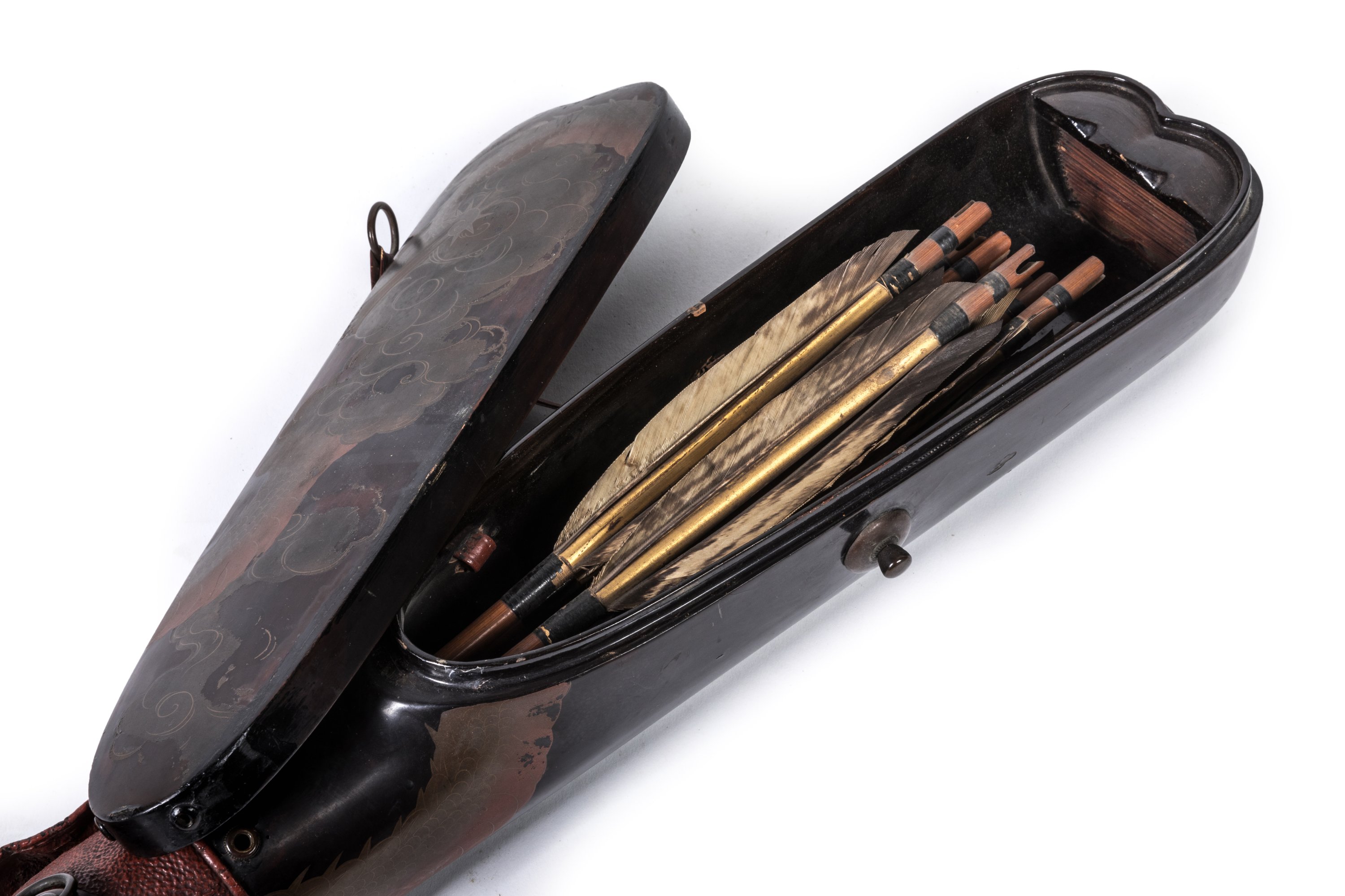 en laque noir à décor en hira maki-e et de laque or, argent et rouge d'un dragon parmi les nuages. Lanières en cuir laqué rouge. Comportant douze flèches en bambou et plumes.