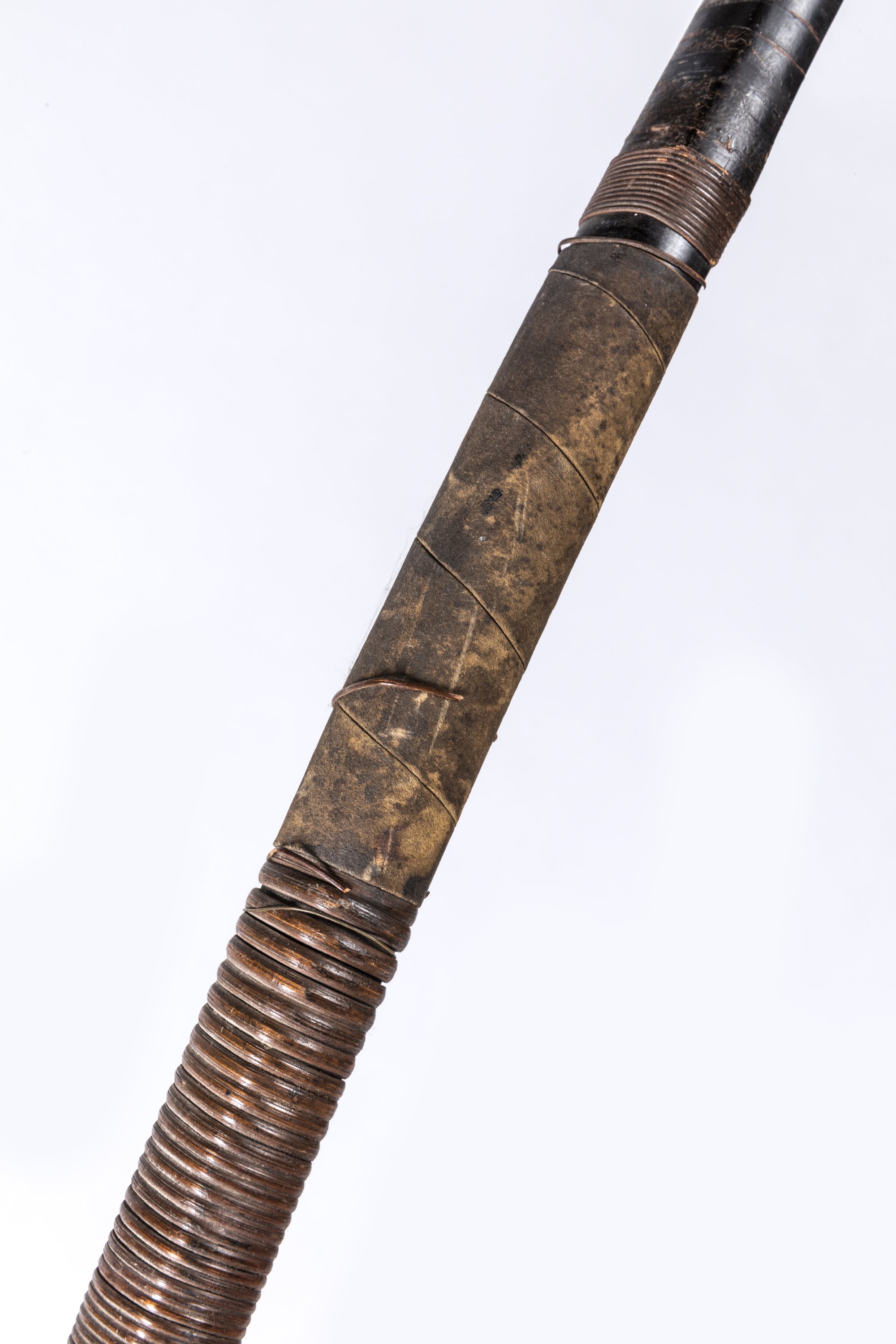 A Japanese, late Edo period, bow and lacquered arrow quiver (utsubo) containing twelve arrows fletched with feathers.