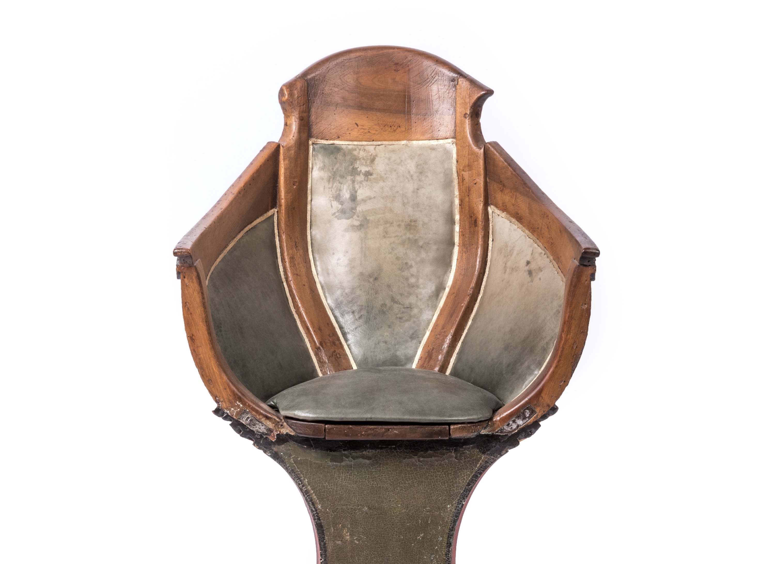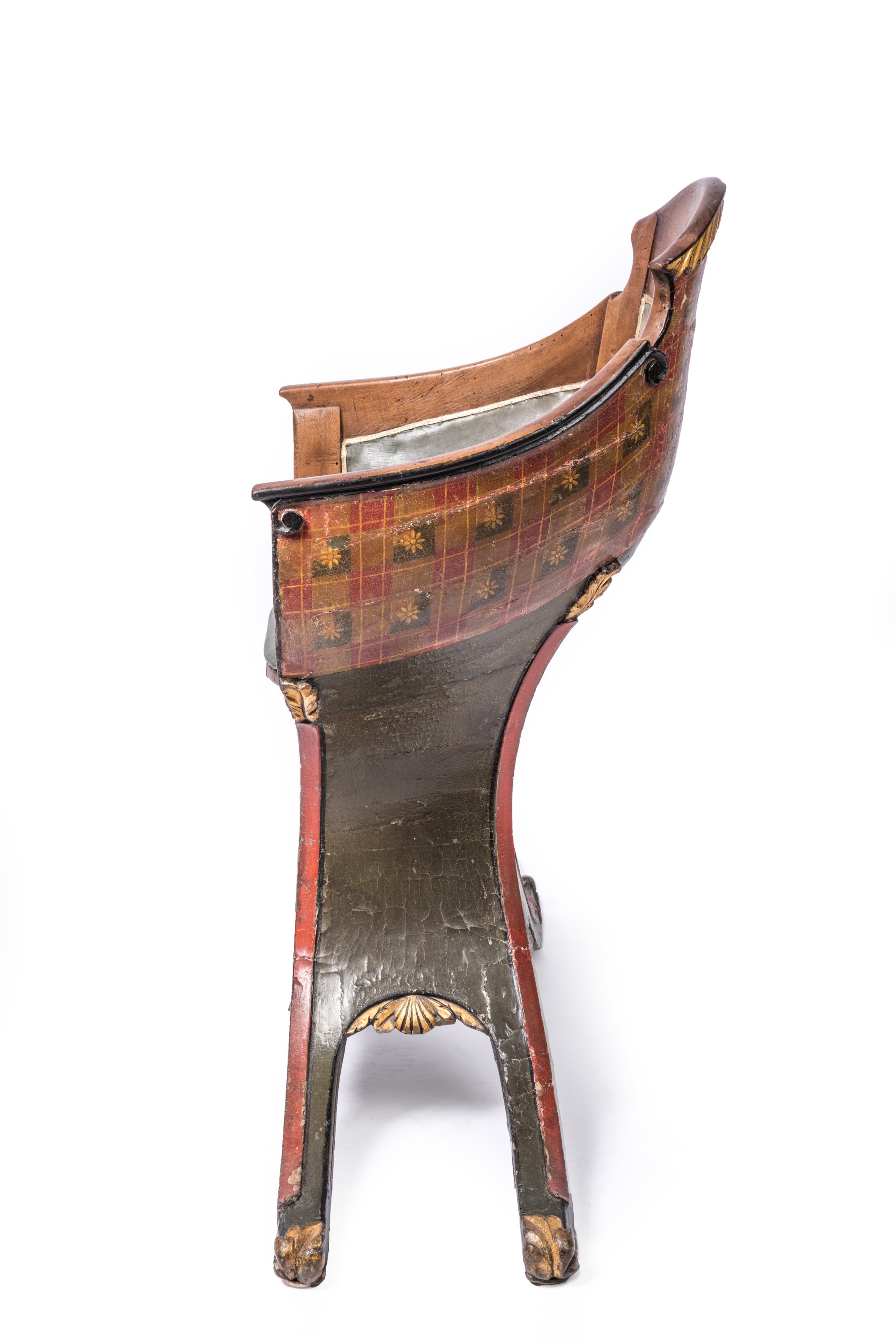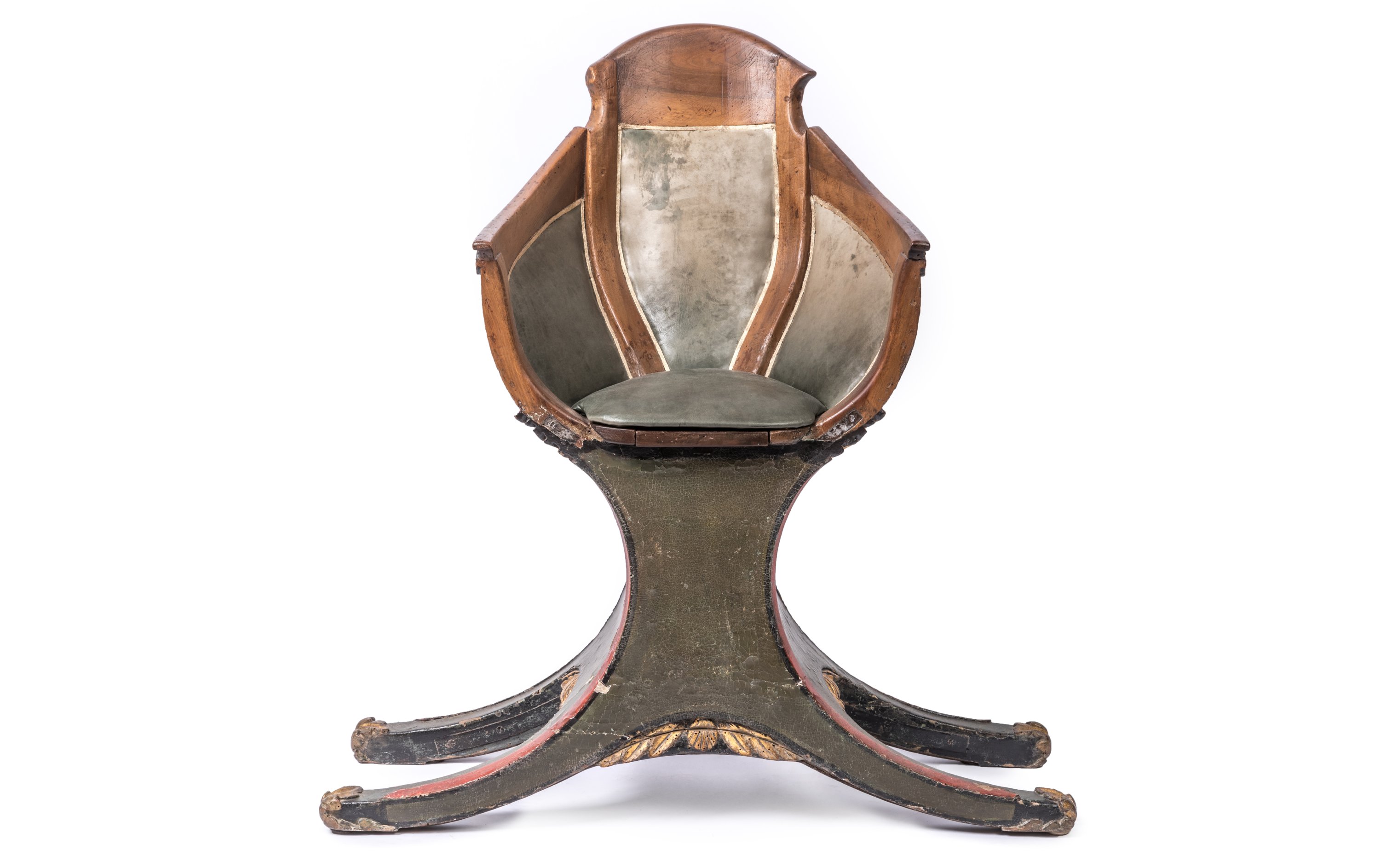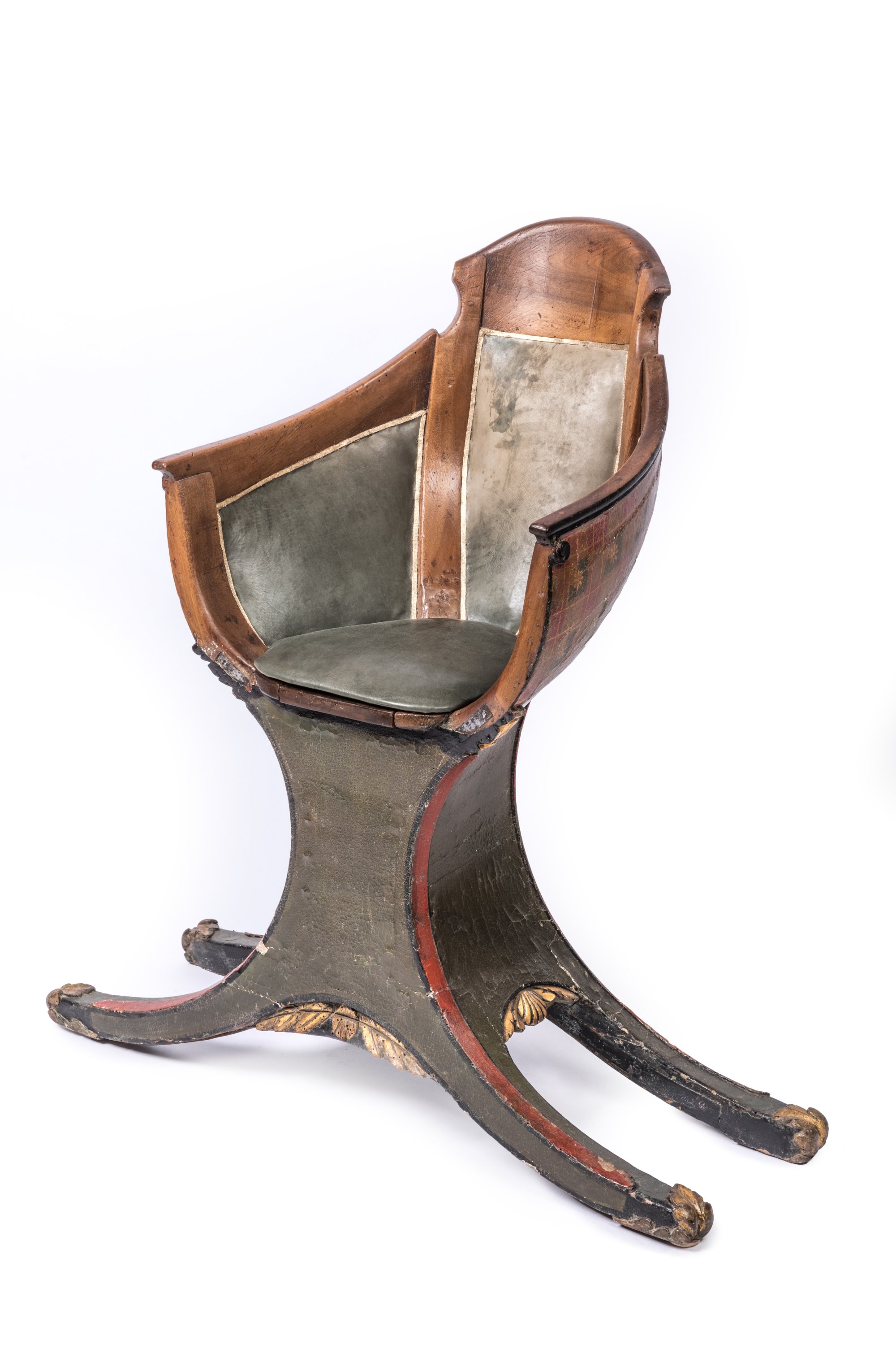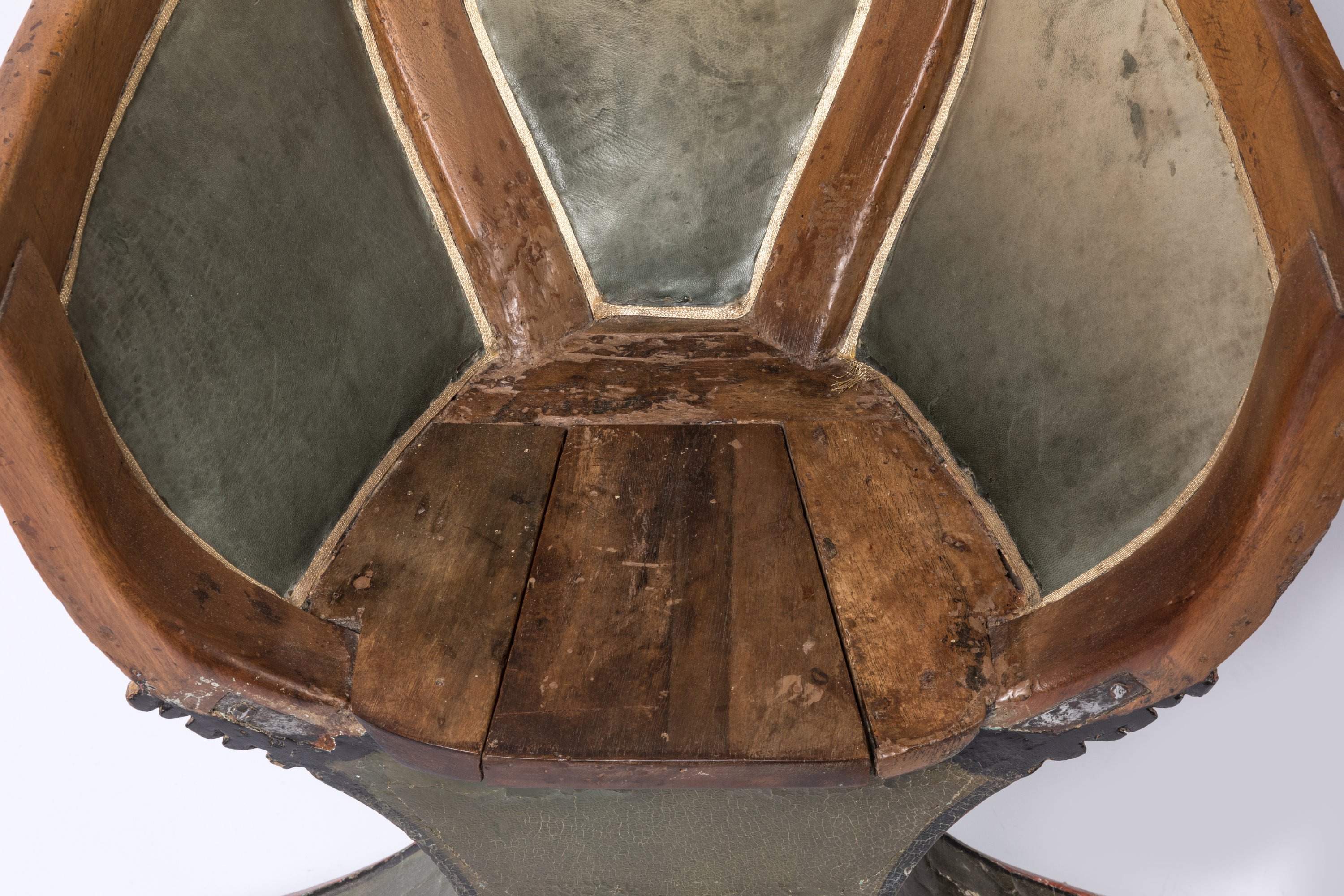 Early 19th century, presumably Venitian "gondola" wooden seat with green leather cushions.