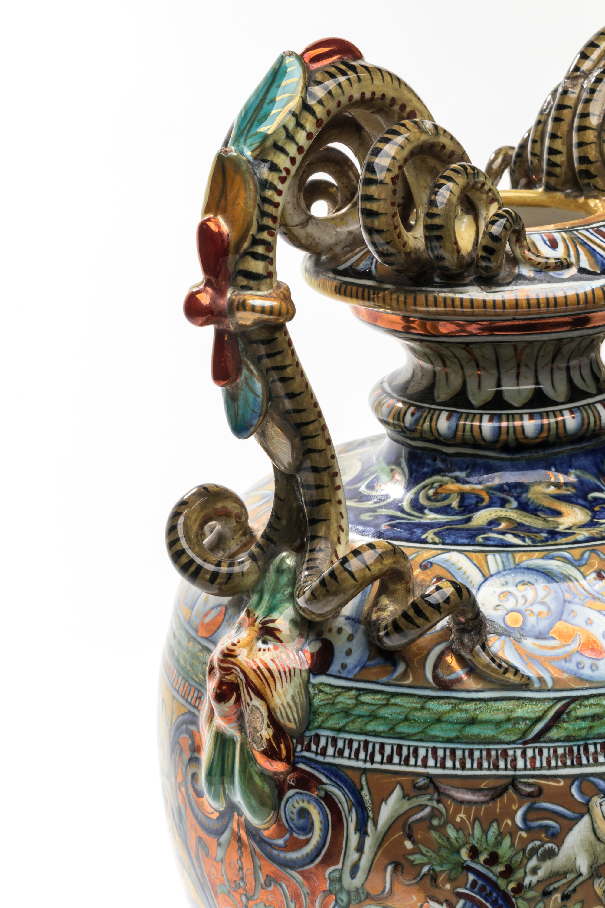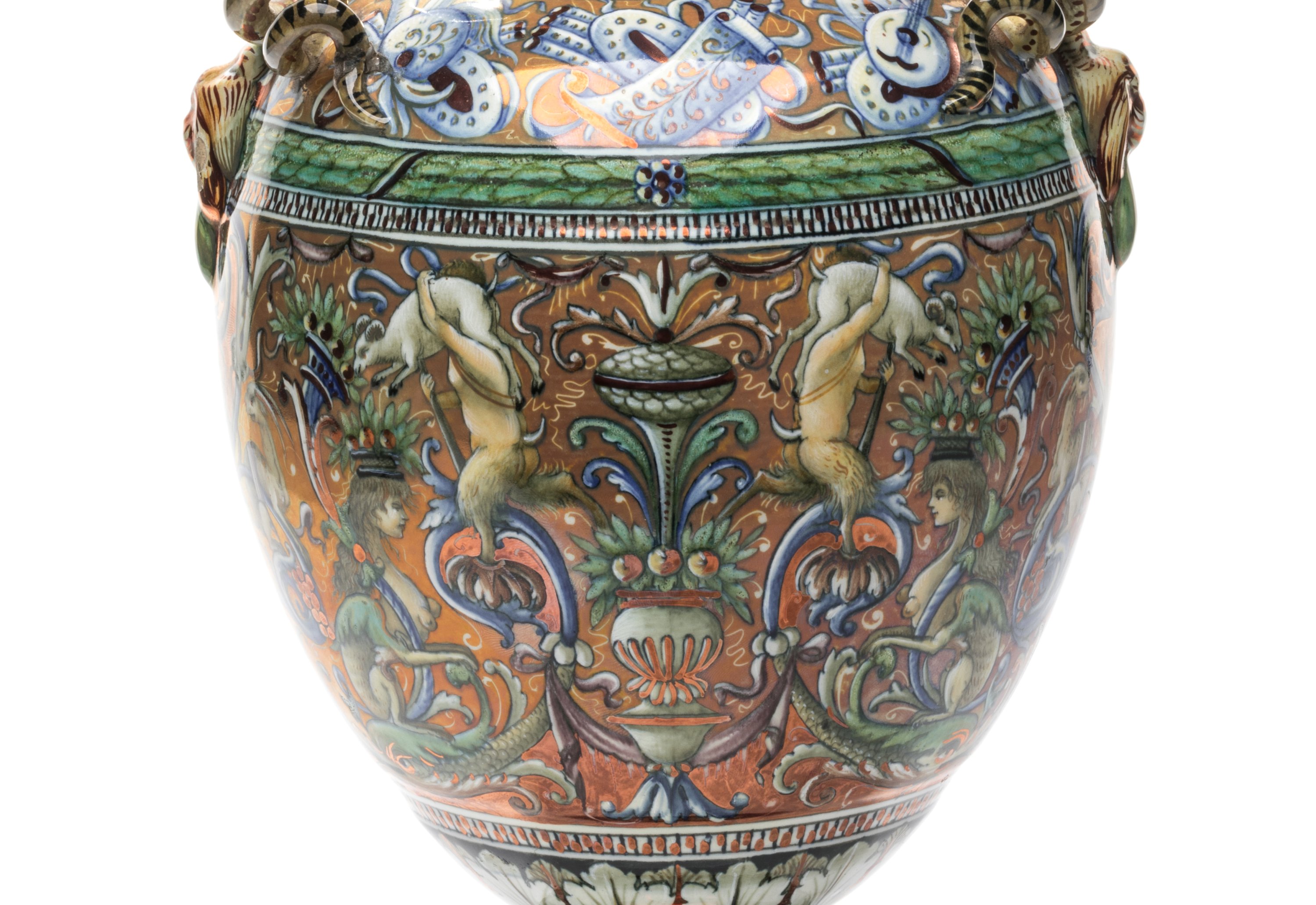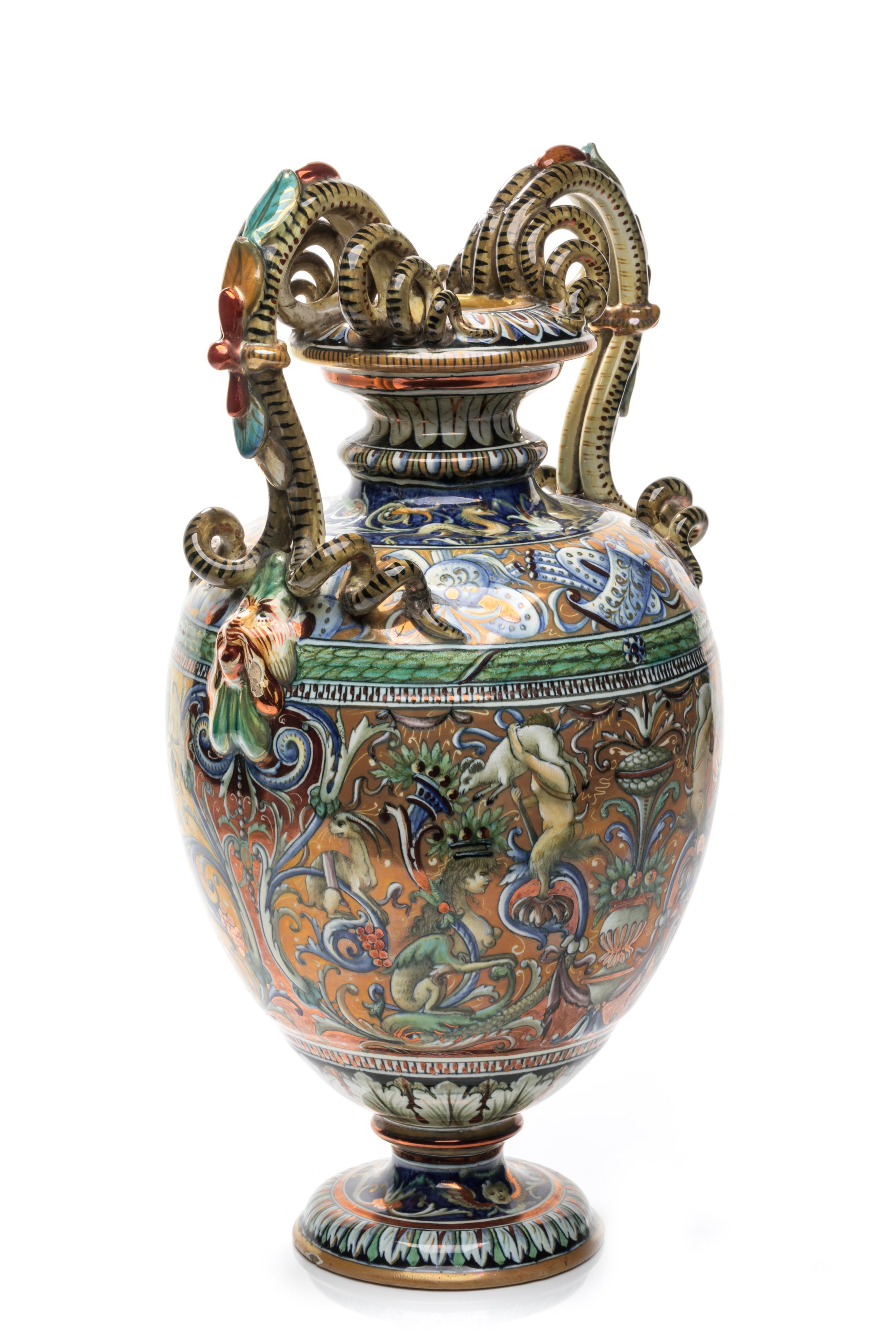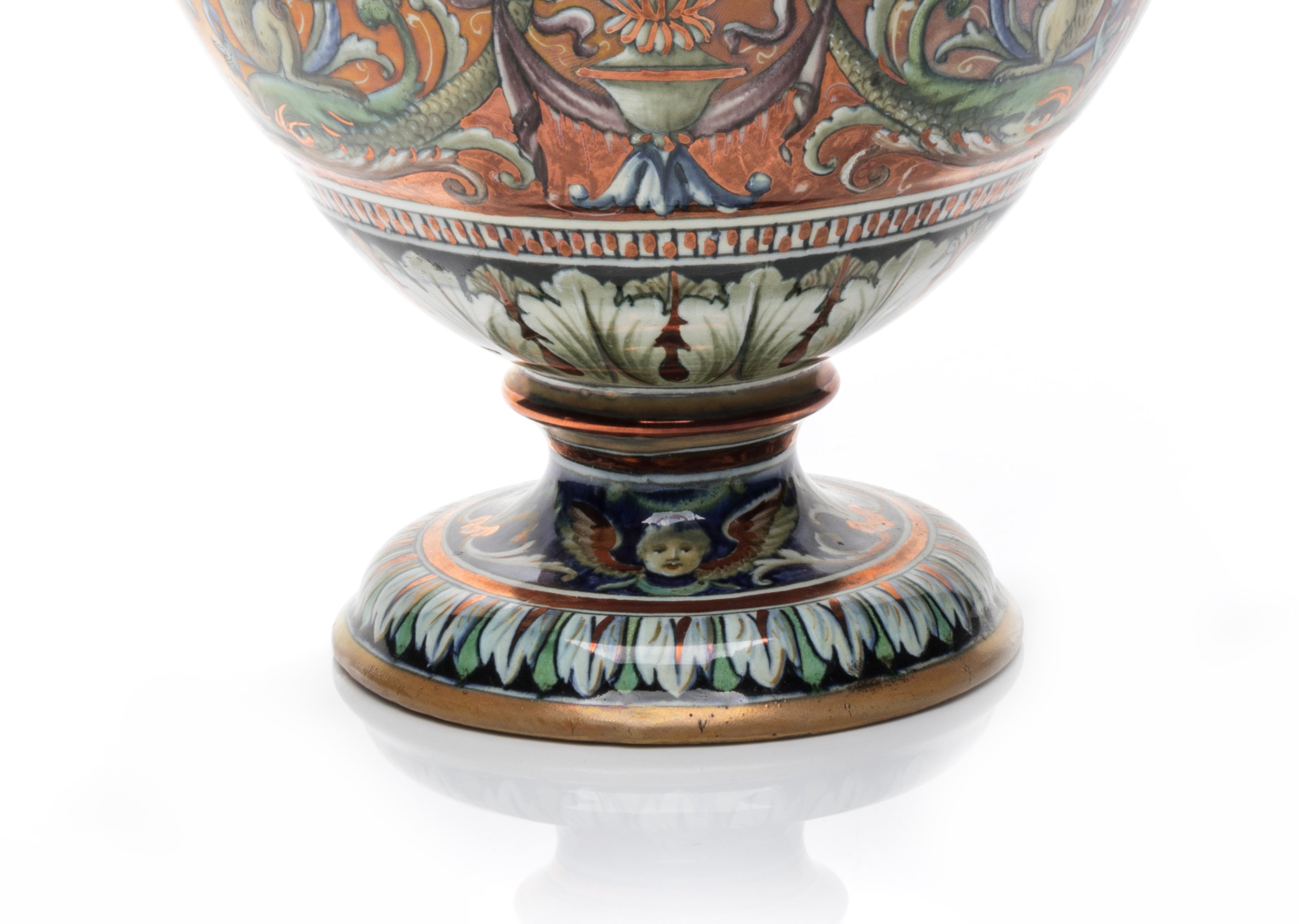 en faïence de forme balustre, à décor peint d'émaux à lustre métallique. Anses à double enroulement de serpent avec des mufles de lion à amortissement. Frises de chimères et d'instruments de musique en partie haute et de feuillages et têtes d'angelot en partie basse. Foisonnant décor mythologique dans des rinceaux, tels que sphinges, faunes, amours, divinité et chimères.