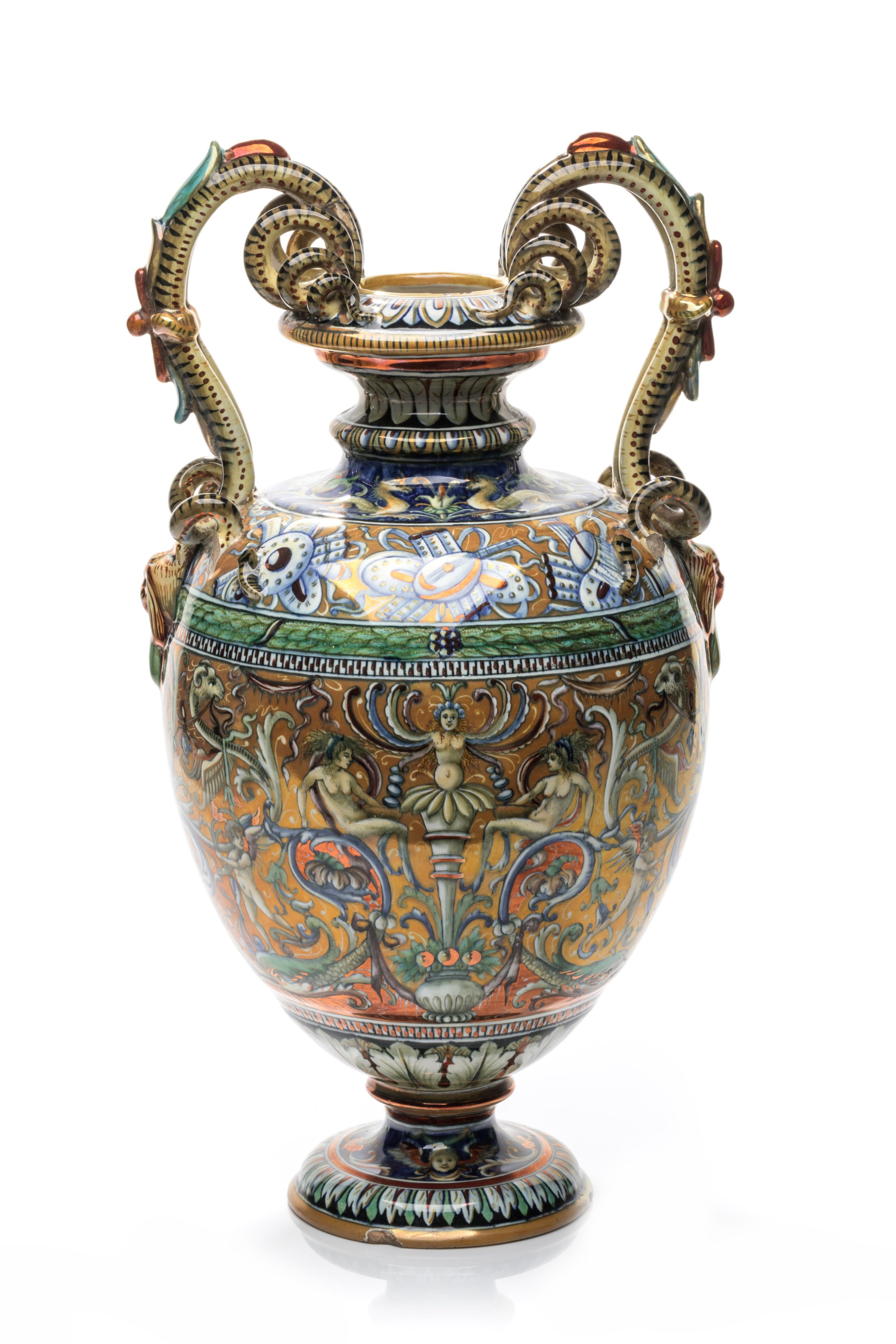 A late 19th-early 20th century faience vase decorated with chimeras attributed to British potter William De Morgan and Italian pottery producer Cantagalli.