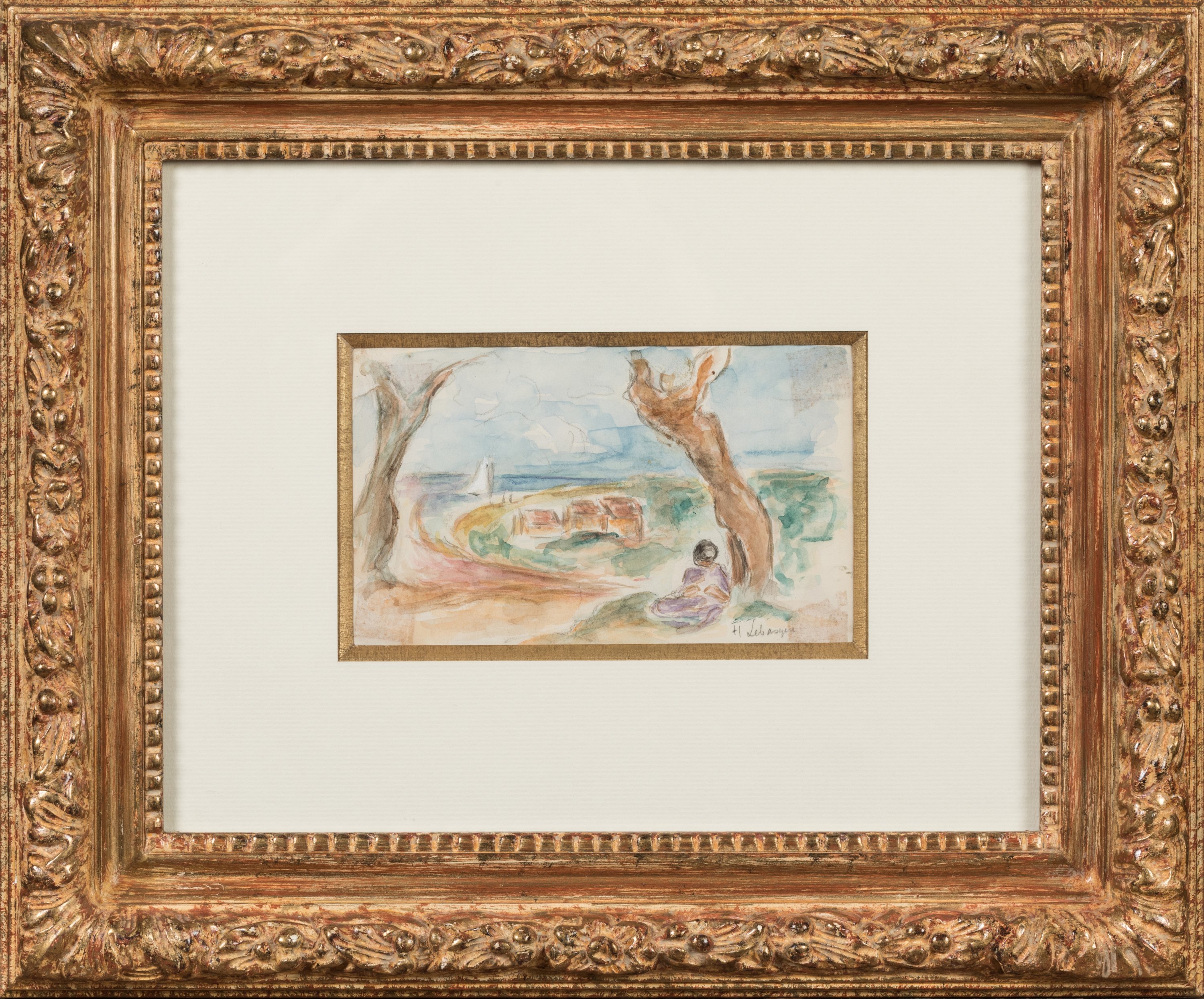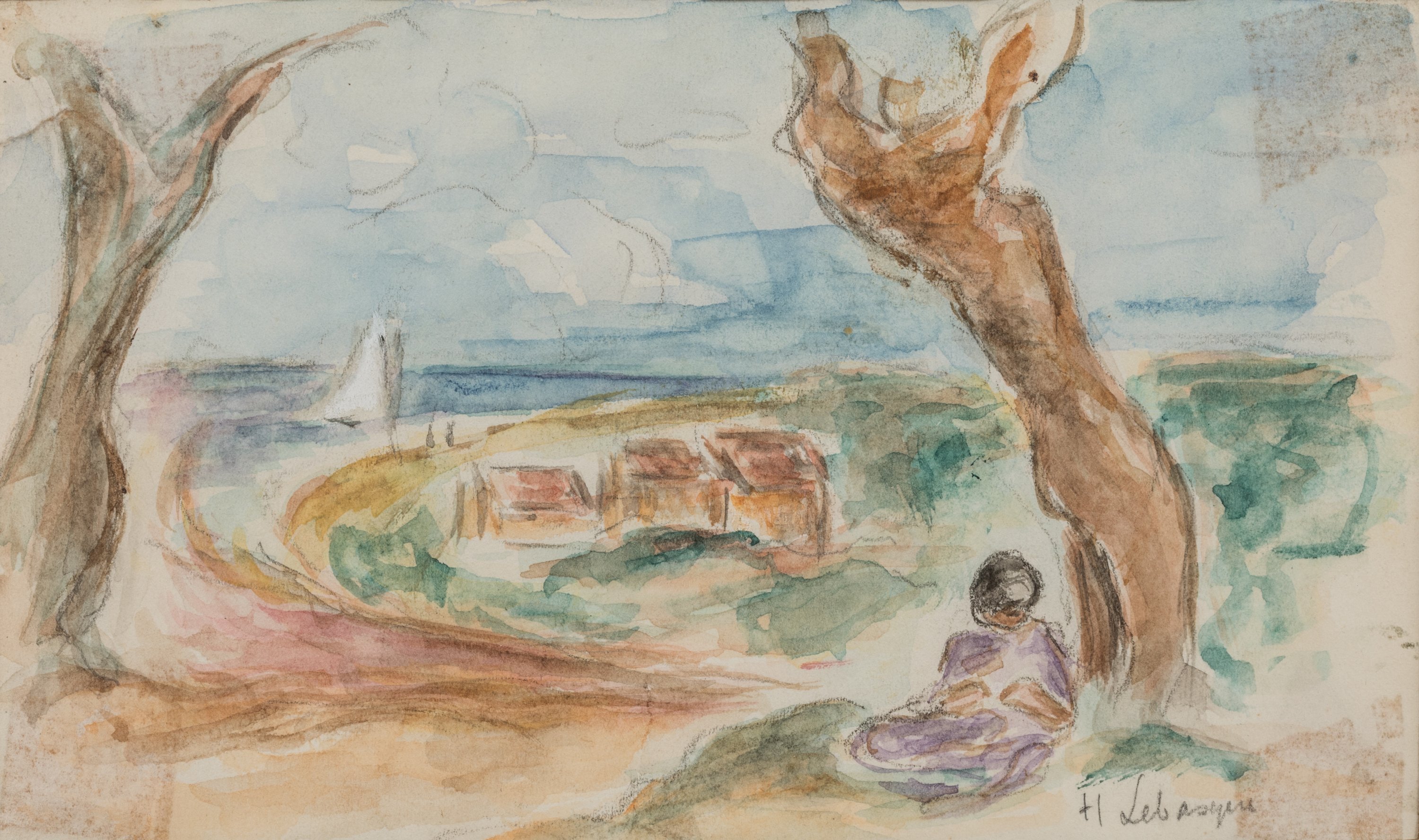 A watercolor painting by Henri Baptiste Lebasque depicting a sea shore. Signed.