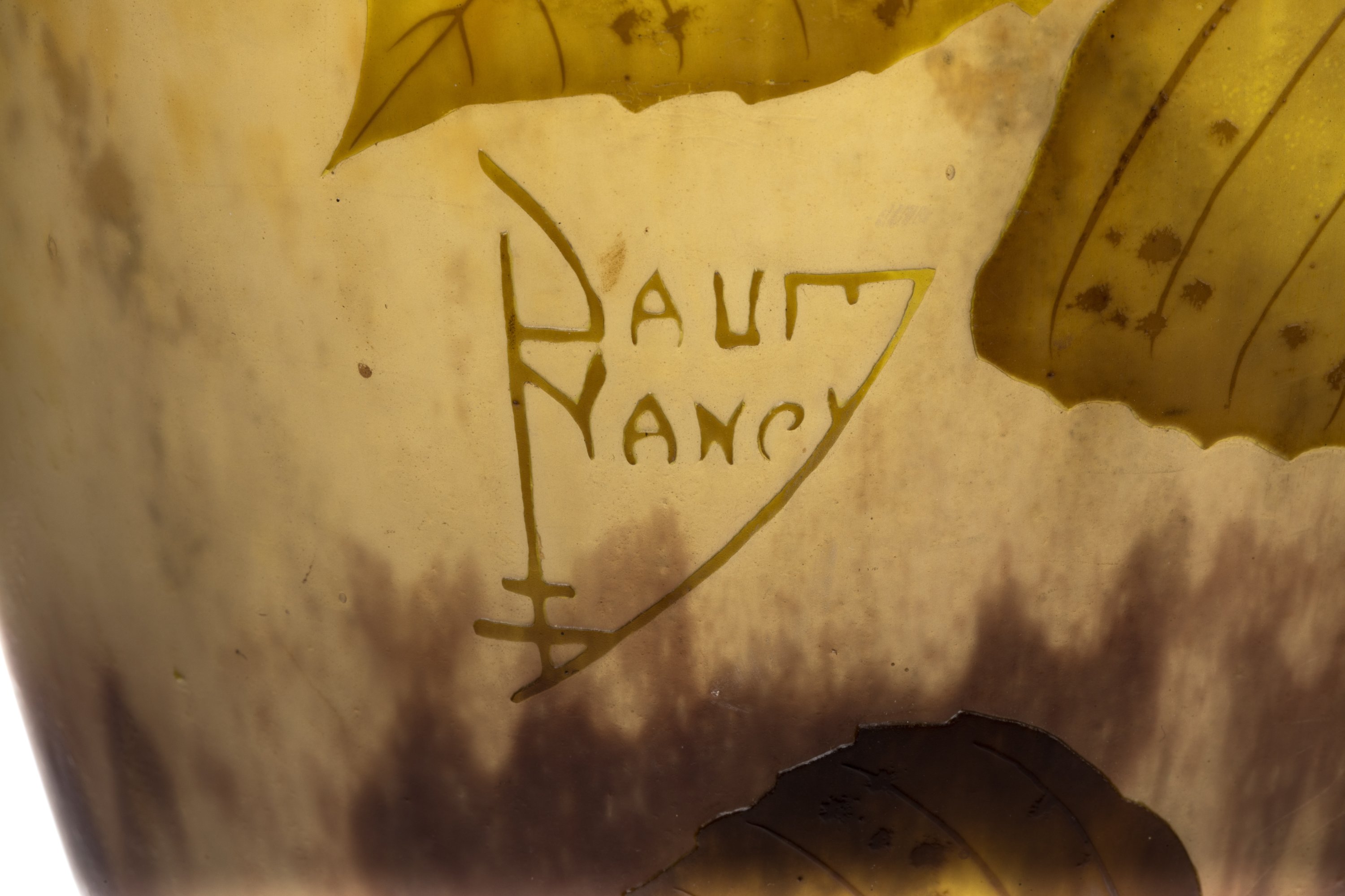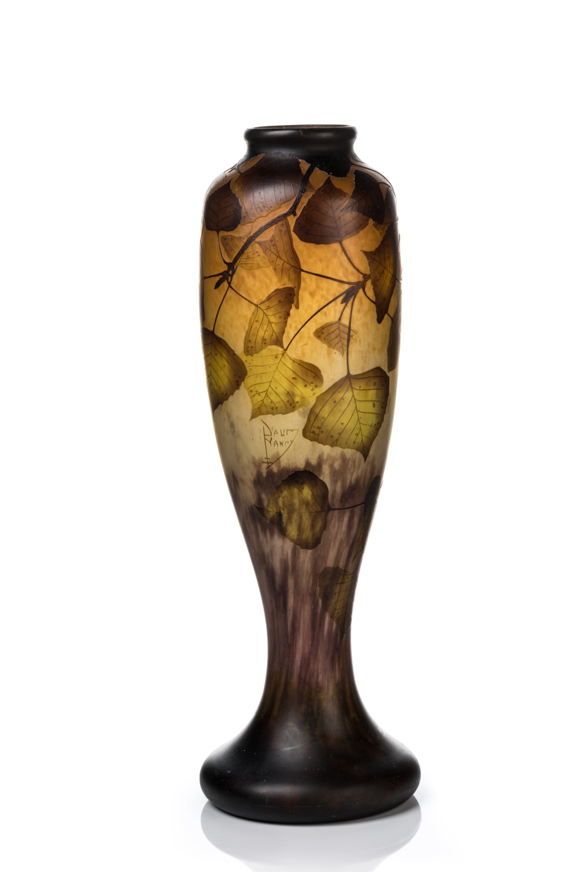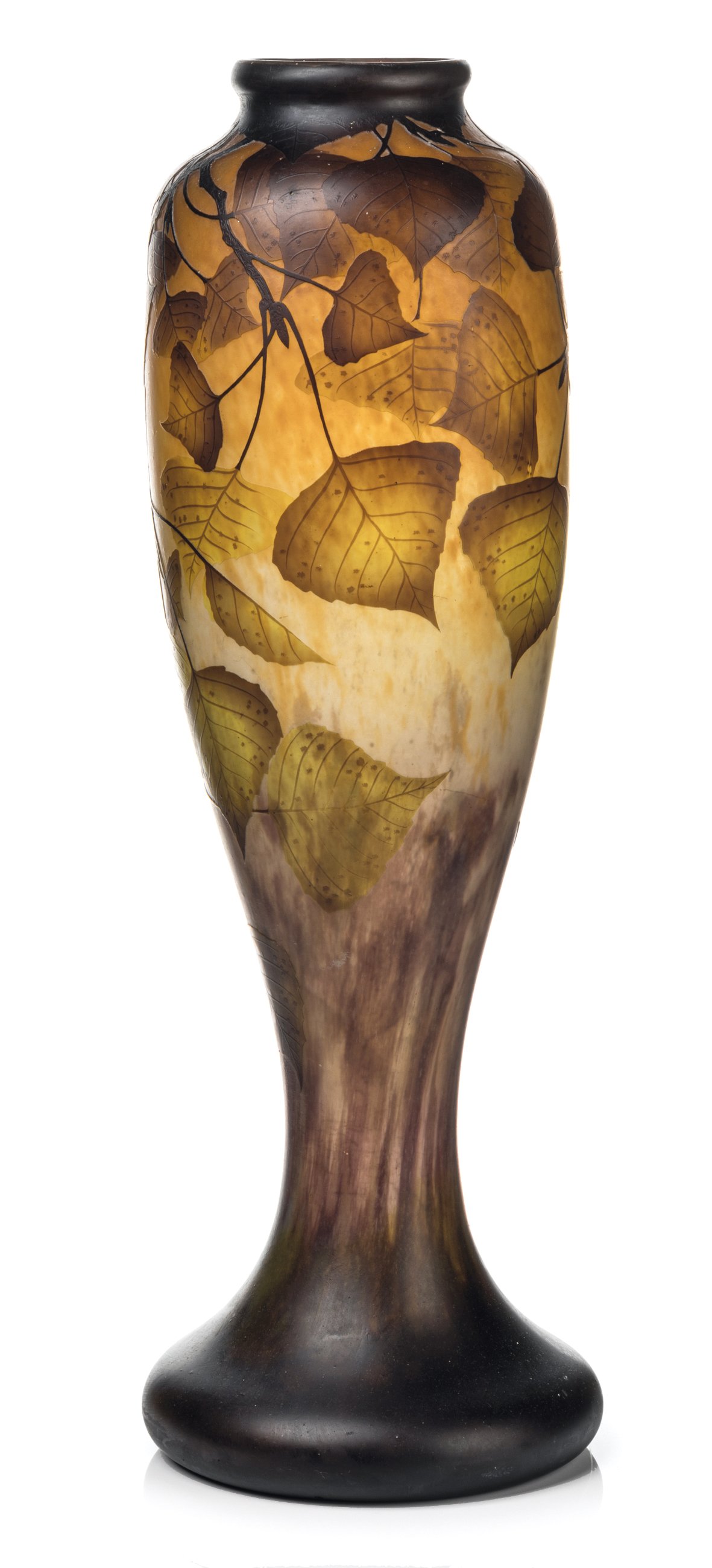 A ca. 1913 Daum cameo glass vase, acid-etched to produce linden leaves. Signed and numbered.
