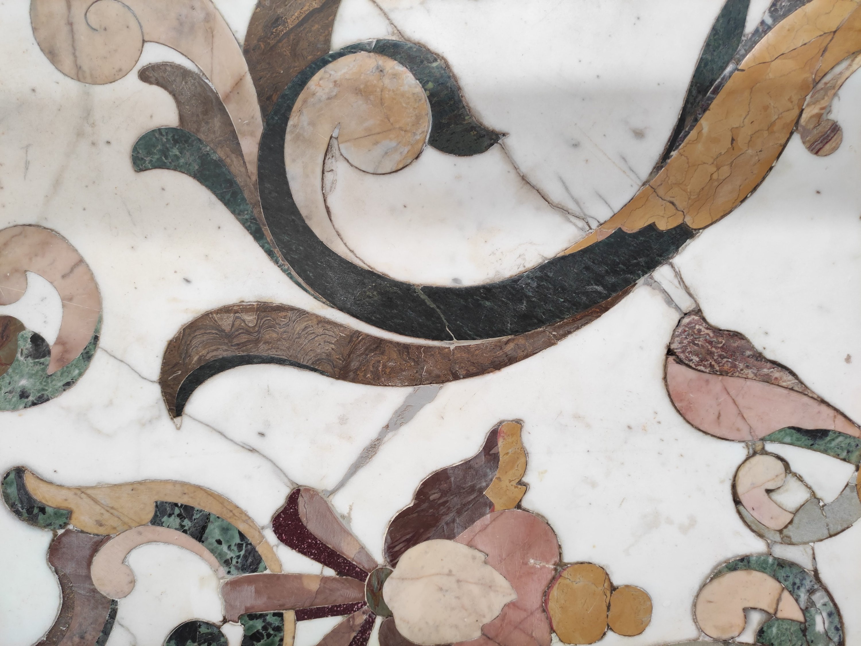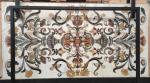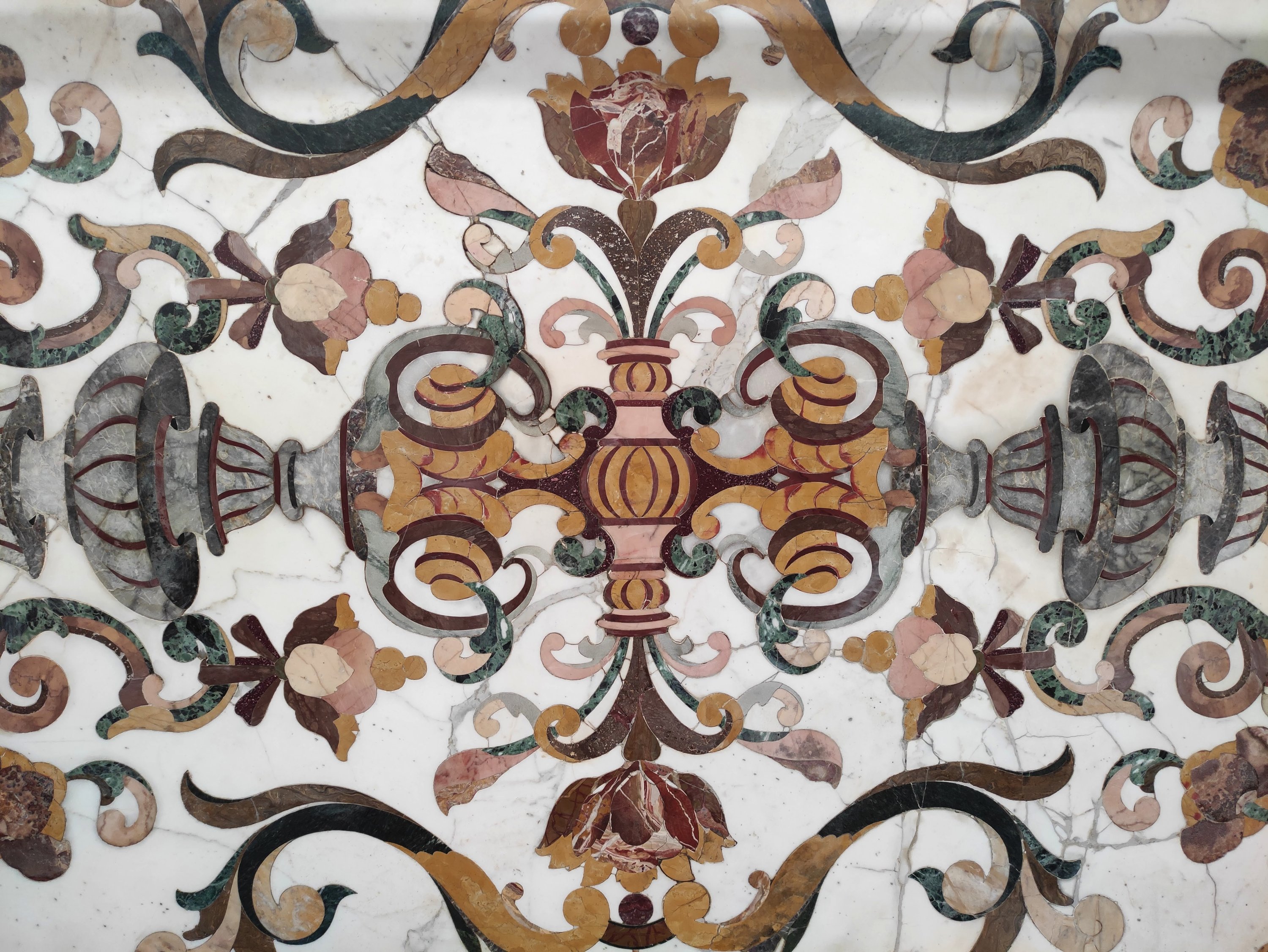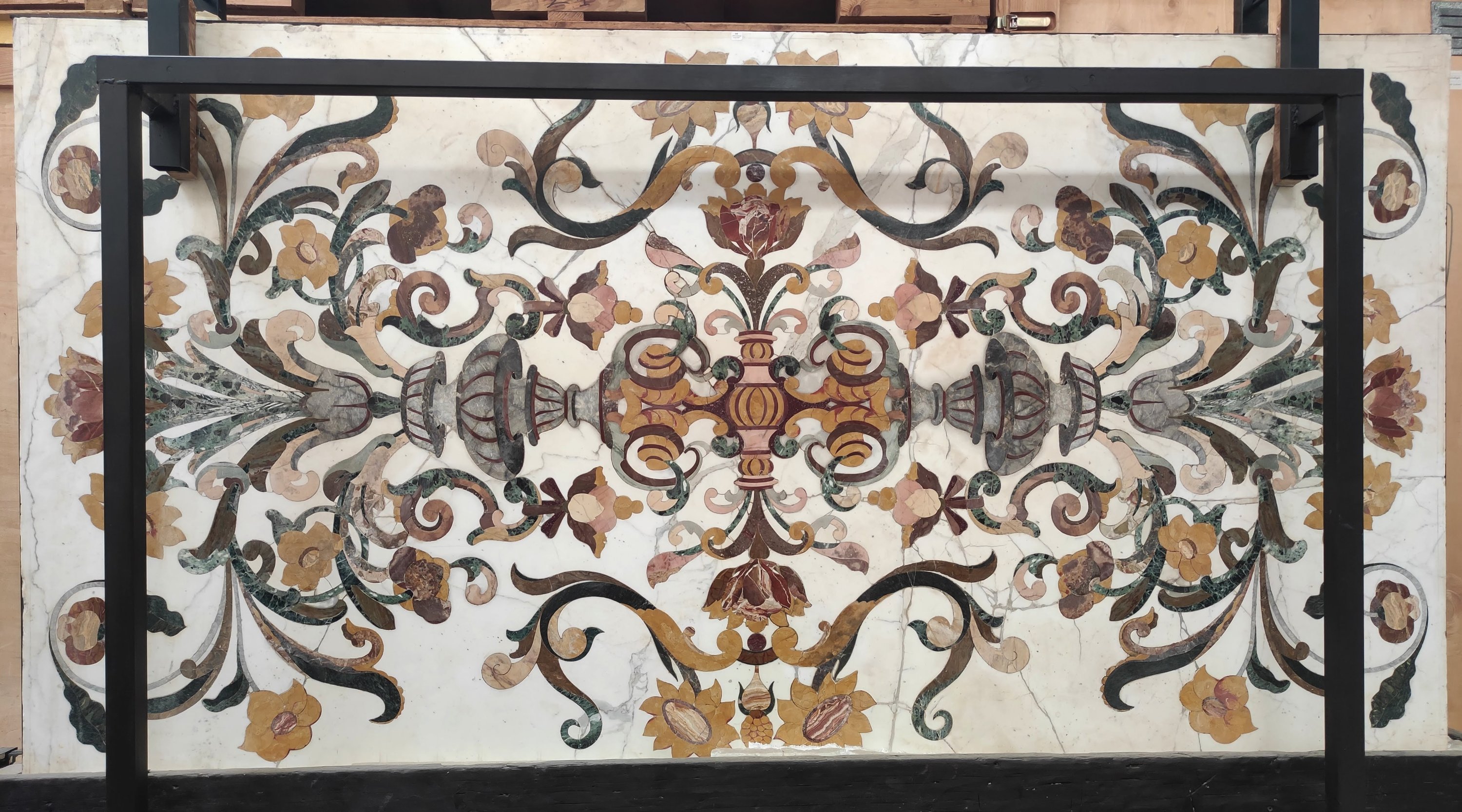 en scagliola et marbre dont probablement : Jaune de Sienne, Vert Antique, Albatre Fiorito, Brocatelle d'Espagne, Bleu Turquin, Rouge du Languedoc et Calacatta. Riche décor symétrique de vases, fleurs et arabesques en incrustations dans des tons automnaux.