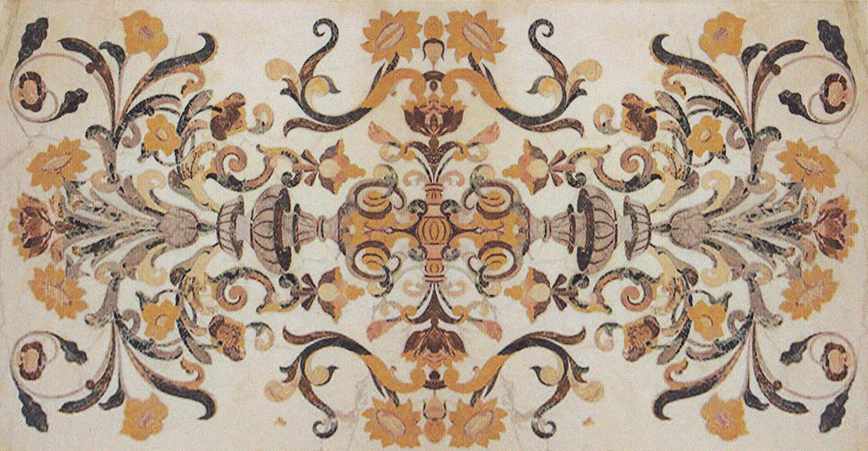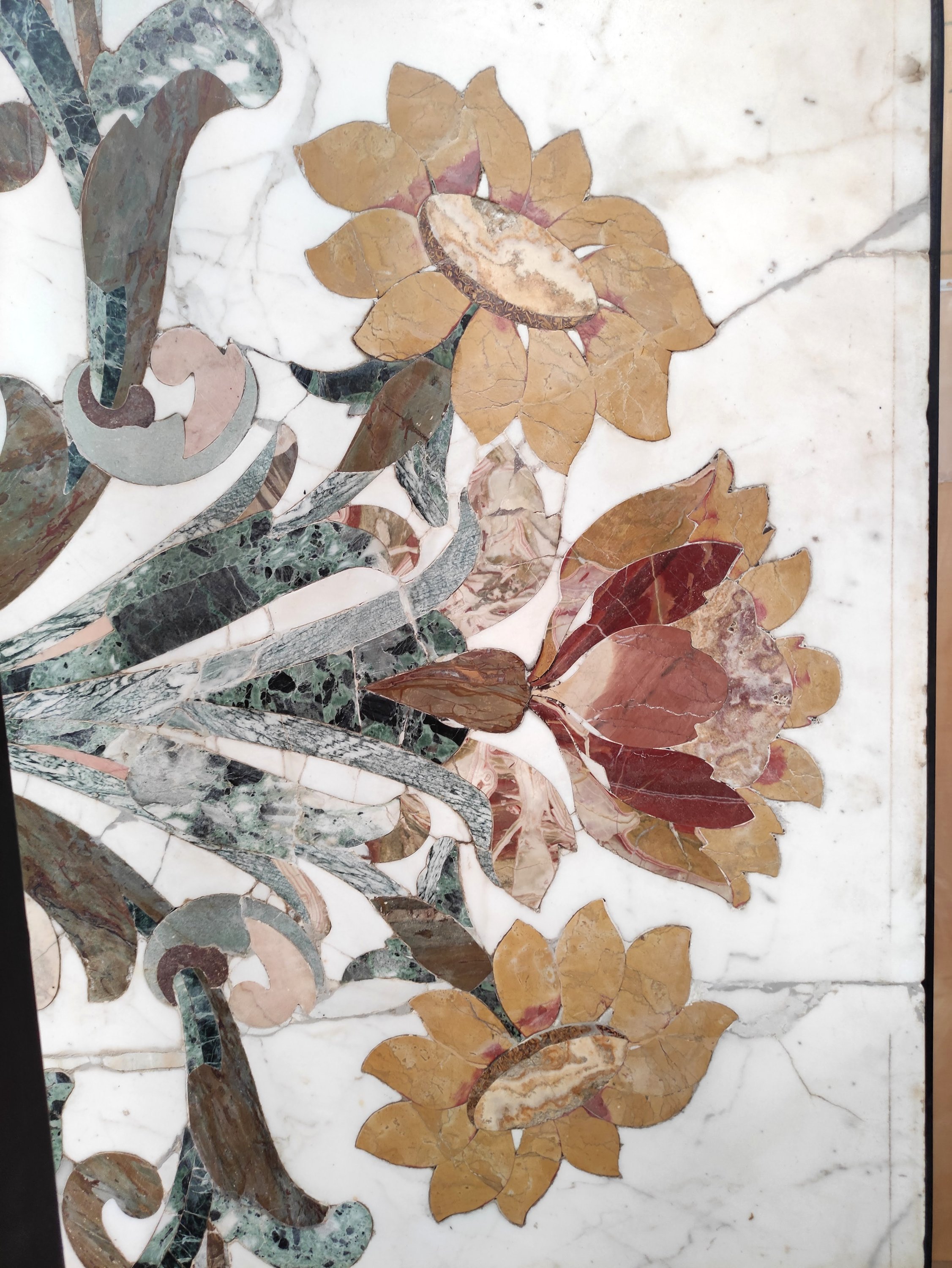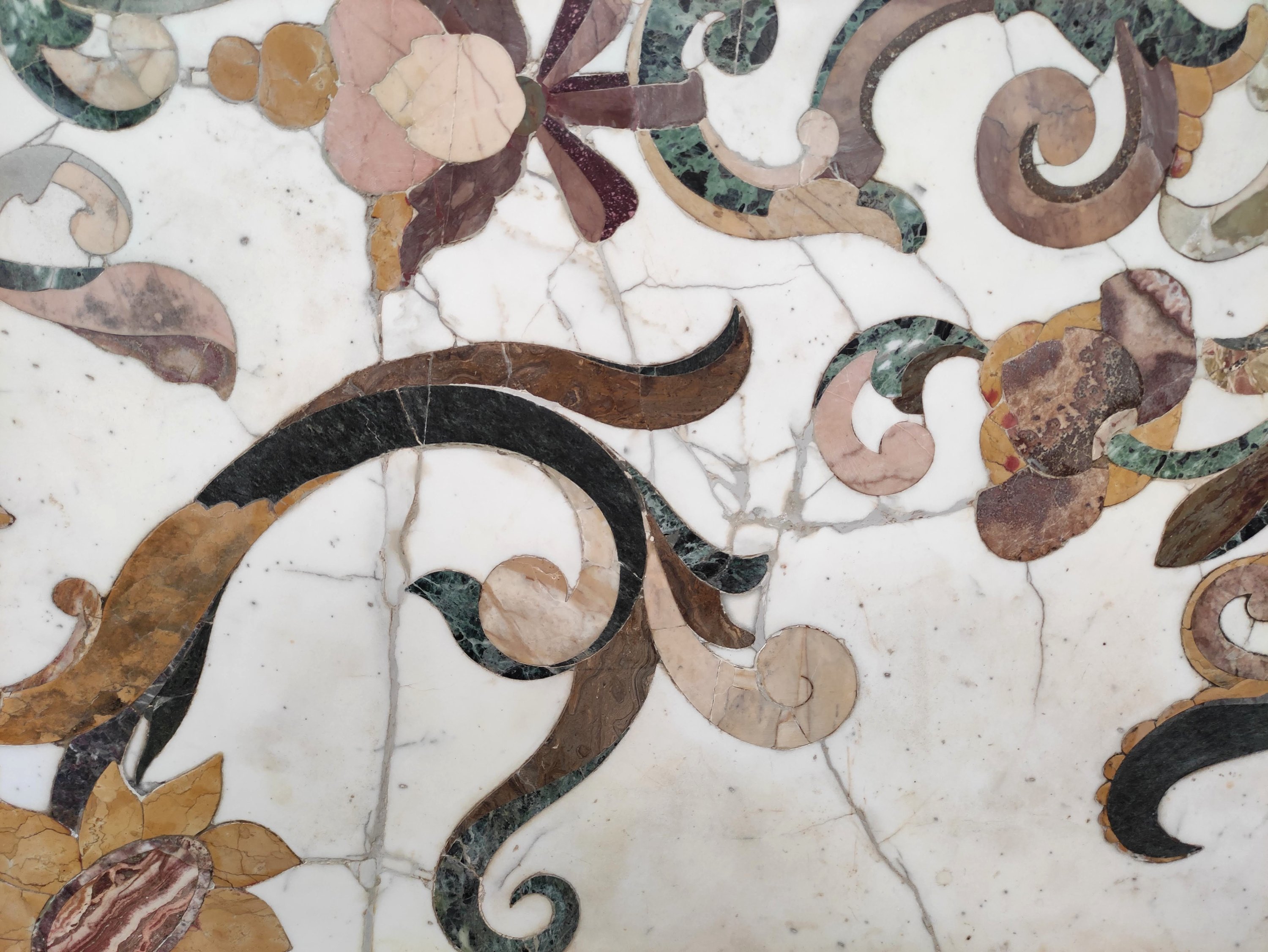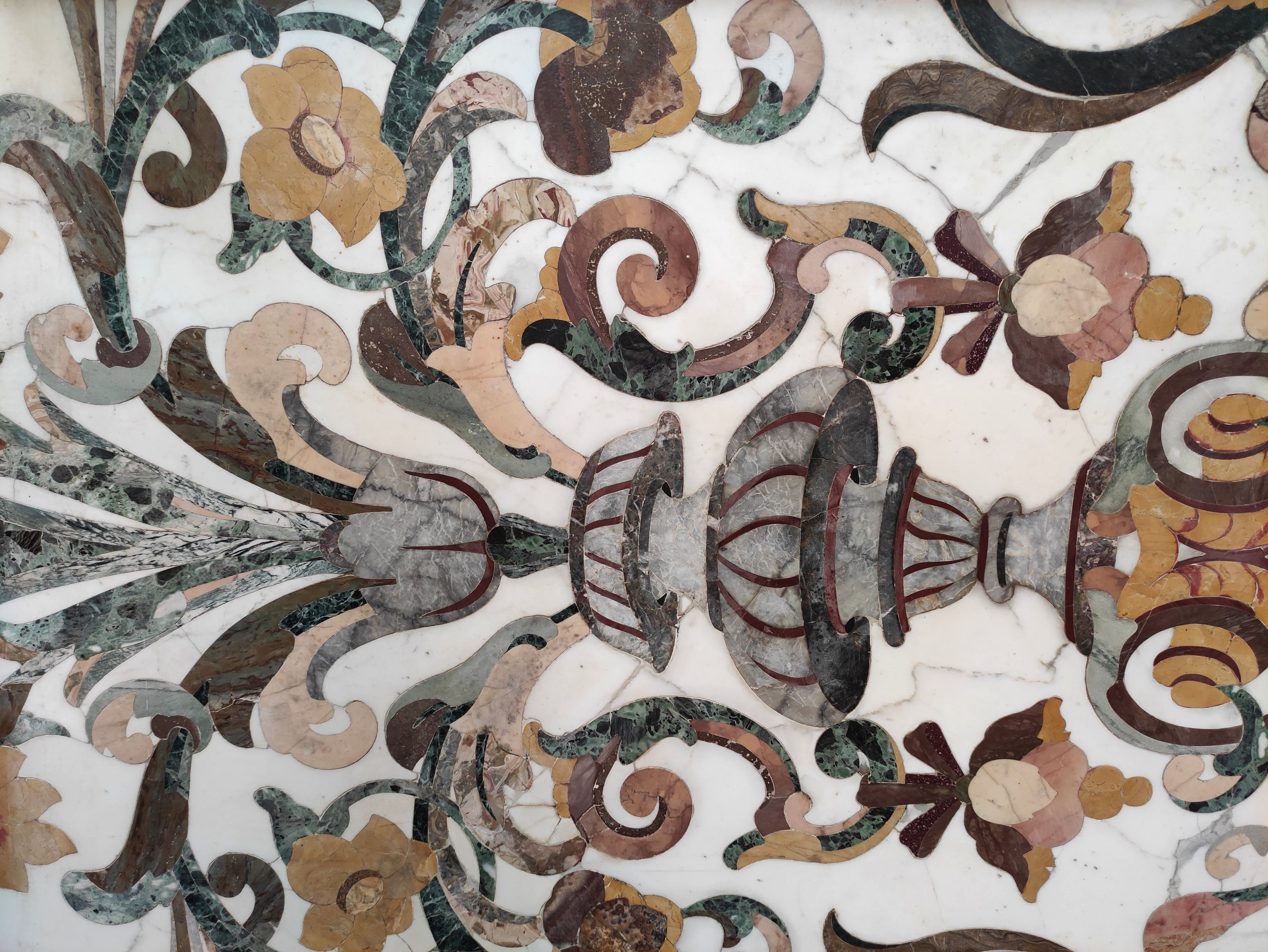 en scagliola et marbre dont probablement : Jaune de Sienne, Vert Antique, Albatre Fiorito, Brocatelle d'Espagne, Bleu Turquin, Rouge du Languedoc et Calacatta. Riche décor symétrique de vases, fleurs et arabesques en incrustations dans des tons automnaux.