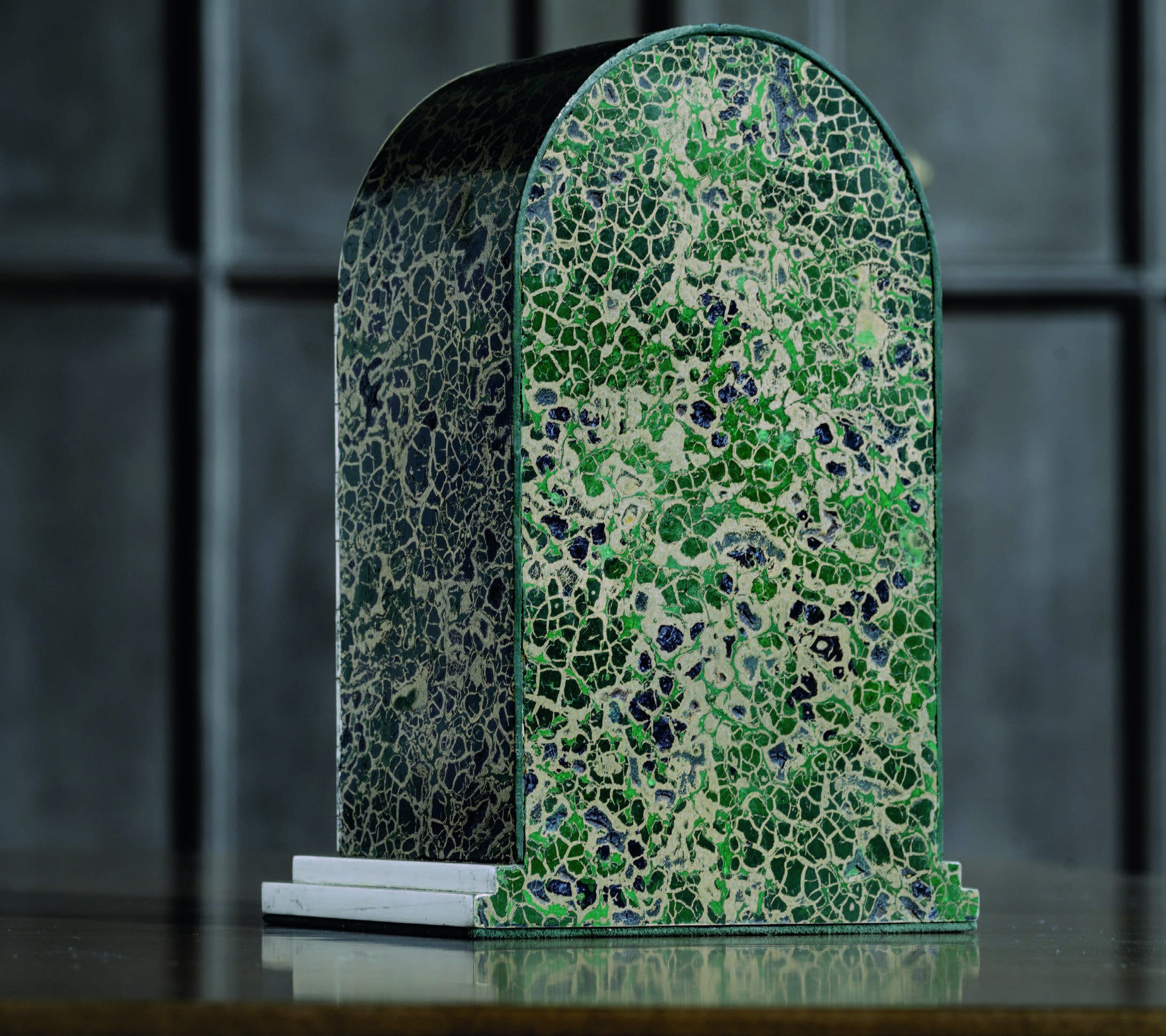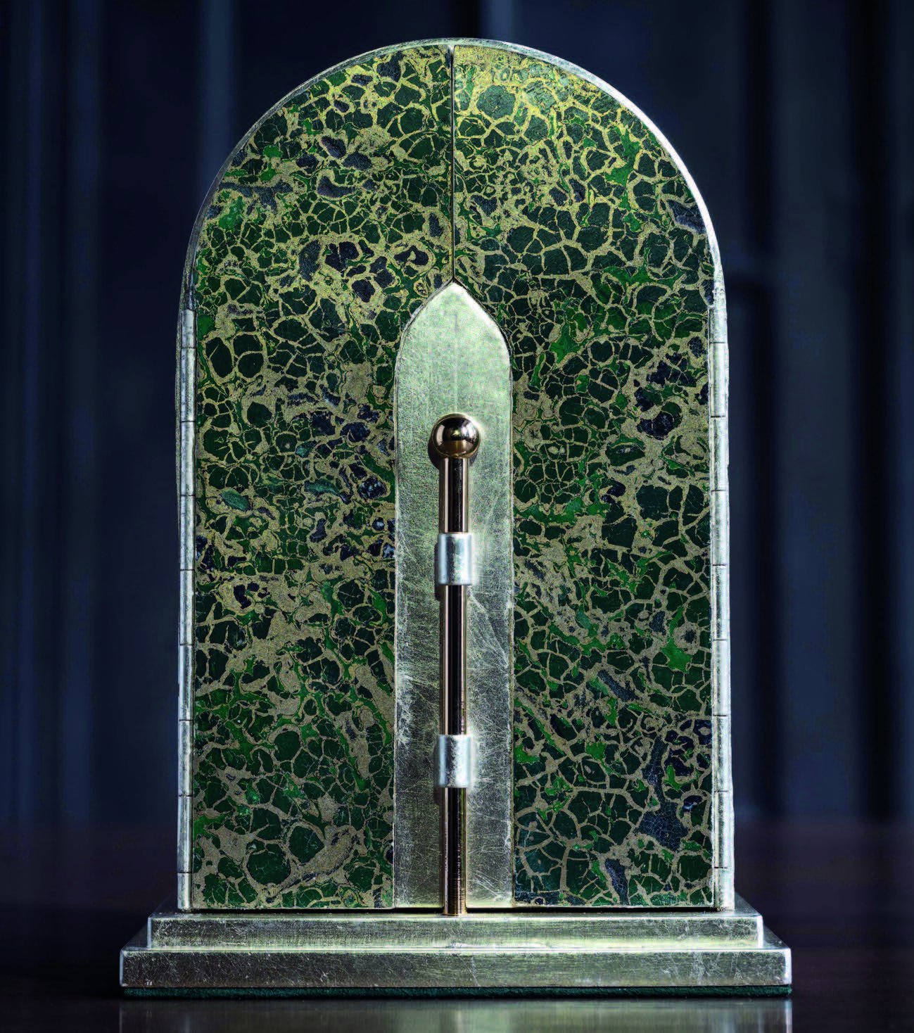 ATELIER L’ÉTOILE : Décor de l’écrin-autel extérieur, craquelés émeraude liés par un kintsugi or