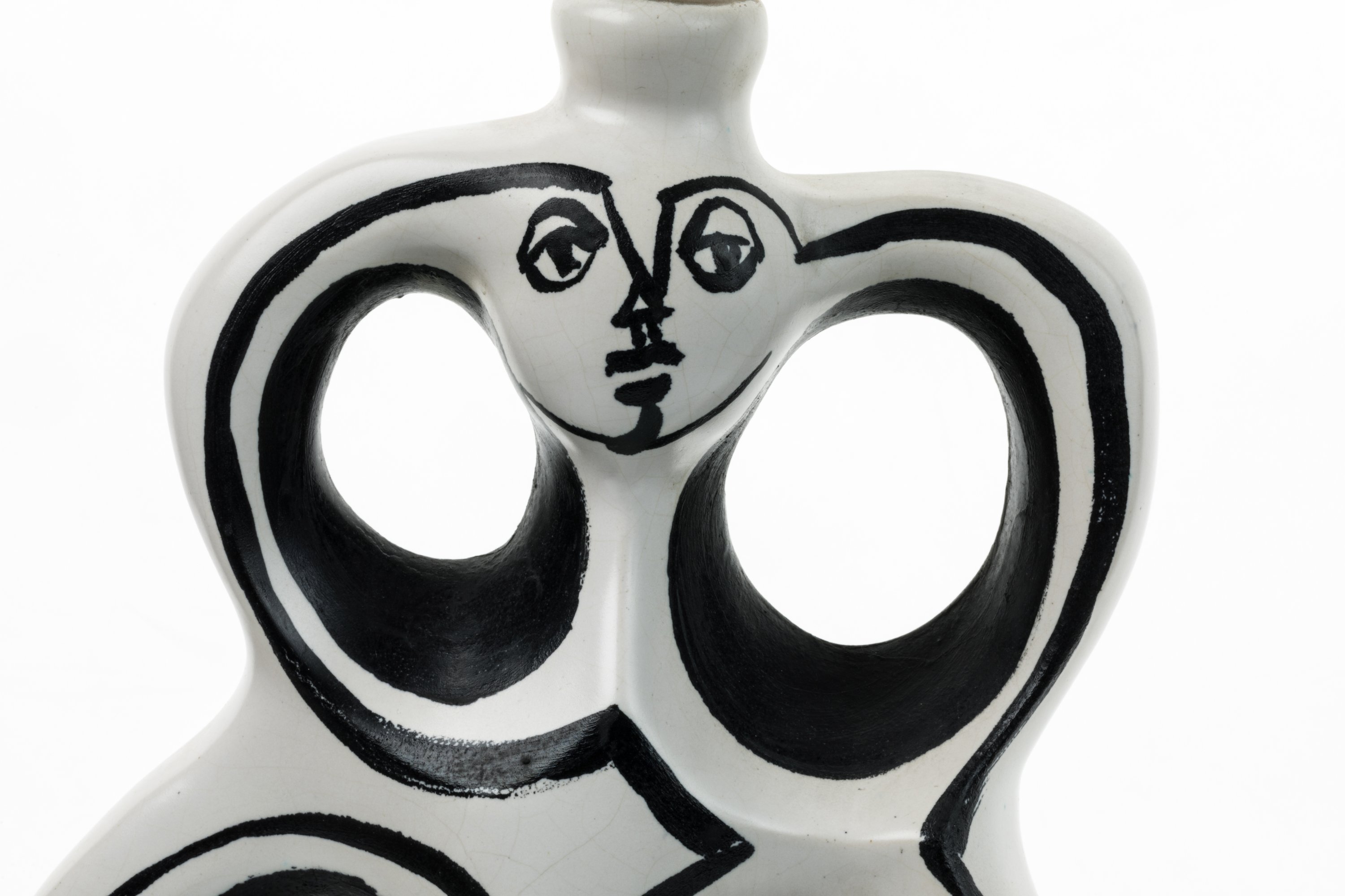 Cette lampe anthropomorphe de Georges Jouve répond à la règle implicite de l'artiste suivant laquelle "tout dans la nature s’organise autour du cône, de la sphère et du cylindre" tant les formes circulaires sont, comme chez Cézanne, au cœur de sa création. Pour autant, la succession des quatre ronds n’est pas parfaite. Jouve délaisse ainsi le tour pour modeler la matière, à l’instar du sculpteur. Son dessin préparatoire préfigure par la vivacité de ses traits toute l’expression de l’œuvre finale. L’émail noir et blanc apporte quant à lui un sentiment de paix, qui n’est pas sans rappeler le propre vestiaire de Georges Jouve : à la ville, veste blanche et chemise noire ; à l’atelier, pull-over noir et pantalon clair. Créée dans la première moitié des années 1950, on ne connait que quelques exemplaires de cette lampe. L’un d’eux est présenté sur le stand de l’exposition de Marion Beststyl à Sydney en 1956. Installée entre deux colonnes et présentée à hauteur d’homme, cette lampe se perçoit comme une œuvre majeure de l’artiste.
