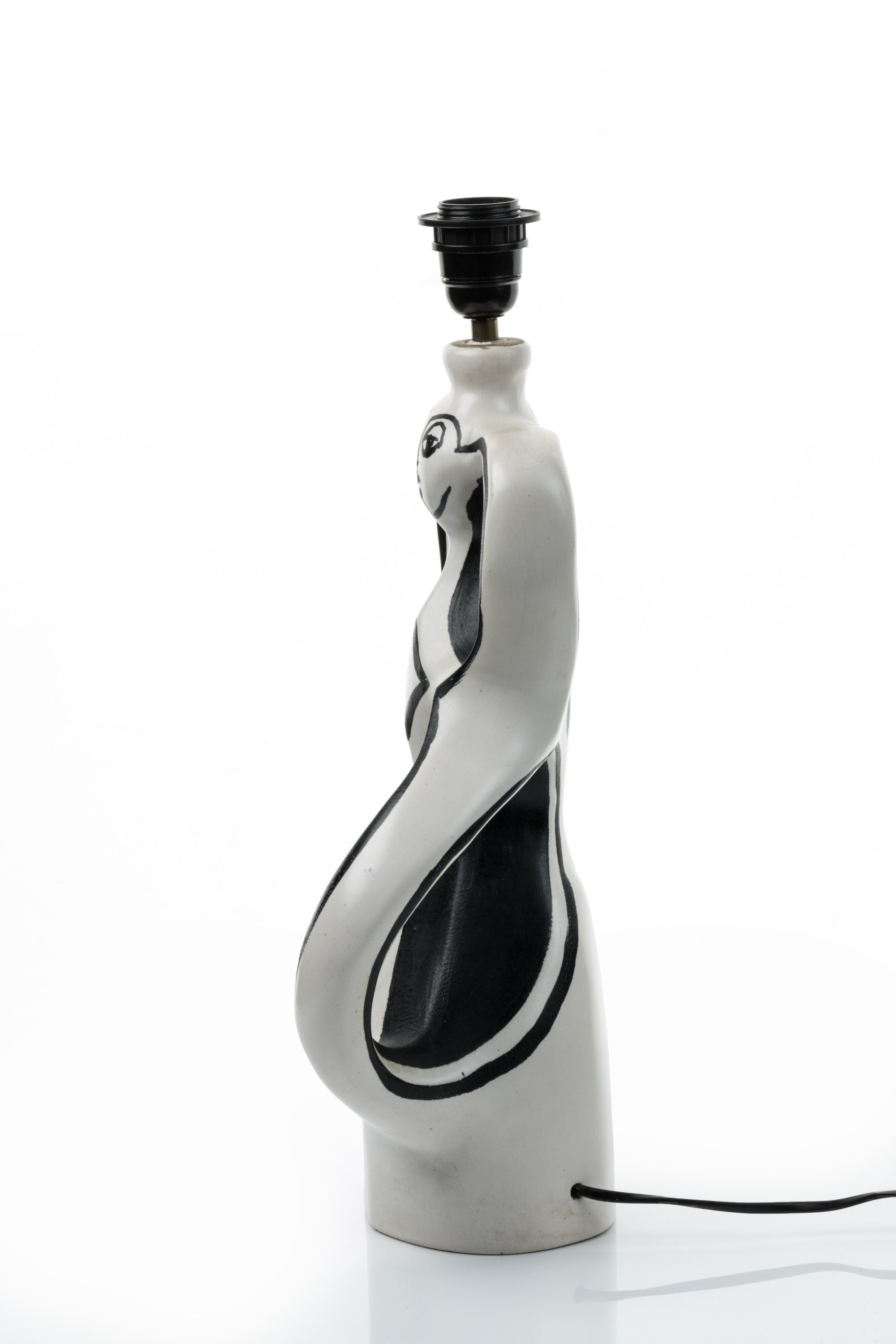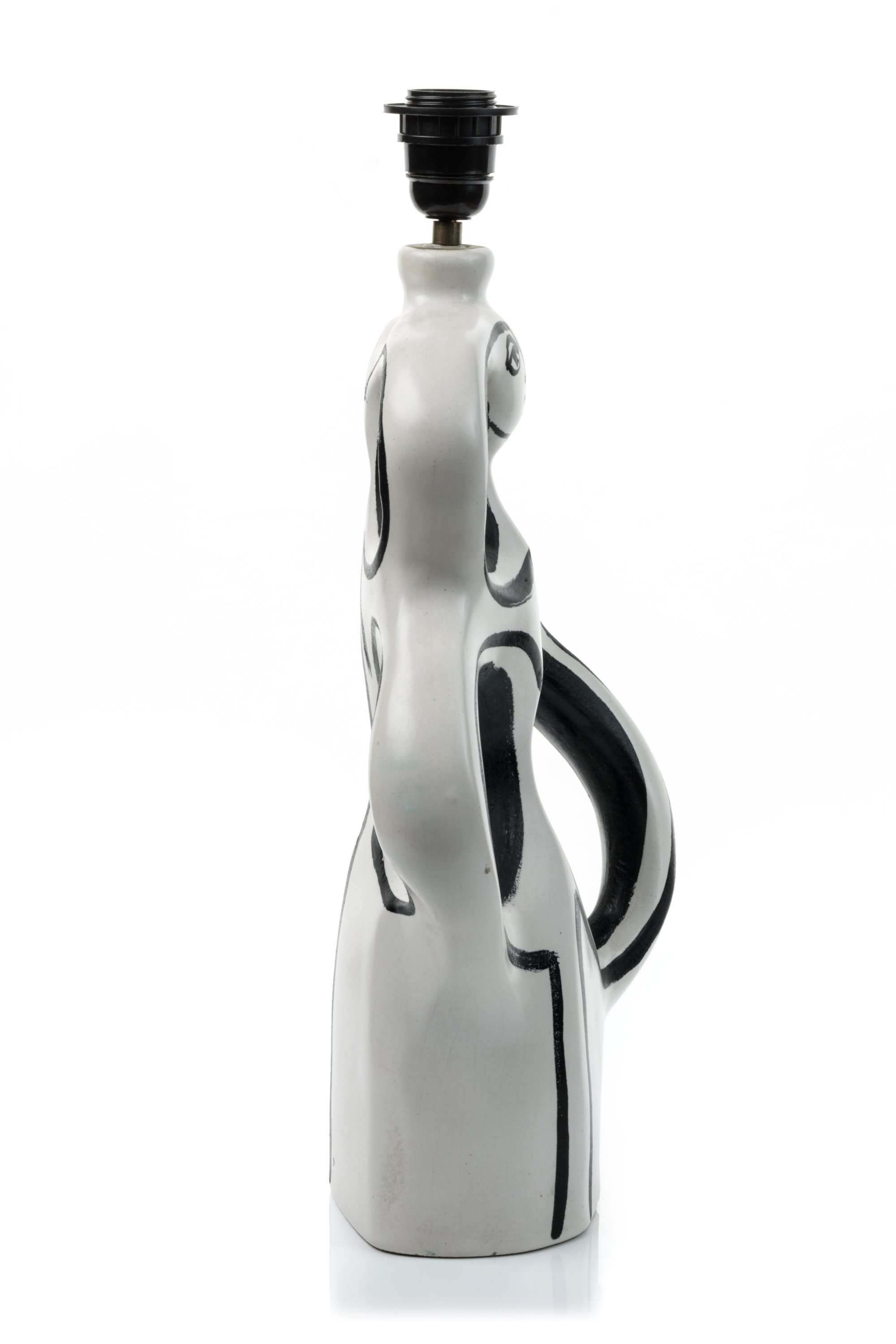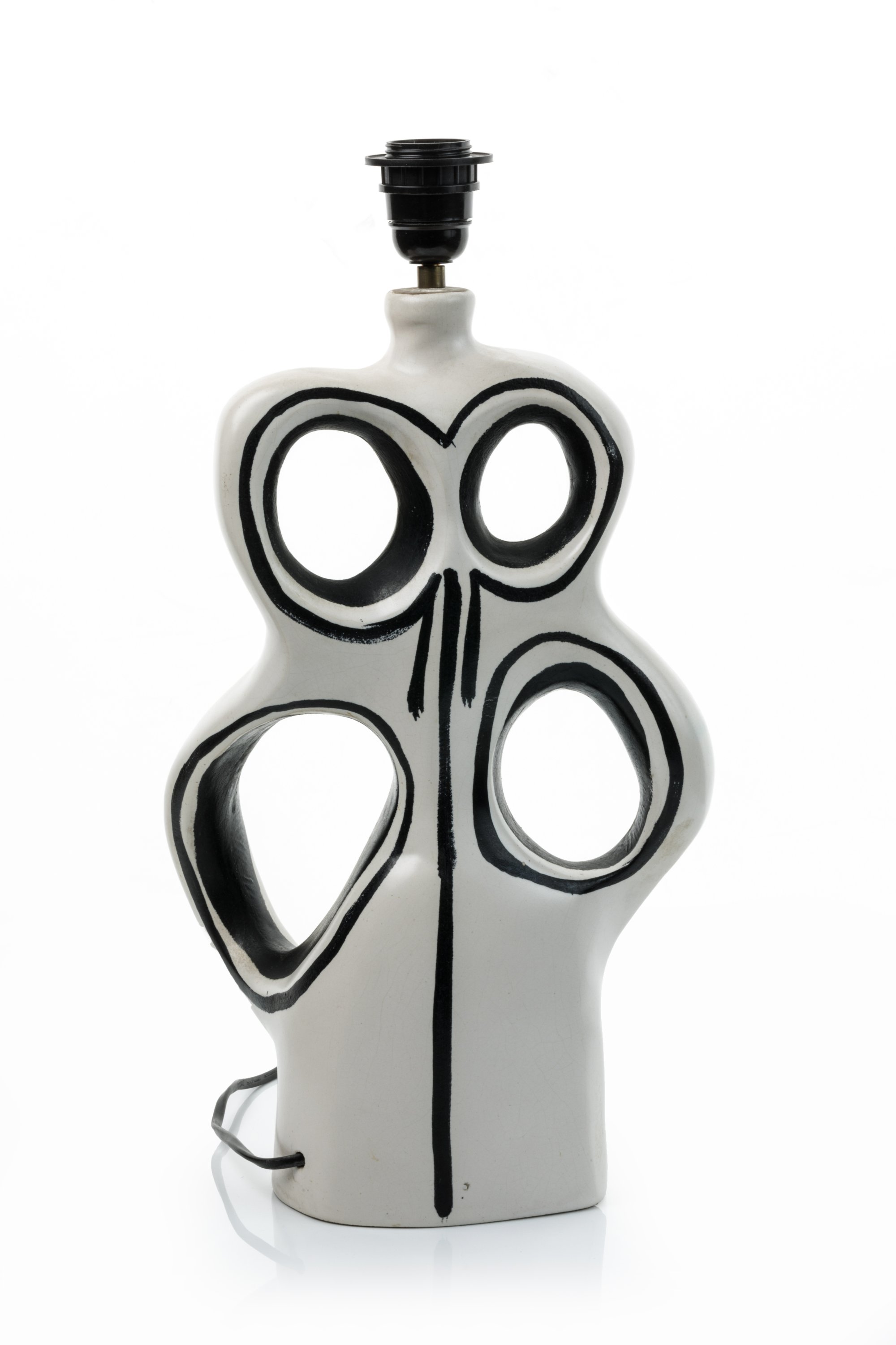 Rare piétement de lampe en céramique émaillée blanche et oxydes noirs, signé et monogrammé.