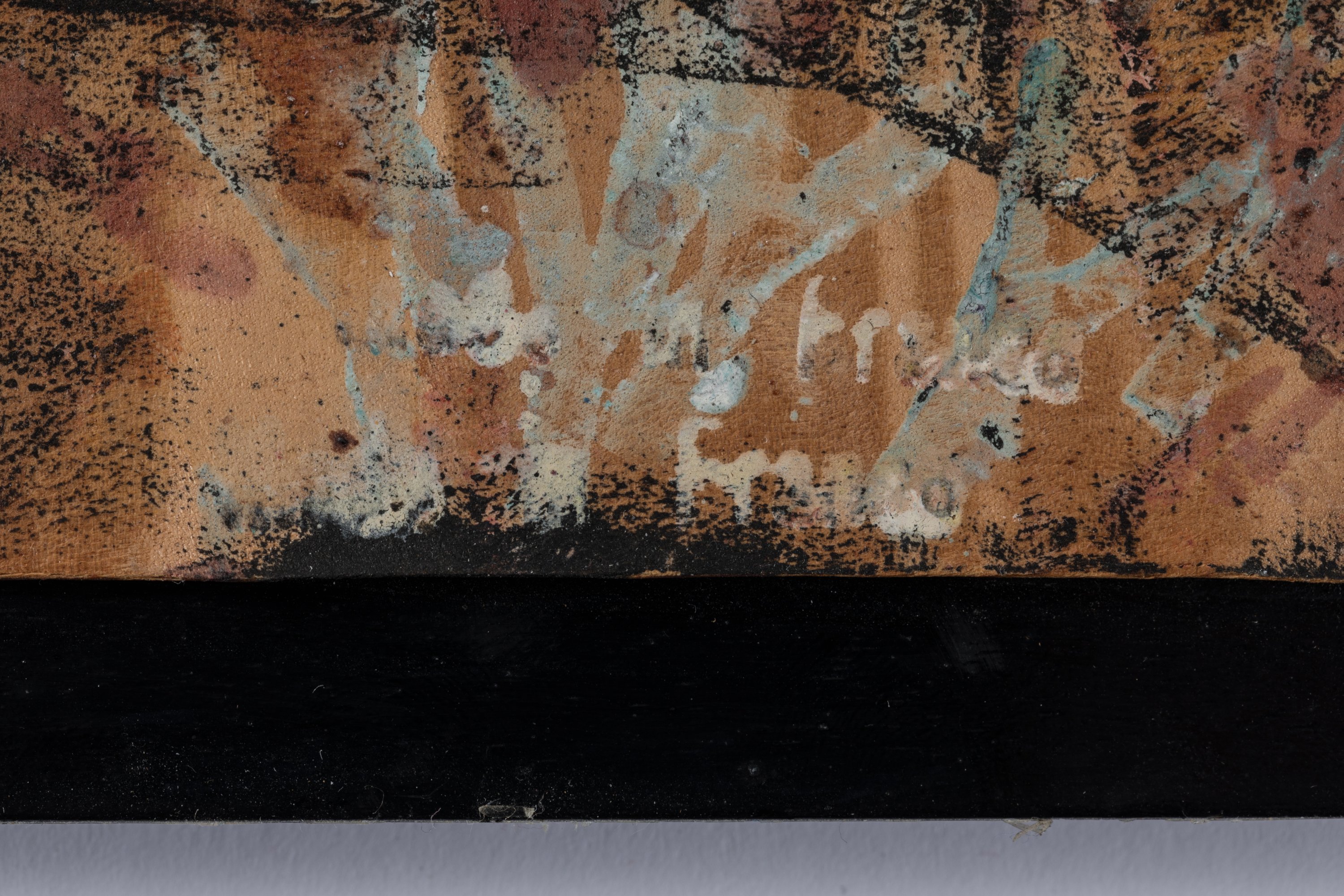 Empreintes de tampons sur placage de bois monté sur un support en bois noirci, signé et daté au dos à la mine de plomb.