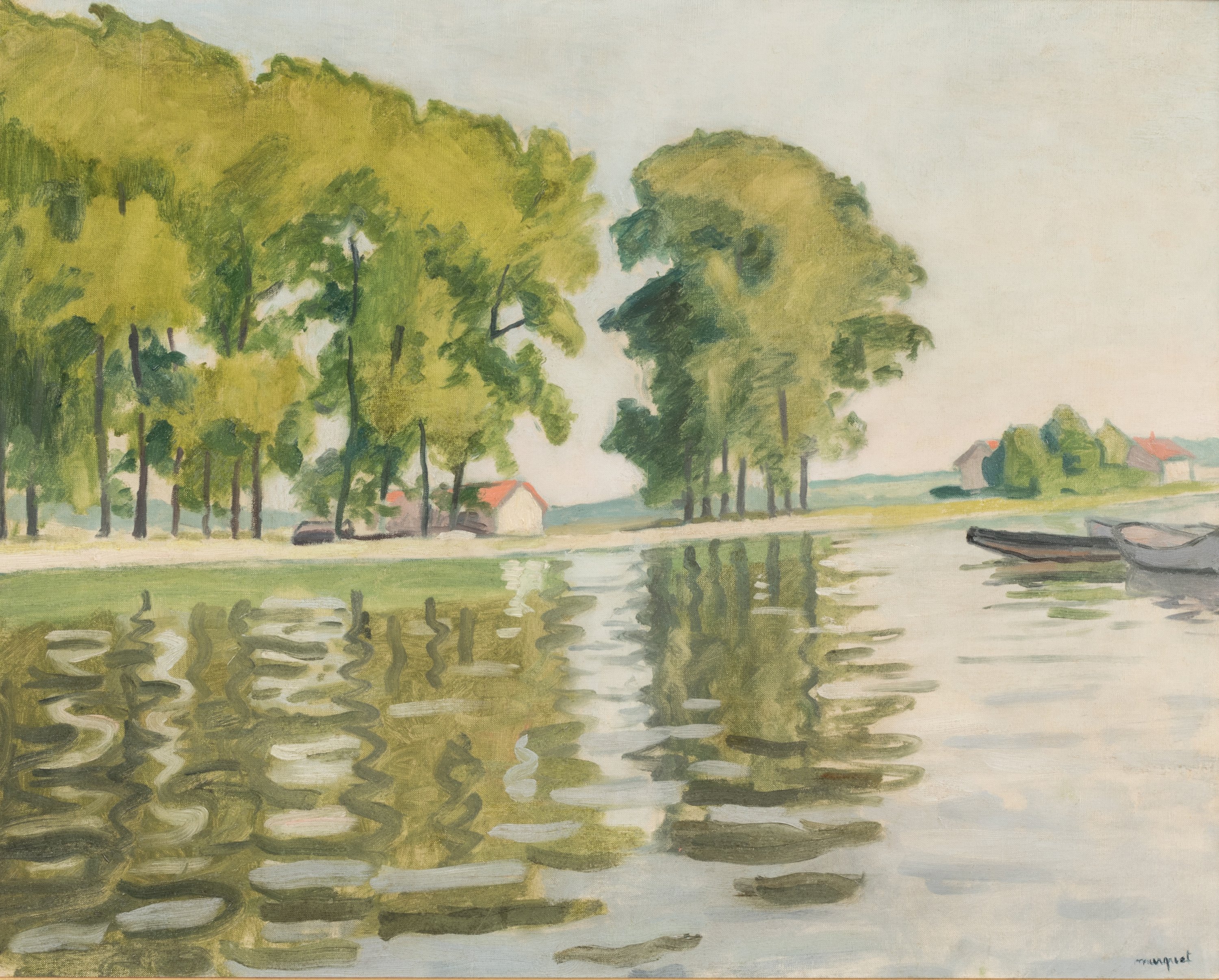Marquet saffranchit de toute convention théorique, livrant des paysages qui synthétisent la nature. Le peintre se démarque des grands courants artistiques, bien qu'il leur doive tout. En 1875, date de sa naissance, la peinture de paysage jouit dun engouement sans précédent. Comme pour tant dautres à cette époque, leau est un sujet obsessionnel. Le reflet des arbres, comme pour Monet, inspire à Marquet de puissantes compositions doublement inversées.