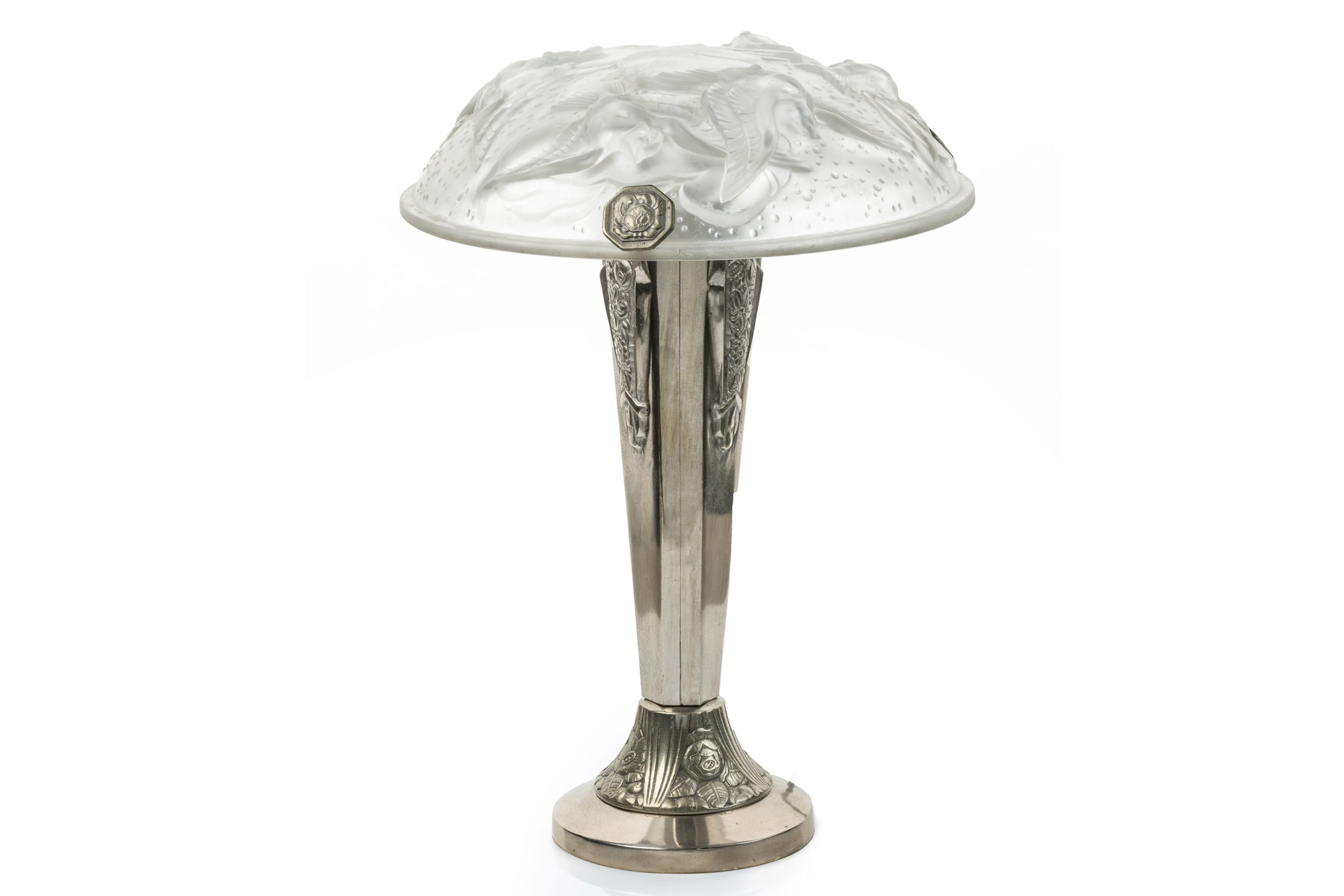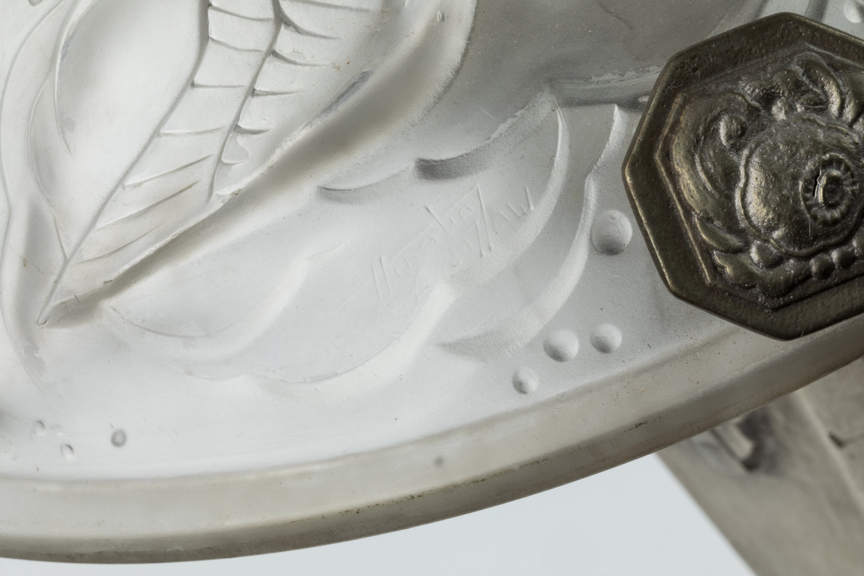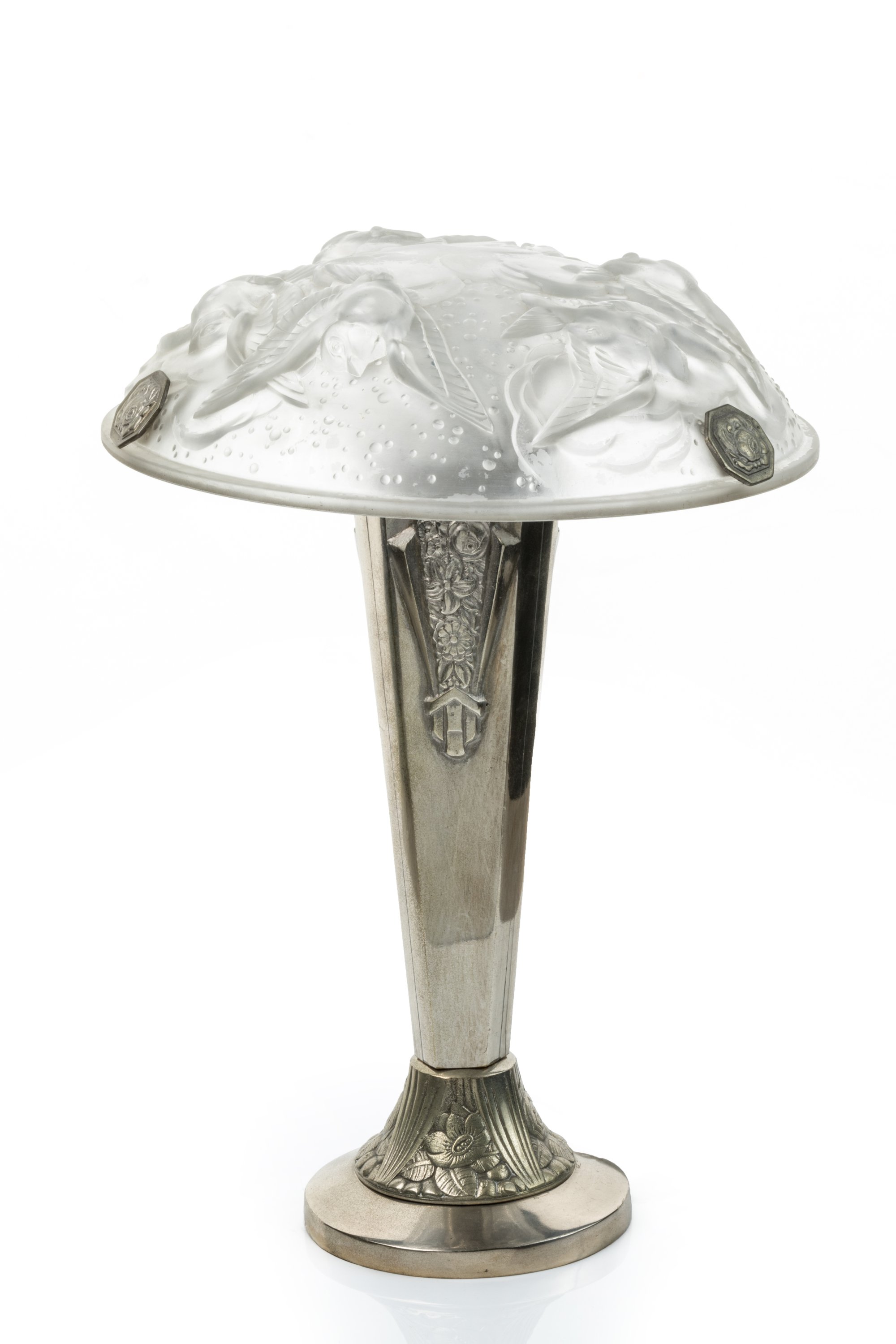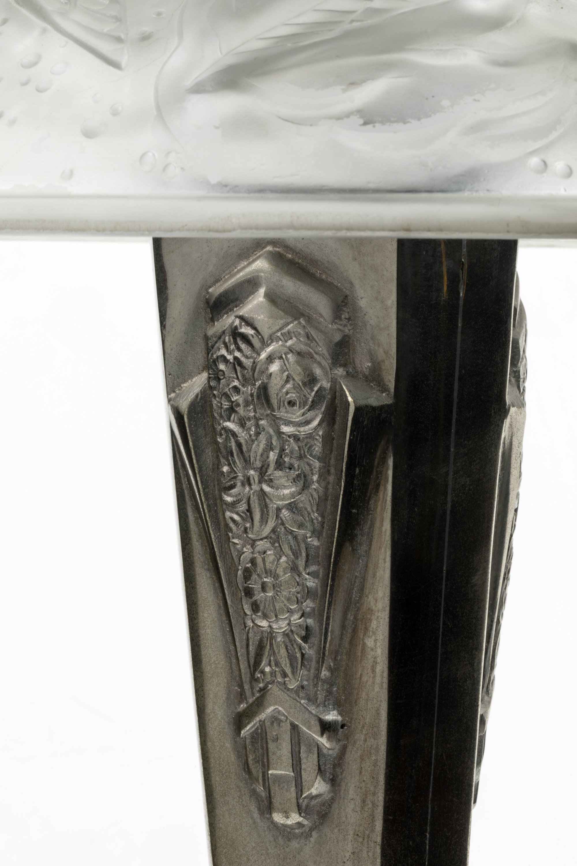 en métal et verre moulé incolore. Verre en dôme renversé figurant des oiseaux dans les nuages. Montant en gaine orné de trophées de fleurs. Ombilic orné de feuilles et de fleurs. Piétement circulaire.
