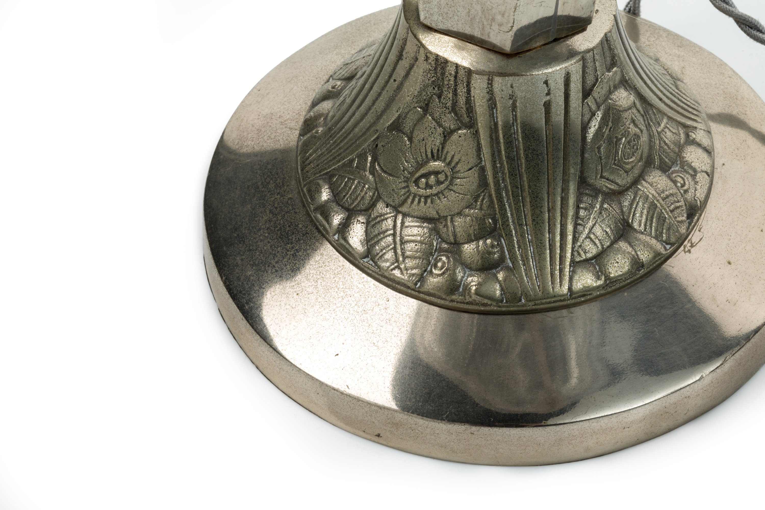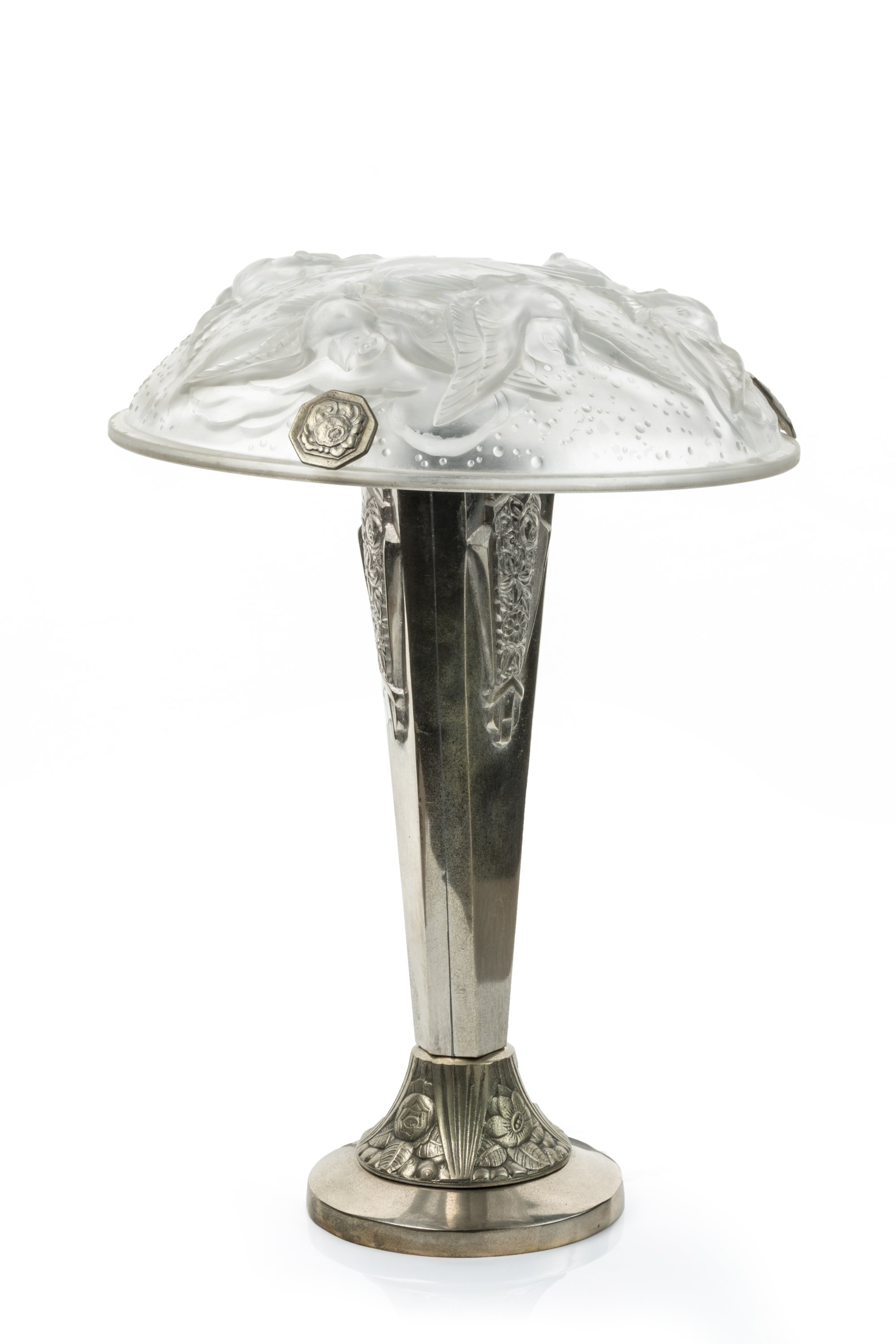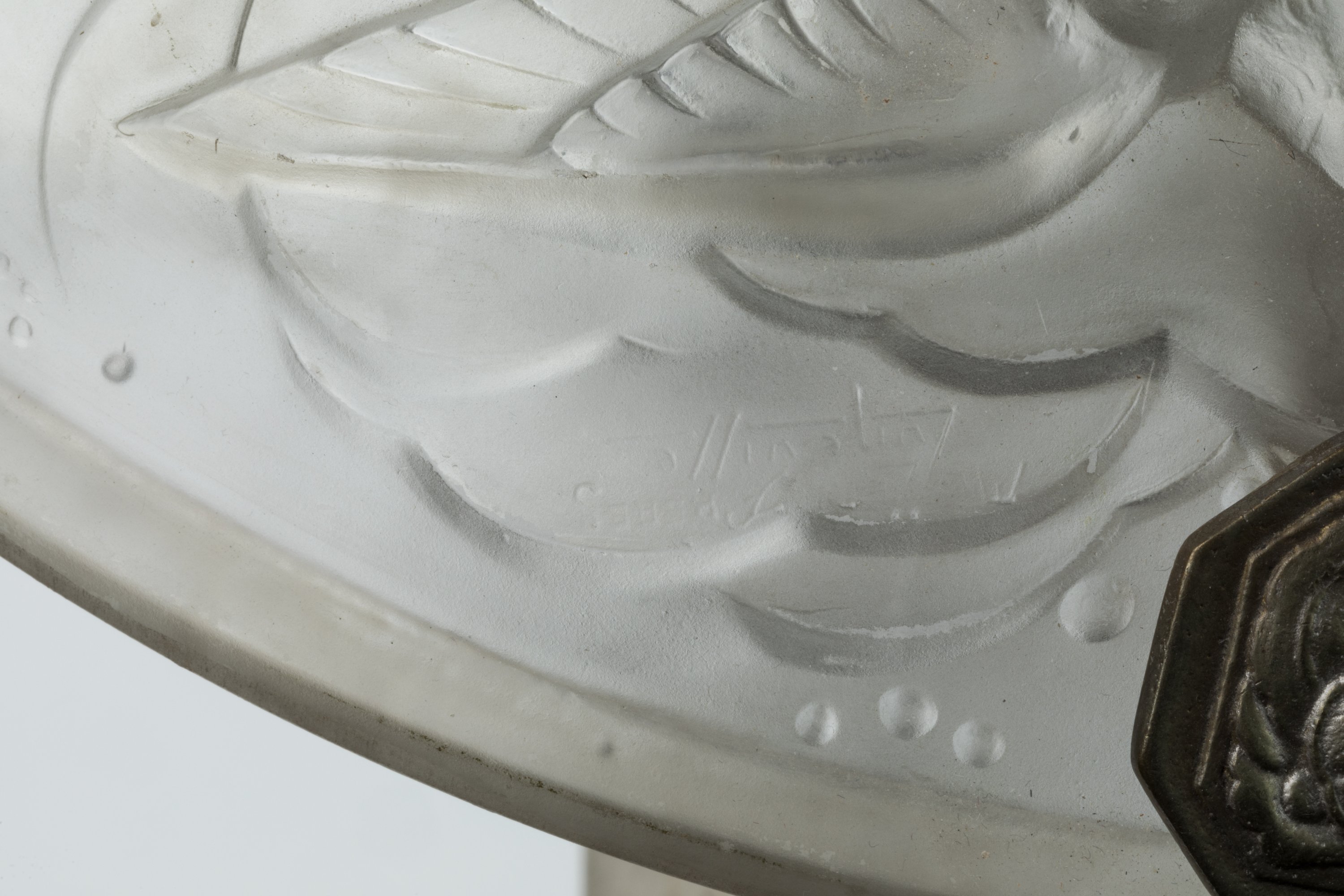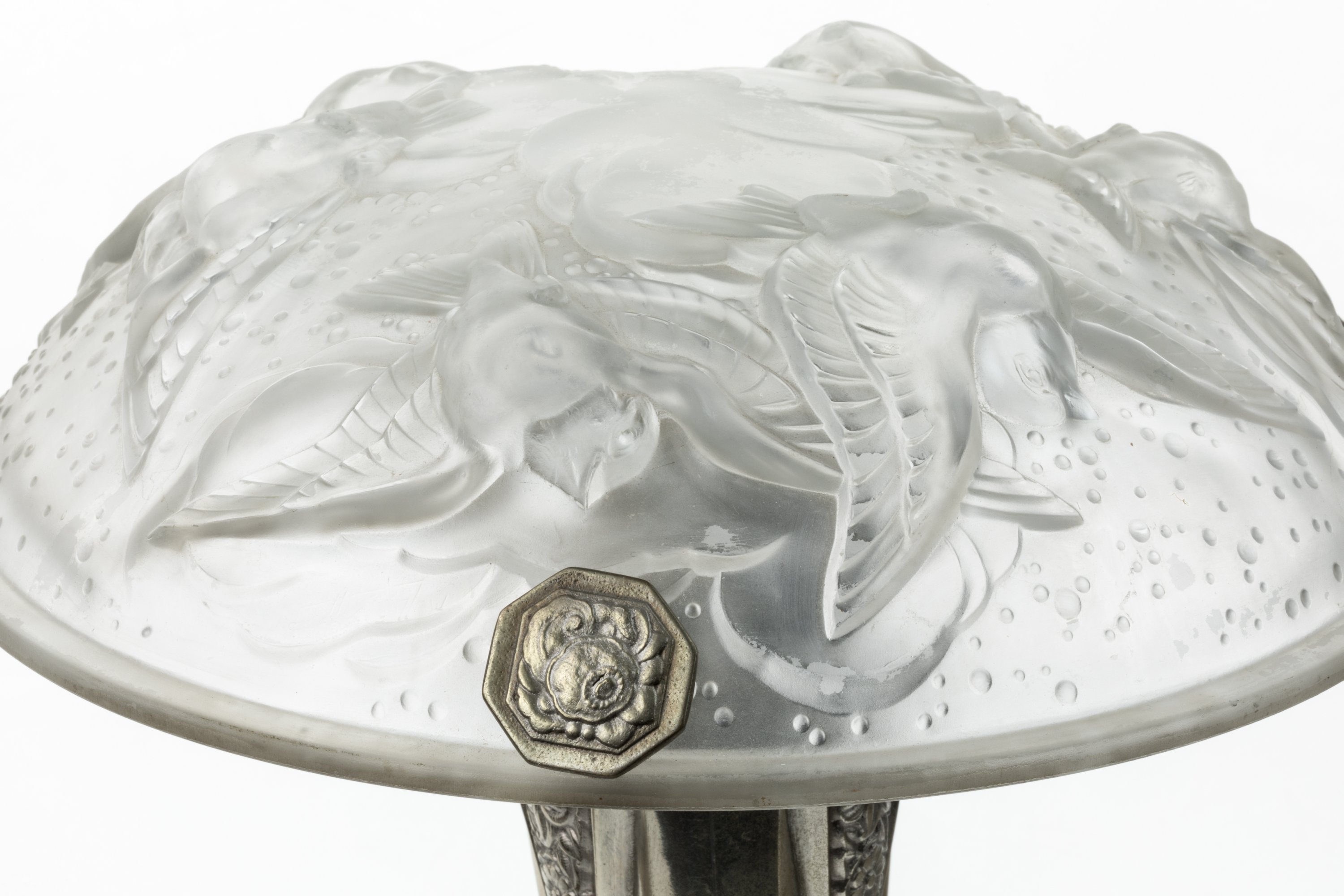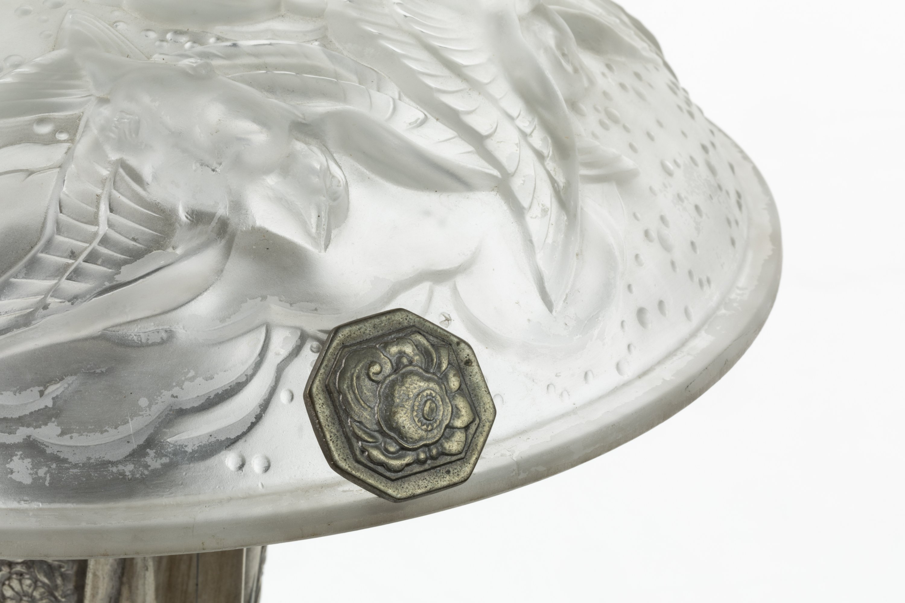 en métal et verre moulé incolore. Verre en dôme renversé figurant des oiseaux dans les nuages. Montant en gaine orné de trophées de fleurs. Ombilic orné de feuilles et de fleurs. Piétement circulaire.