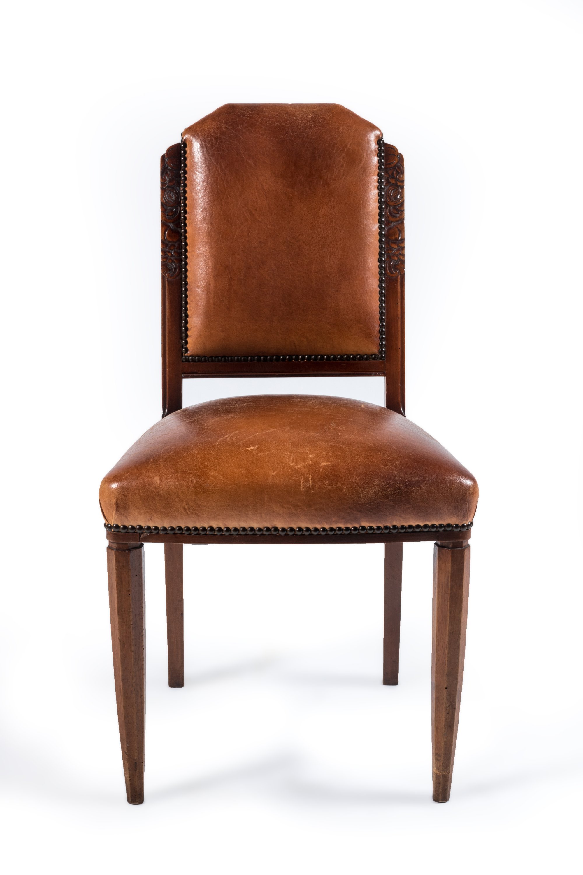 en noyer sculpté de motifs végétaux et floraux sur les montant de l'assise. L'assise et le dossier à pans coupés sont garnis de cuir brun. Les pieds antérieurs octogonaux sont fuselés.