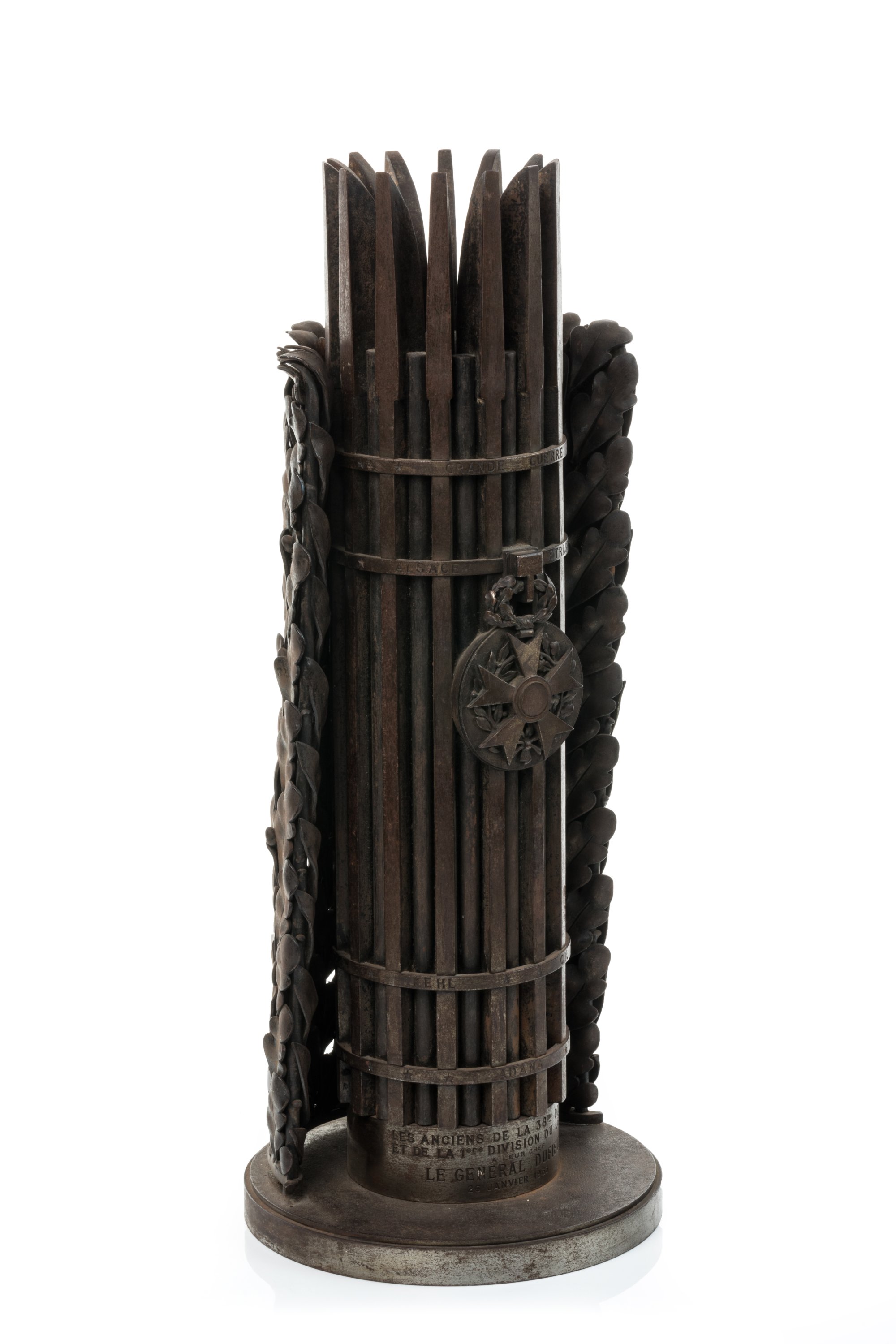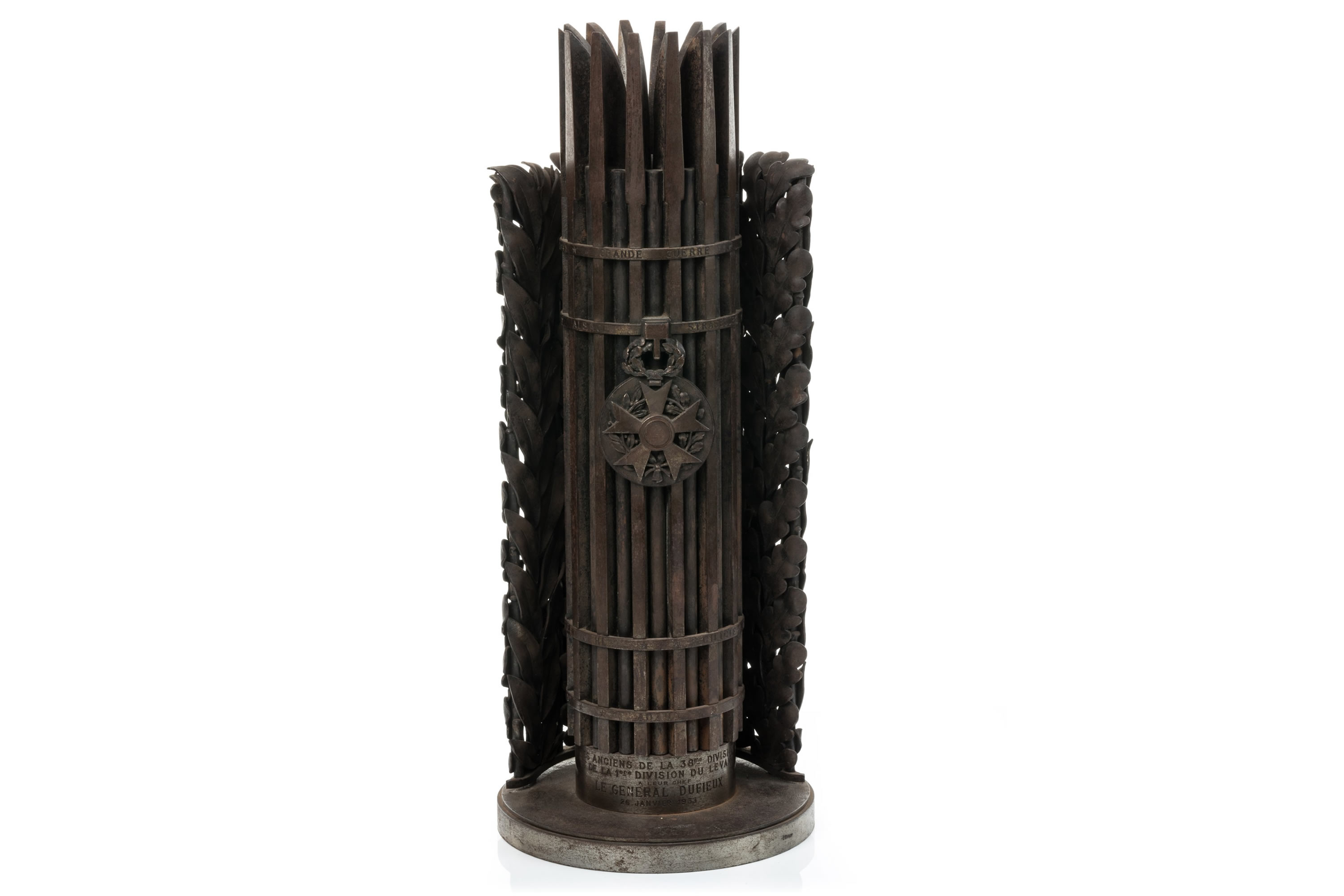 en acier et fer forgé. Dans un faisceau de lances avec une médaille de la Légion d'honneur entourée de feuilles de laurier et de chêne est inscrit : 'Les anciens de la 38ème division / et de la 1ère Division du Levant / à leur chef / le Général Dufieux / 26 janvier 1933" en mémoire de la "Grande Guerre / Alsace Strasbourg" pour les batailles de "Kehl / Cilicie / Adana".