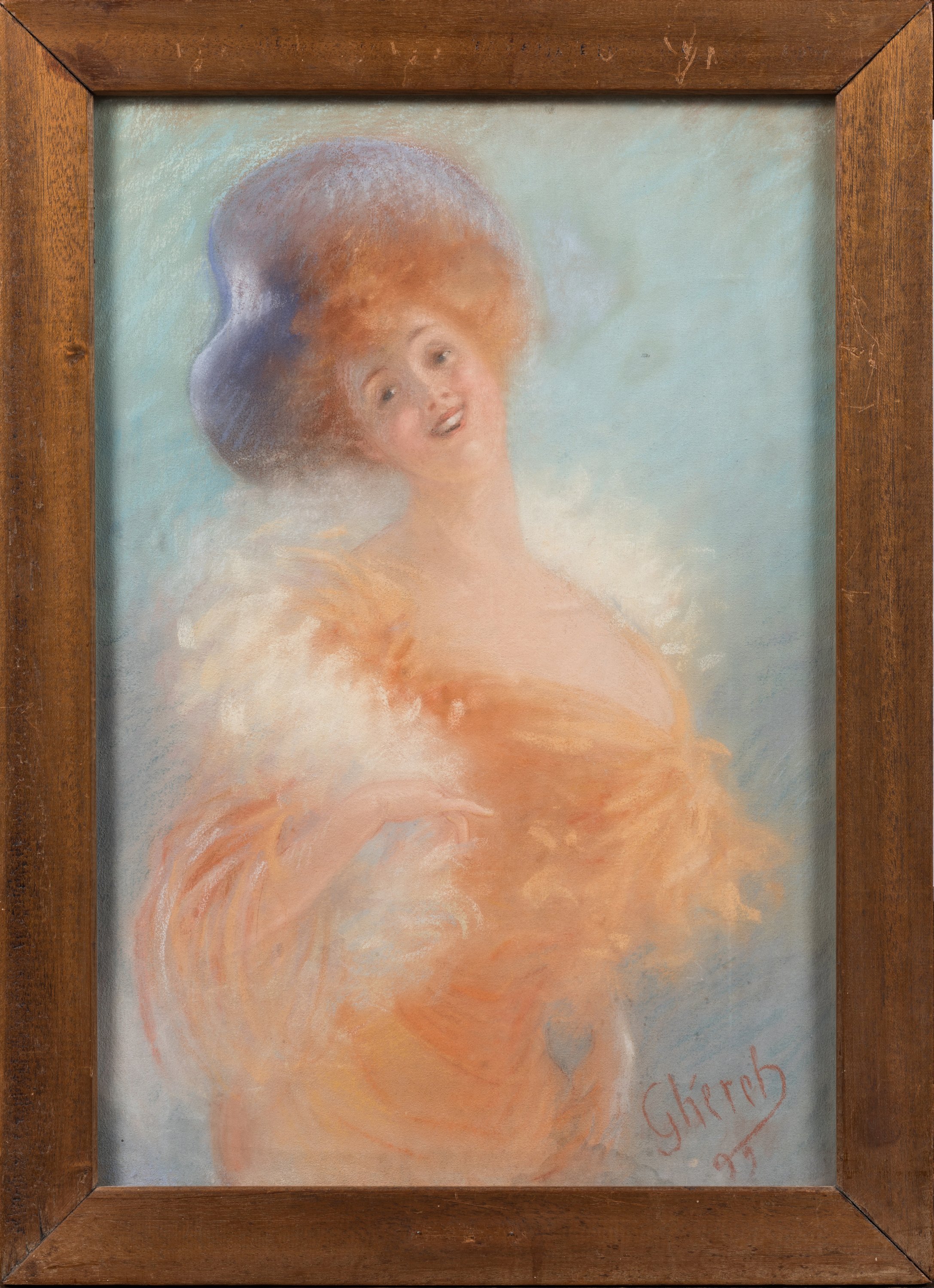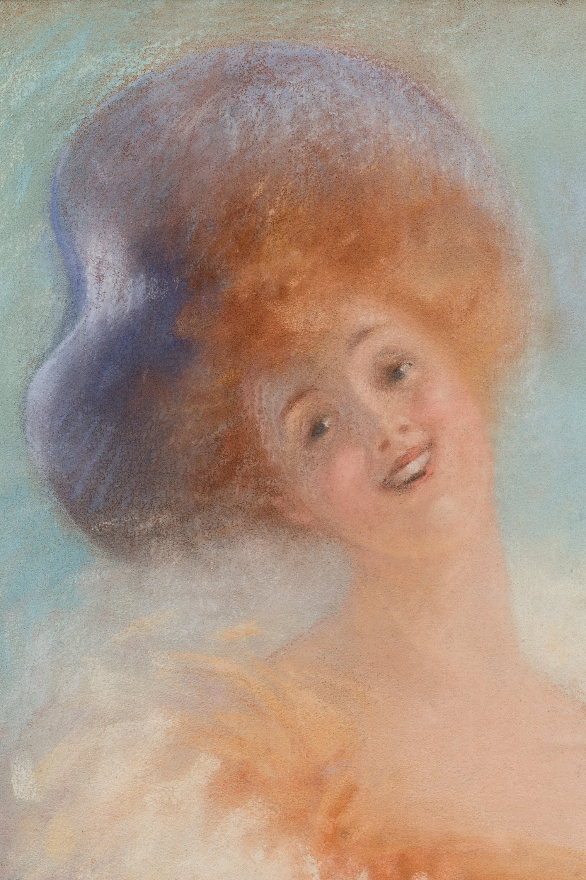 En présentant son modèle sur un fond bleu, Chéret « traduit laspect solaire de la femme » de son temps. Les traits de notre "Chérette rousse" à la forme serpentine ne sont pas sans rappeler ceux dArlette Dorgère, artiste du Casino de Paris. Cette dernière inspire lartiste à plusieurs reprises pour la réalisation de tableaux et affiches (cf. Portrait, 1904, Pastel, Nice, Musée des Beaux-Arts, in Jules Chéret Collection du musée des Beaux Arts de Nice, p. 33).