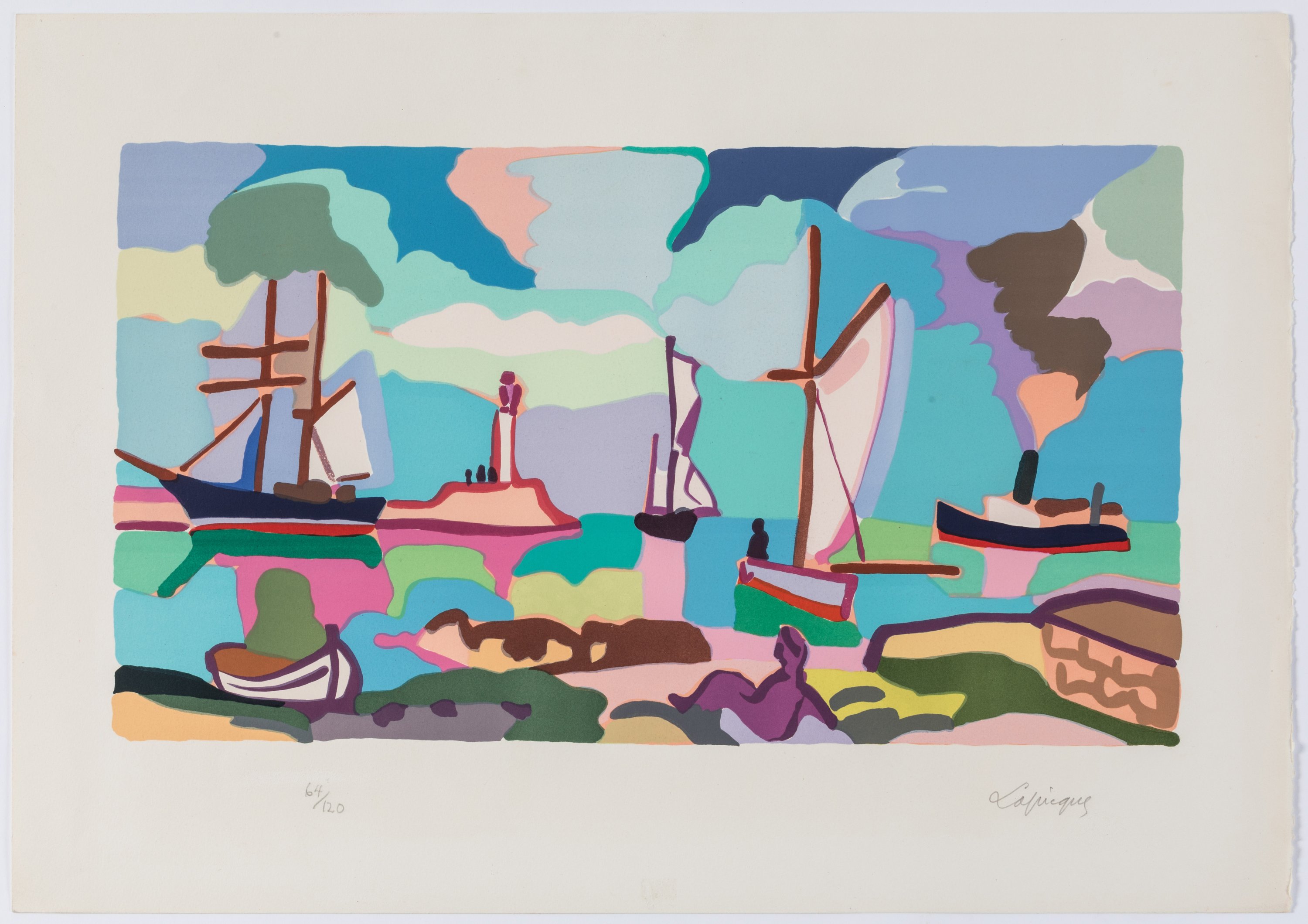 JOINT : Charles Lapicque (Français, 1898-1988), Hommage à Boudin, lithographie en couleurs, signée au crayon en bas à droite et justifiée "64/120" en bas à gauche. Haut. 47 Larg. 65 cm. Bibliographie : Bernard Balanci et George Blache, "Charles Lapicque : catalogue raisonné de l'oeuvre complet des lithographies - eaux-fortes et gravures", Béziers, 1981, n°424, p. 112.