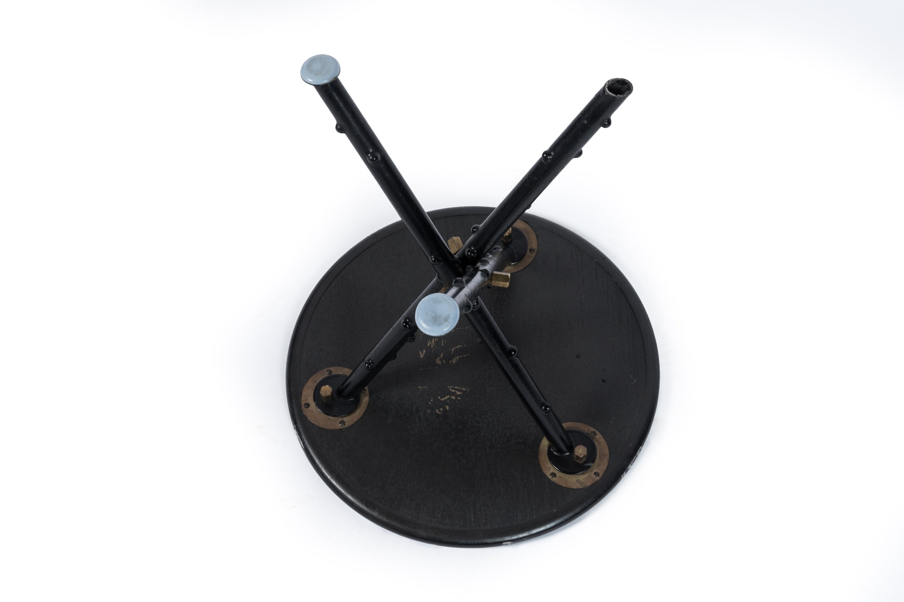 en tôle lithographiée, sur un plateau de bois circulaire reposant sur un piétement tripode en métal laqué noir à motifs de bourgeons.