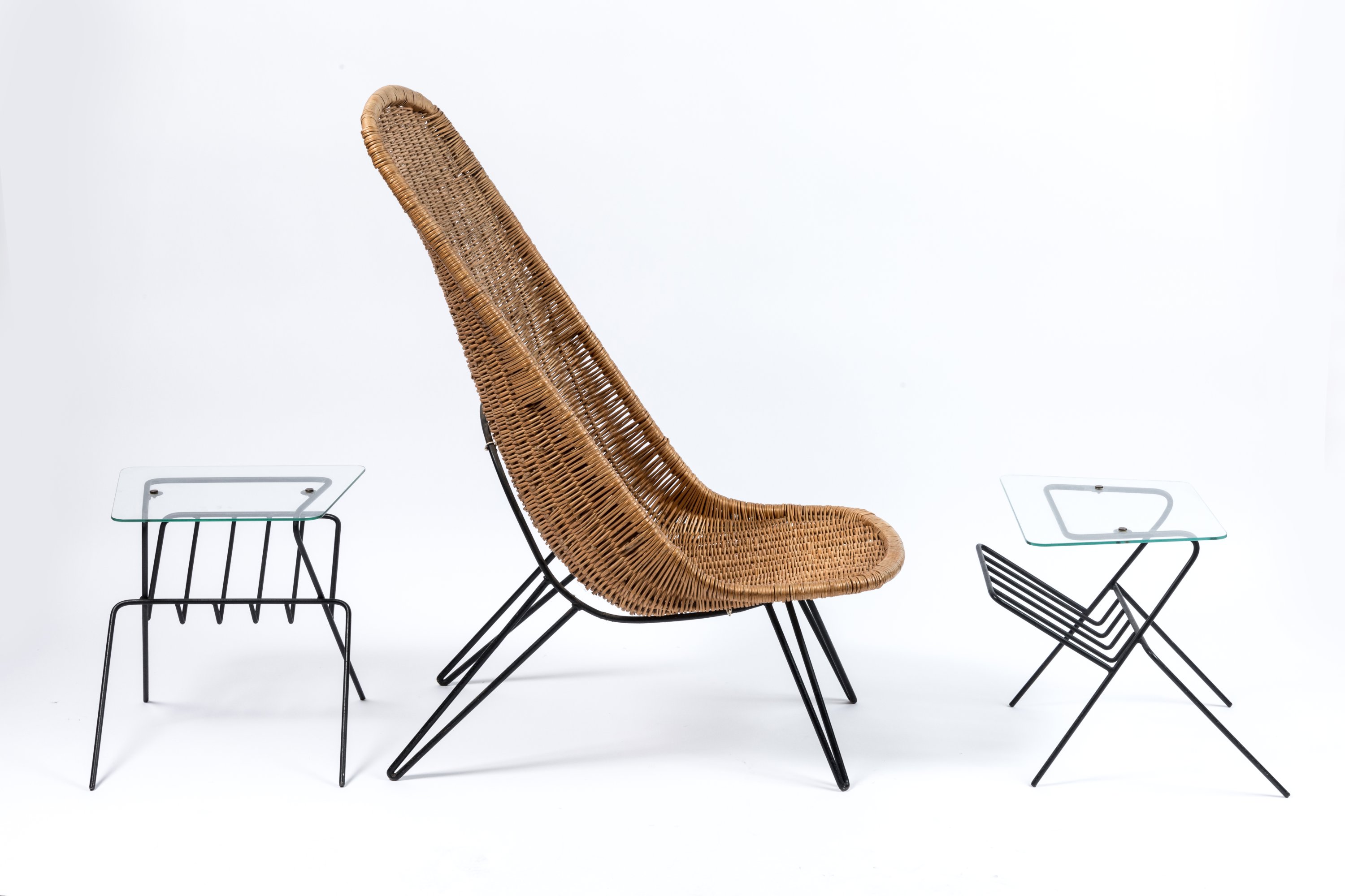 en rotin tressé et piétement tubulaire laqué noir.