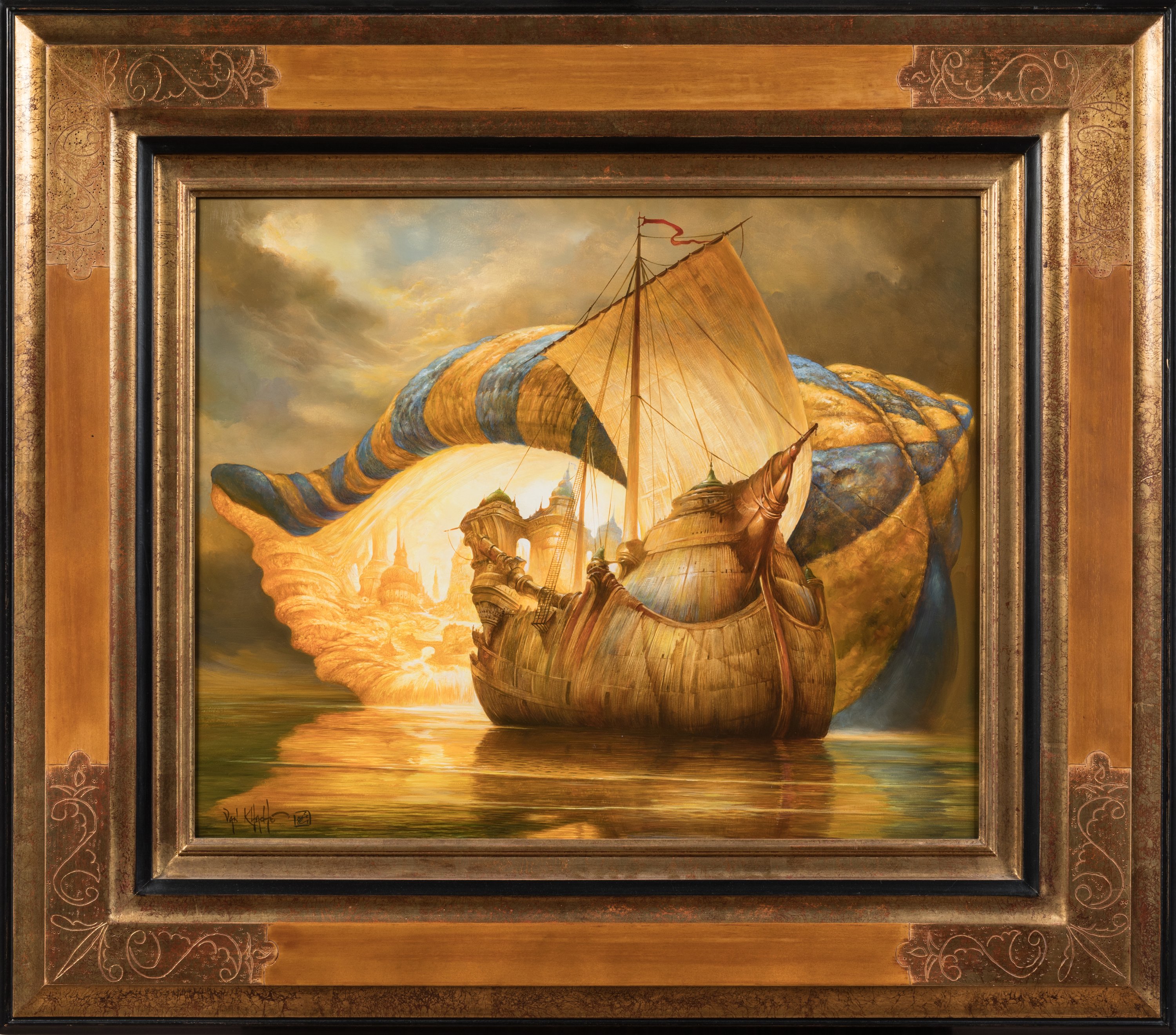 Toile signée en bas à gauche, titrée et signée au dos, avec des idéogrammes pour le marché asiatique.