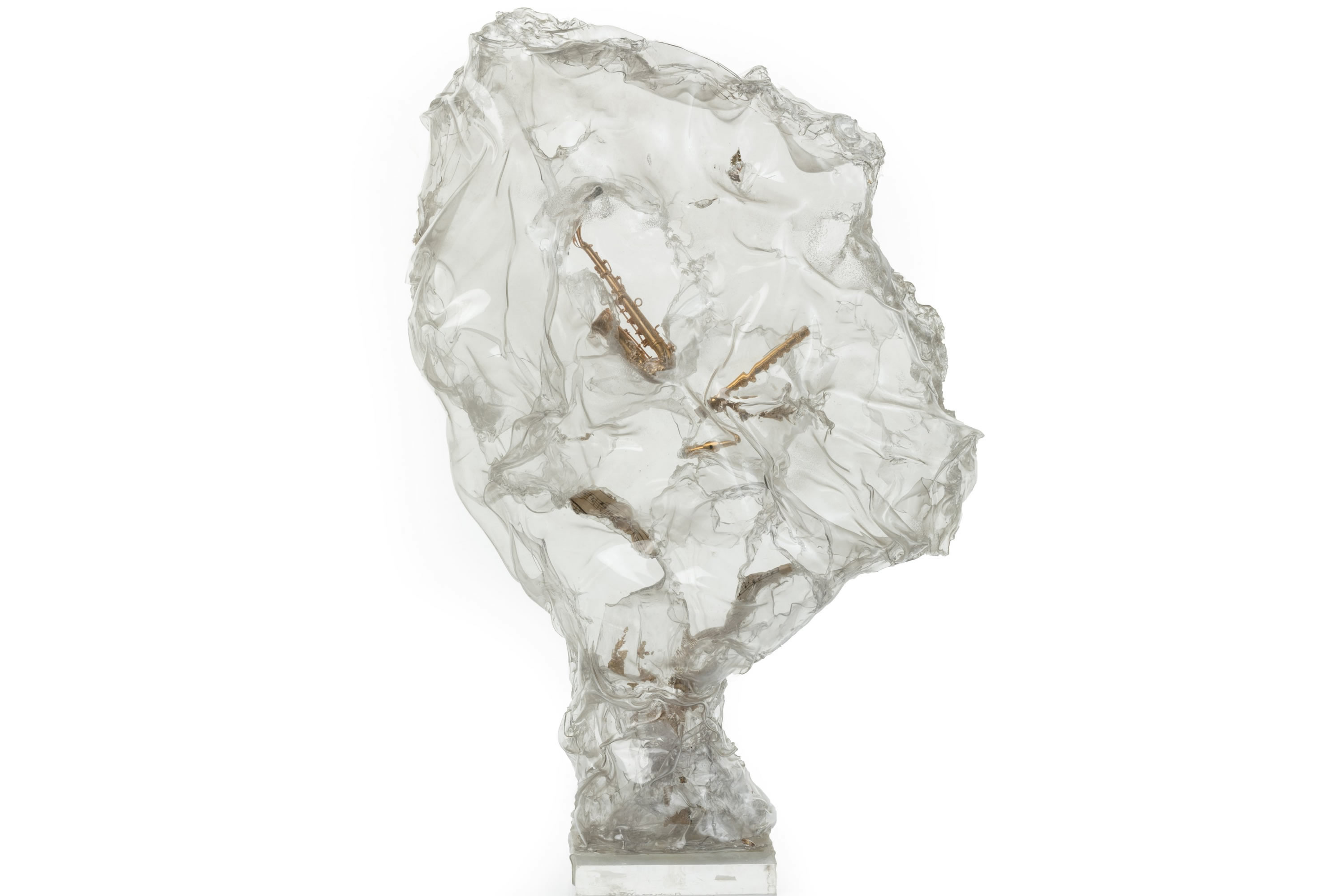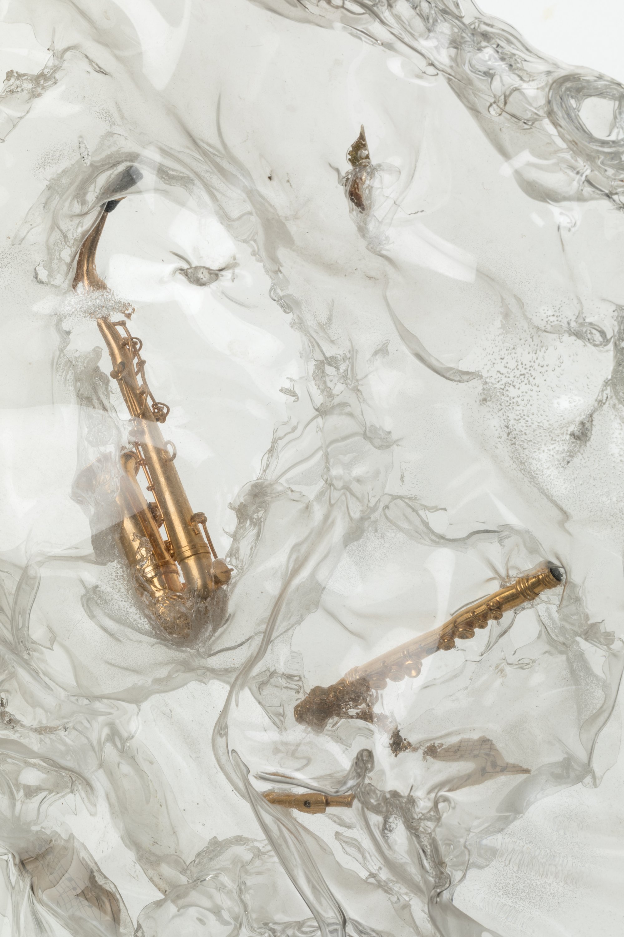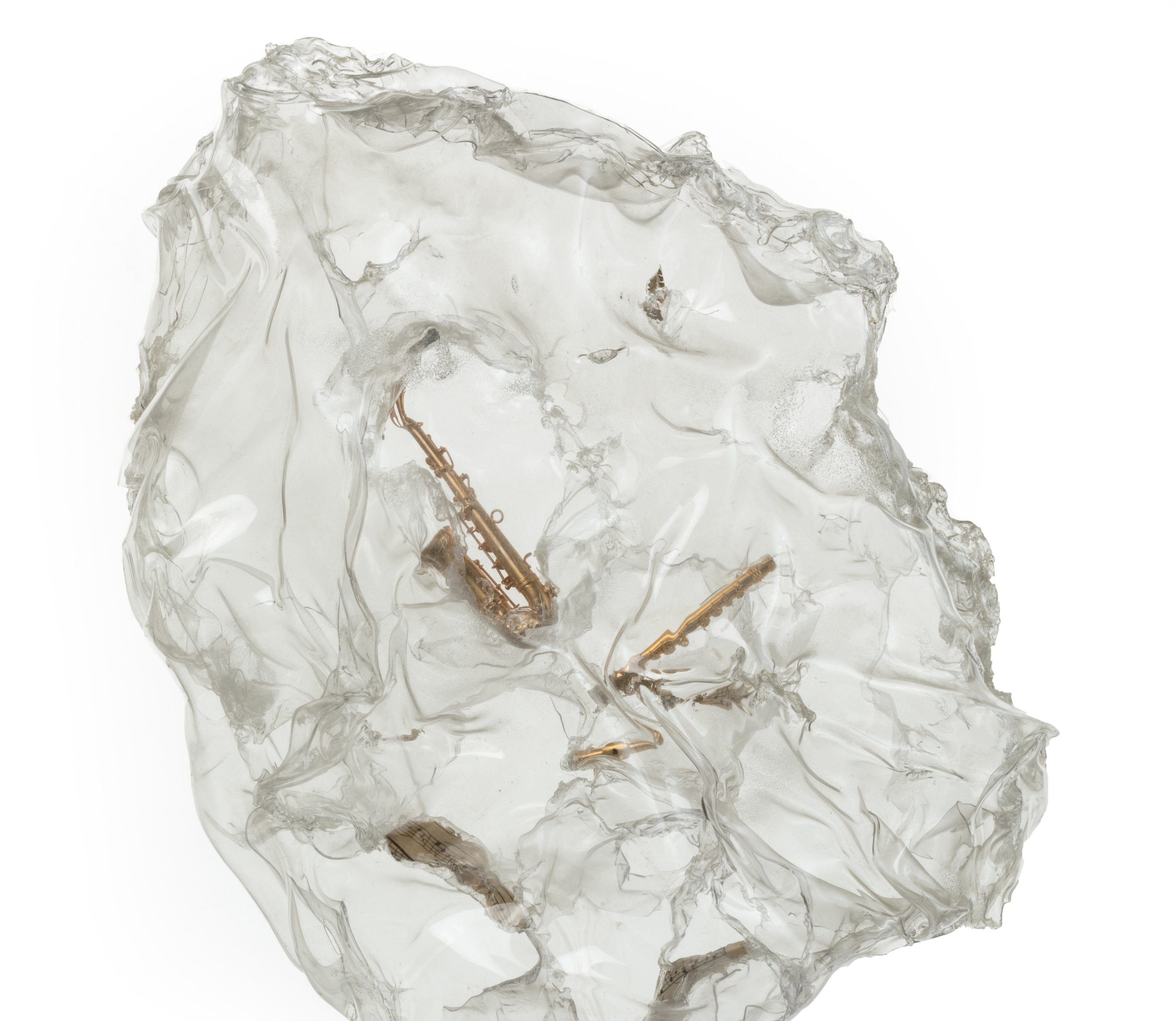 Plastique travaillé au chalumeau avec incrustation d'instruments de musique, feuille d'or et partitions.