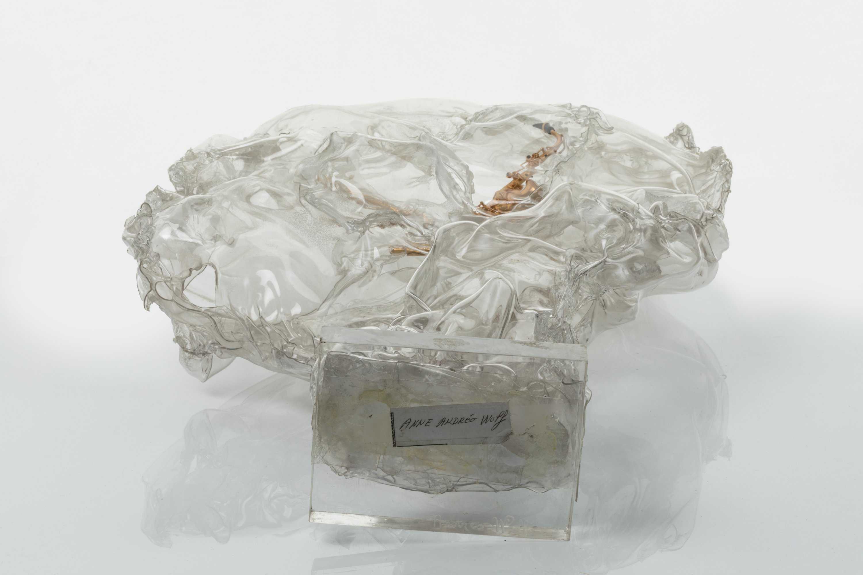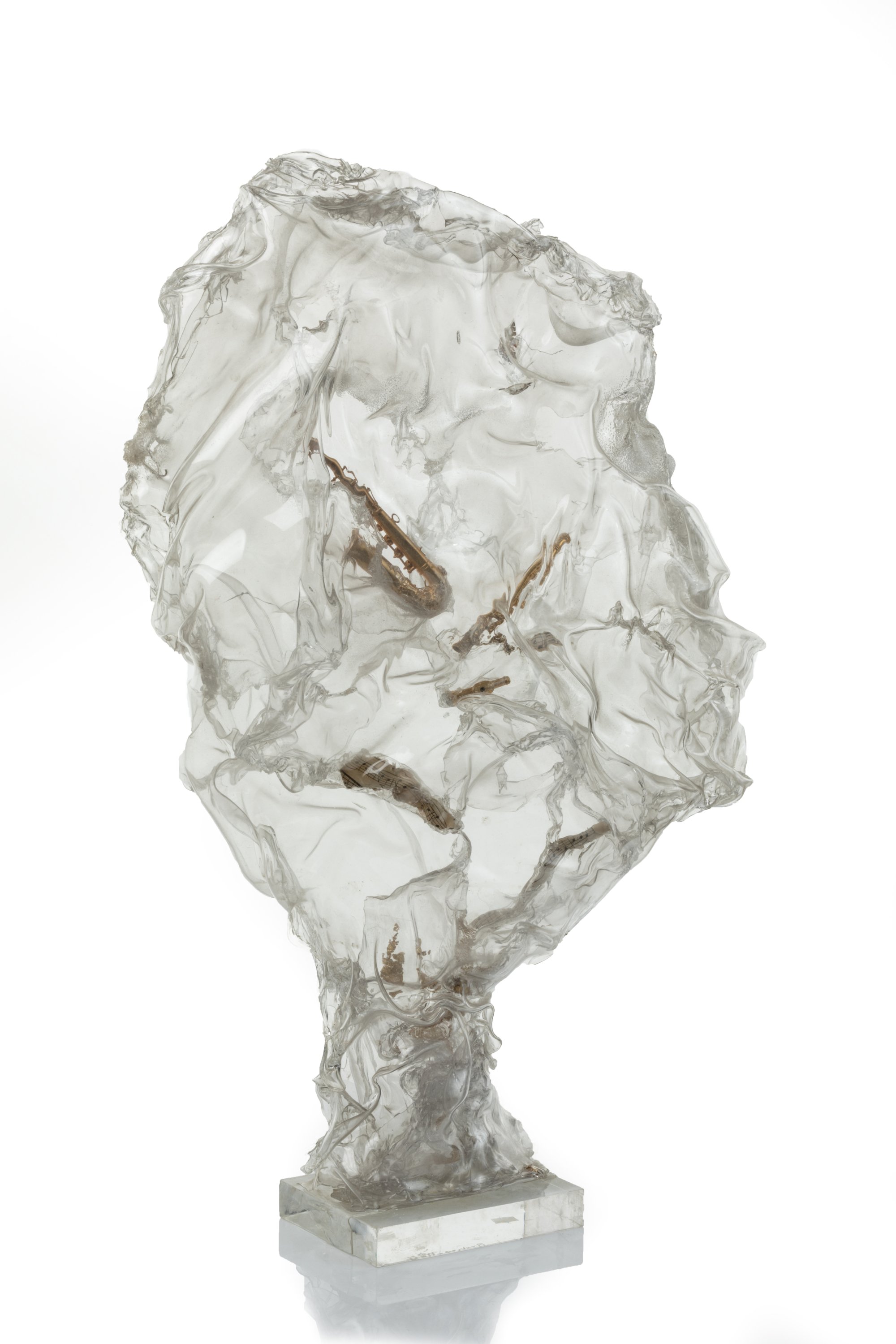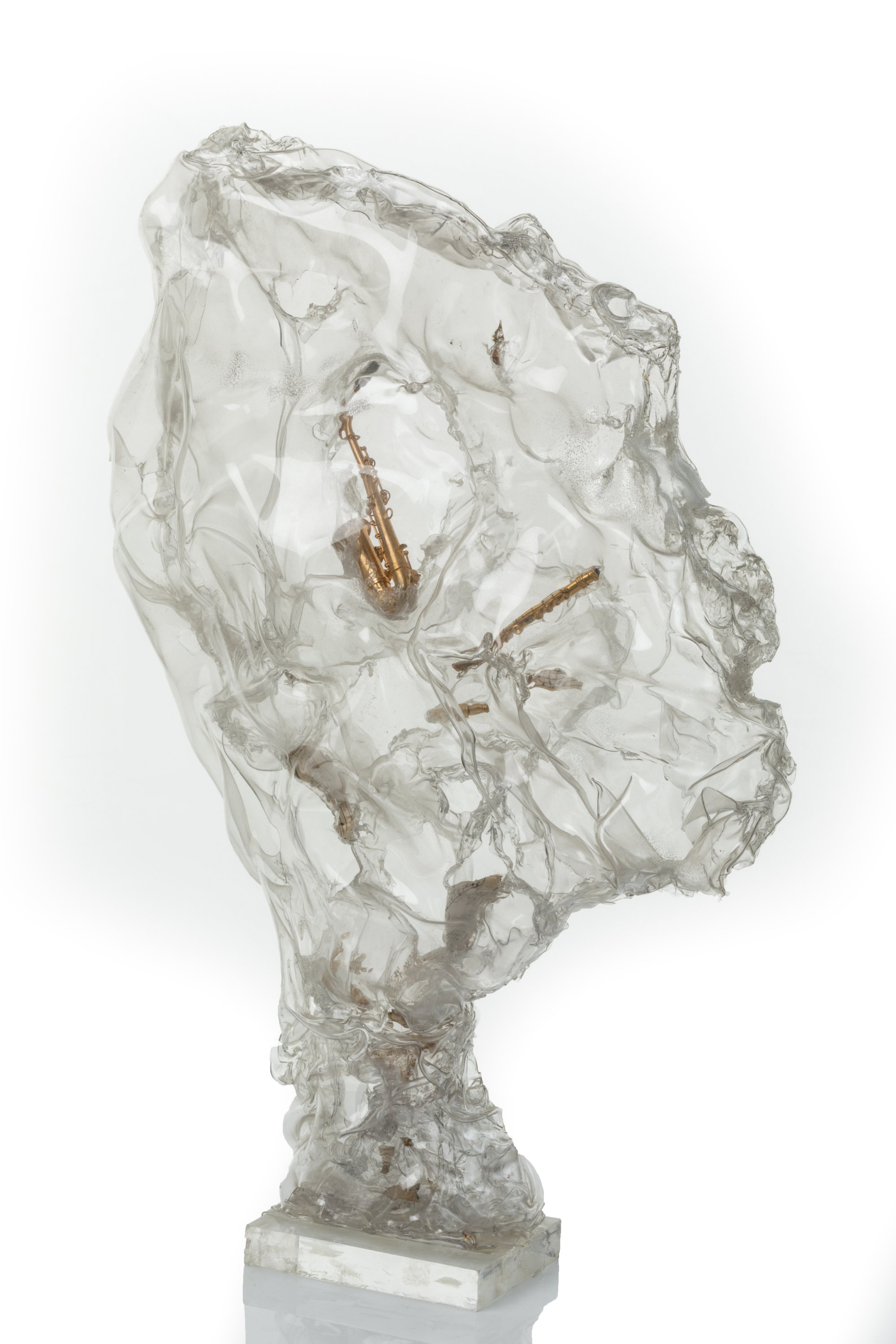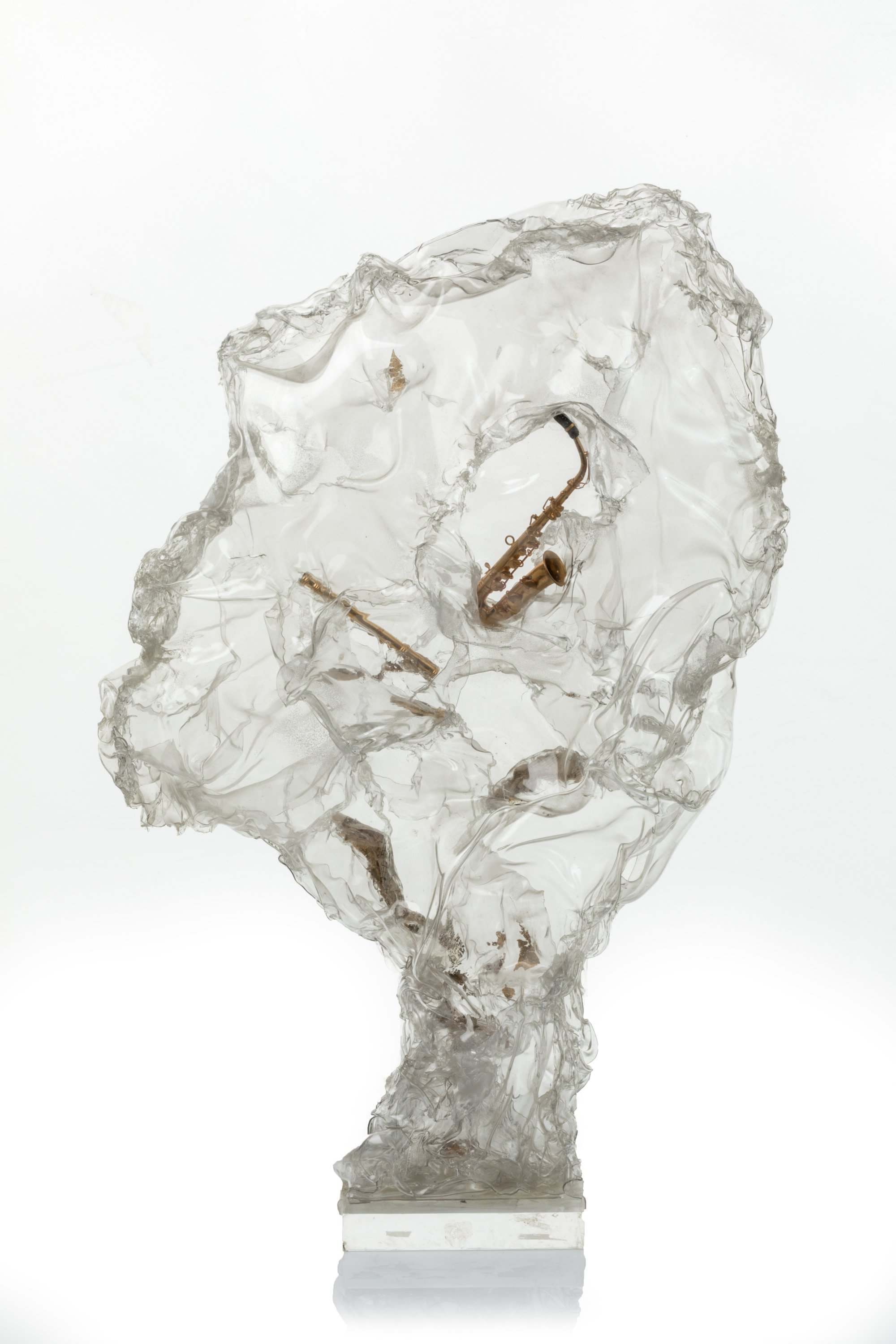 Plastique travaillé au chalumeau avec incrustation d'instruments de musique, feuille d'or et partitions.