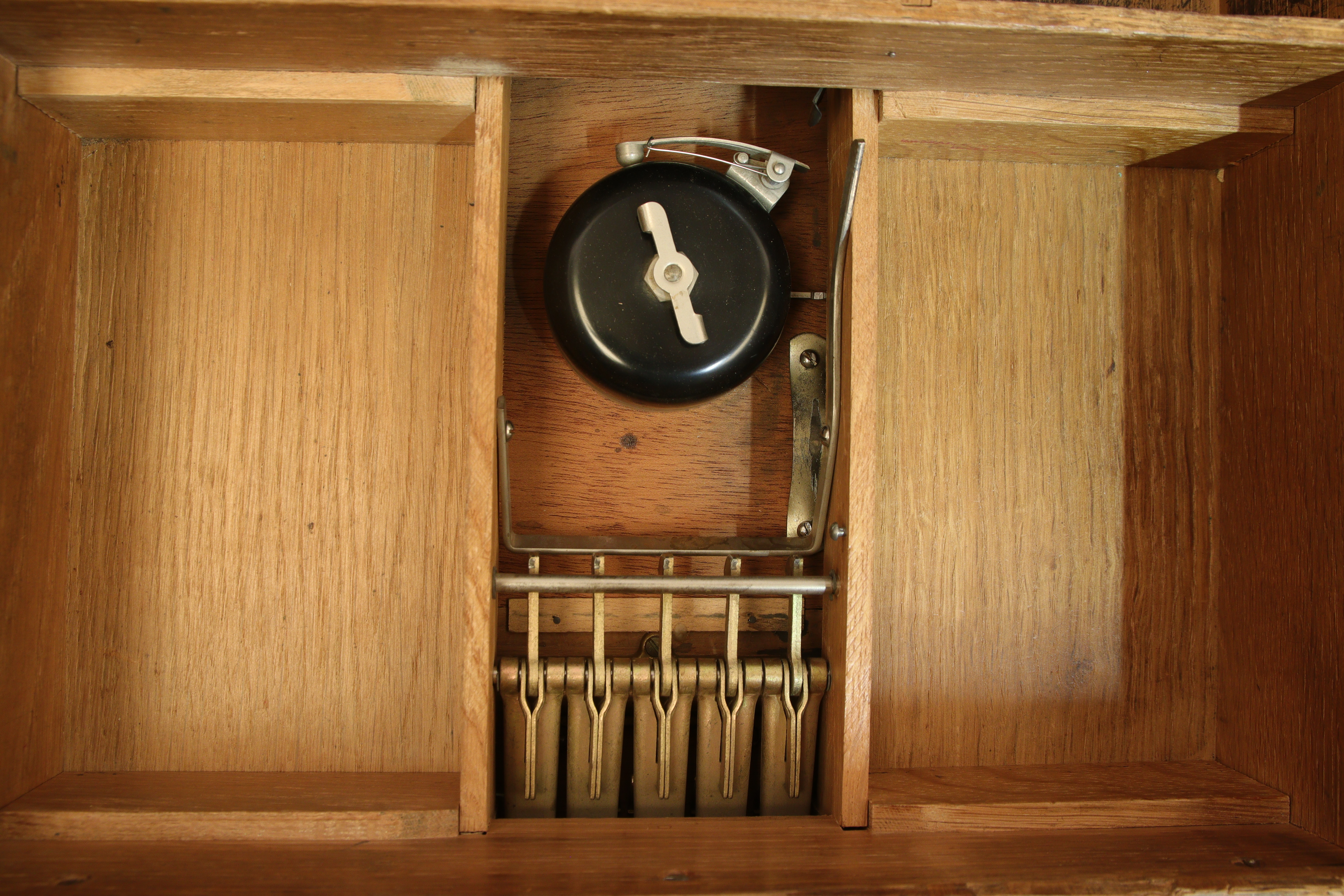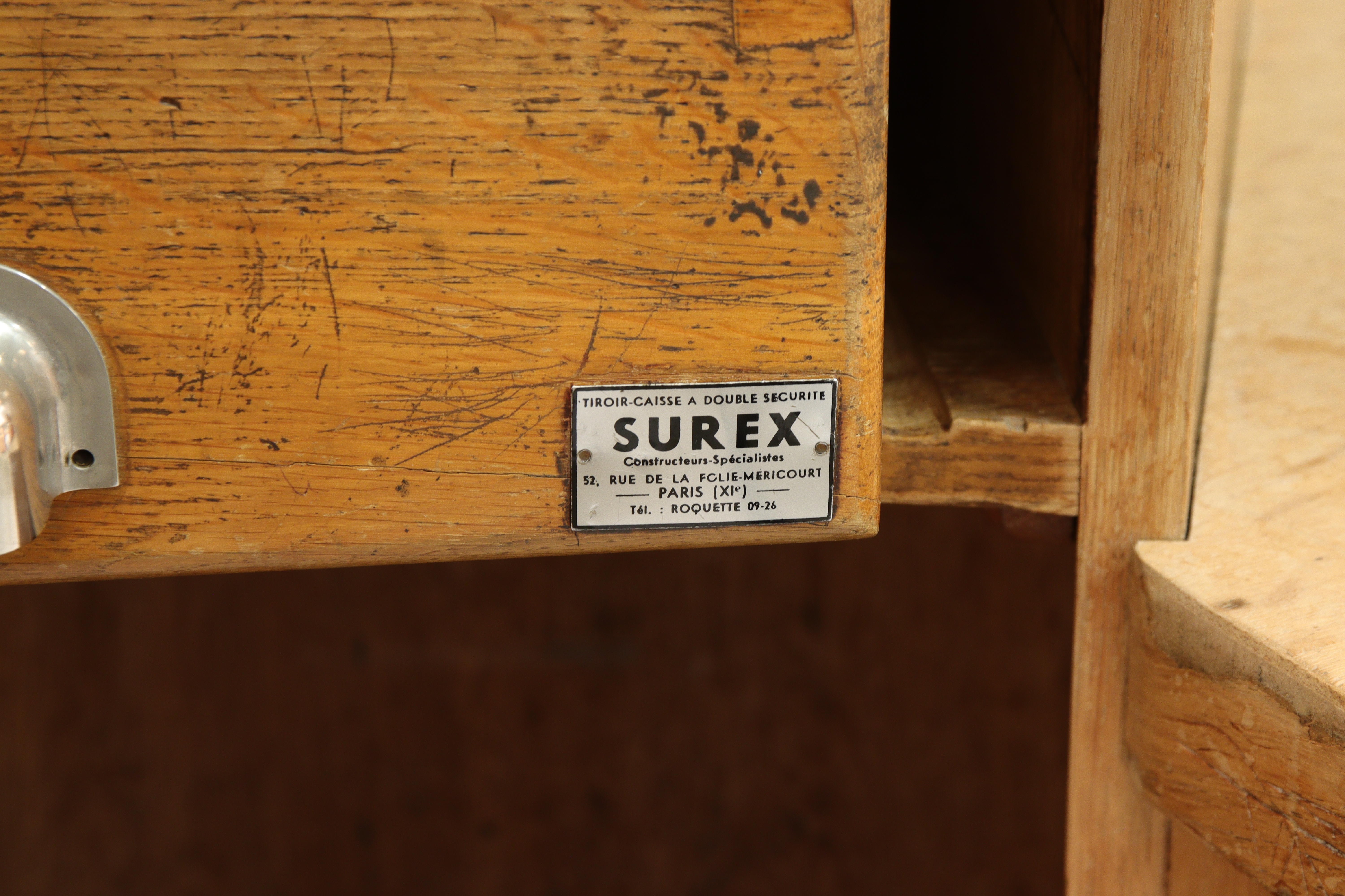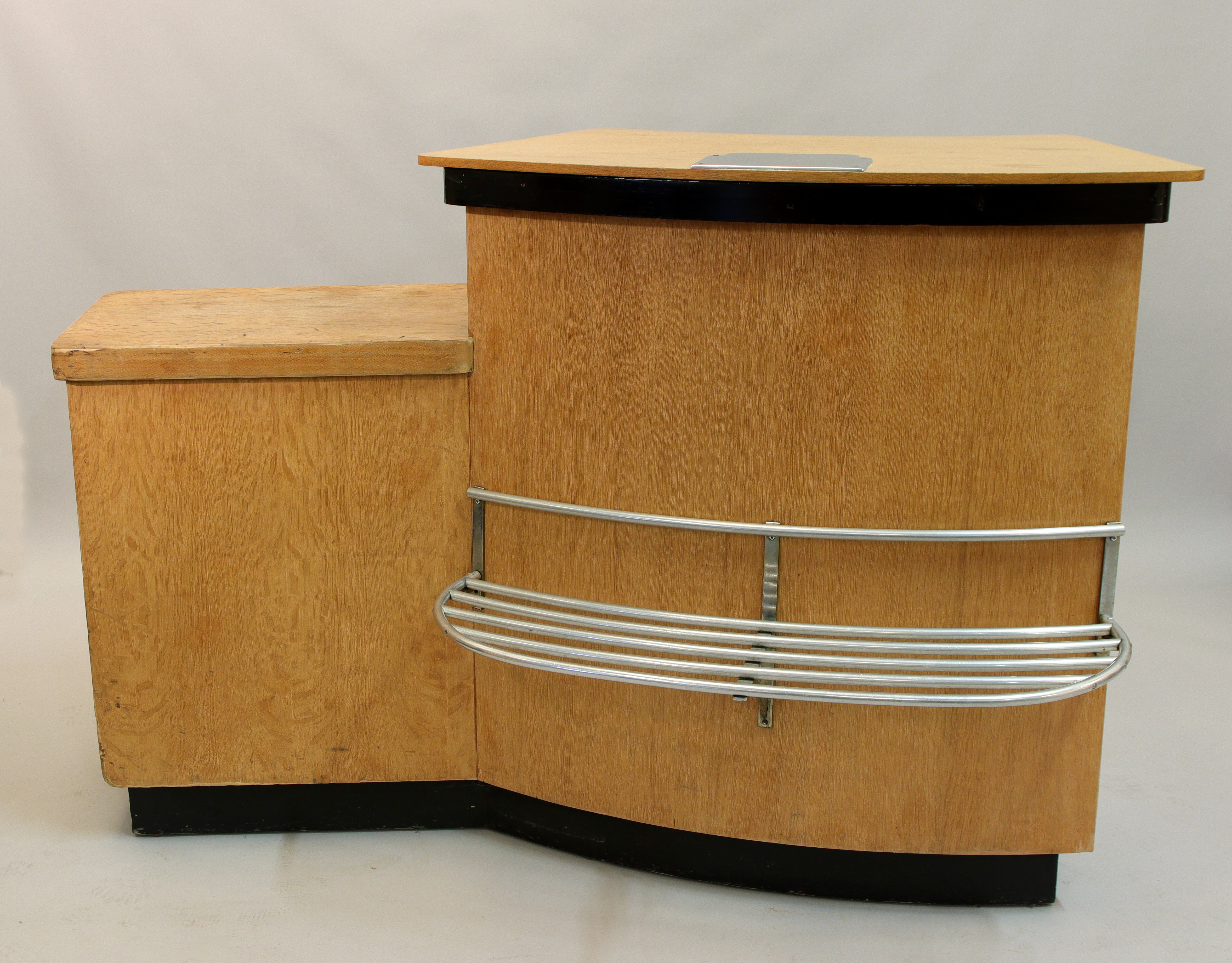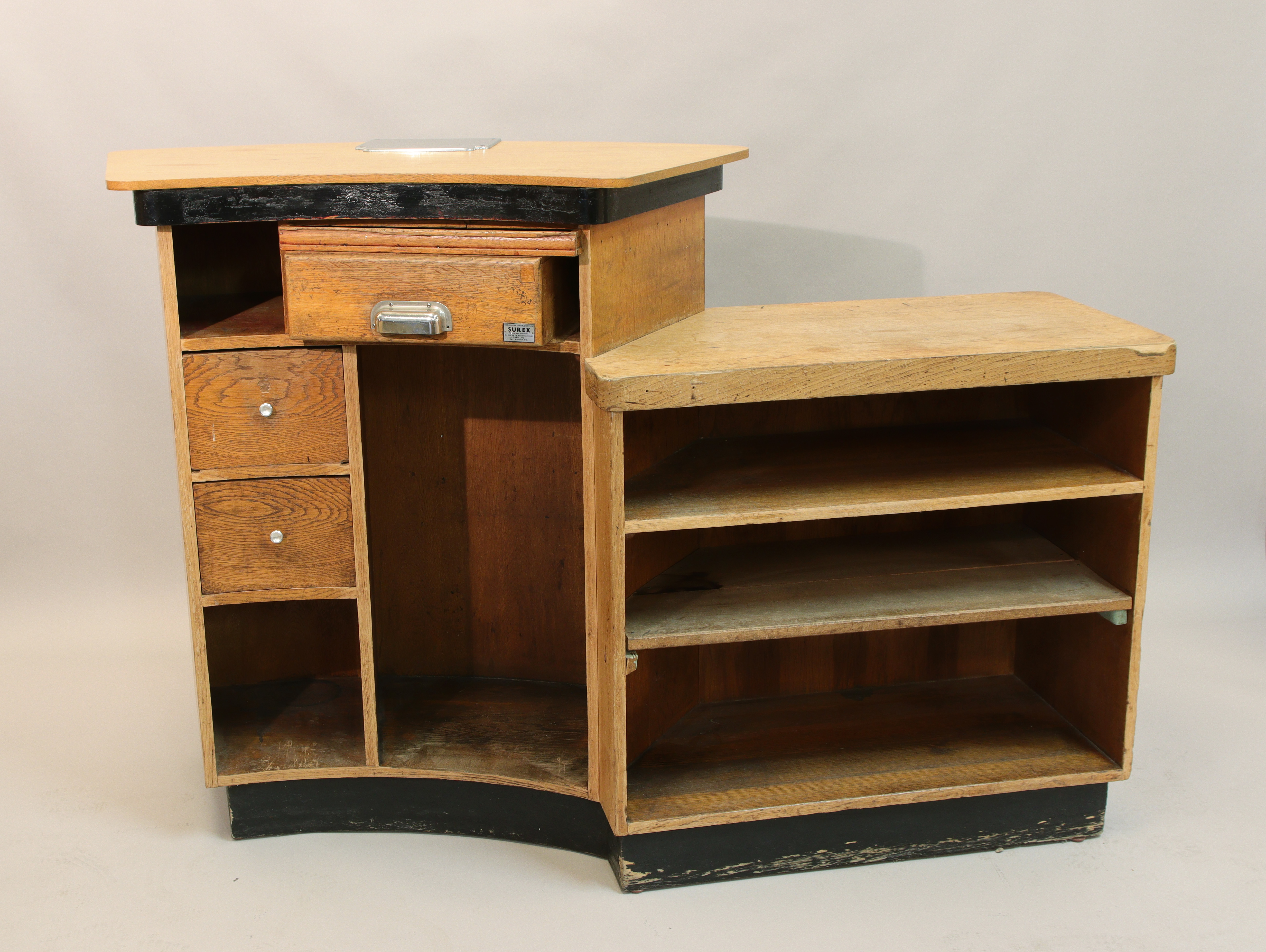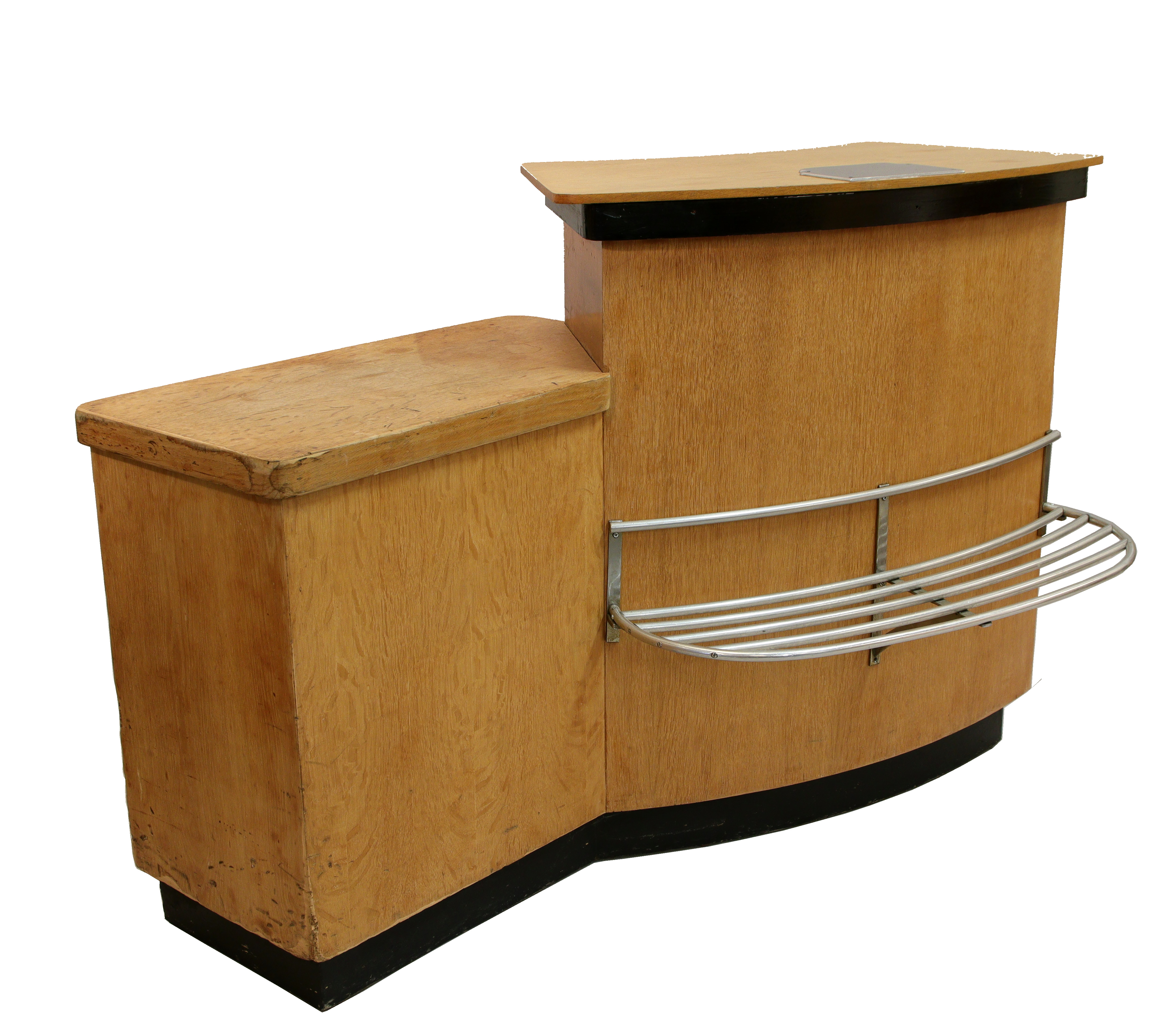 en chêne, placage et aggloméré. De forme arrondie, il présente en façade un reposoir en métal tubulaire . À l'arrière, trois casiers et trois tiroirs dont un tiroir-caisse à double sécurité de marque Surex. Sur le côté une desserte à plateau aux angles arrondis, présentant au revers trois rangs de tiroirs. L'ensemble repose sur une plinthe teintée en noir.