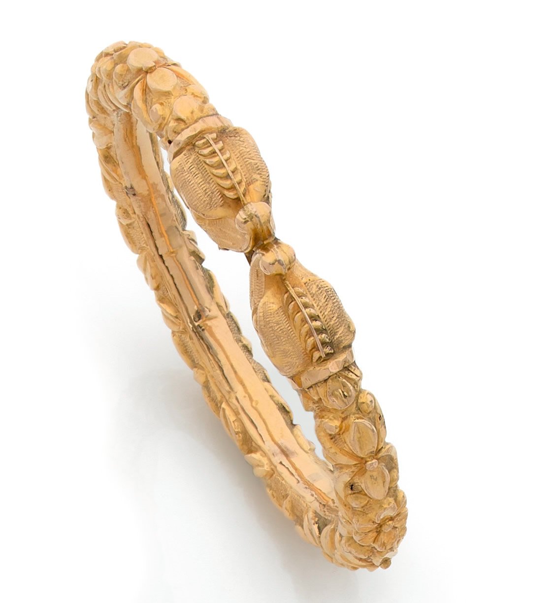 Bracelet rigide en or jaune 750 millièmes gravé, le centre à décor de deux têtes de dragon affrontées.