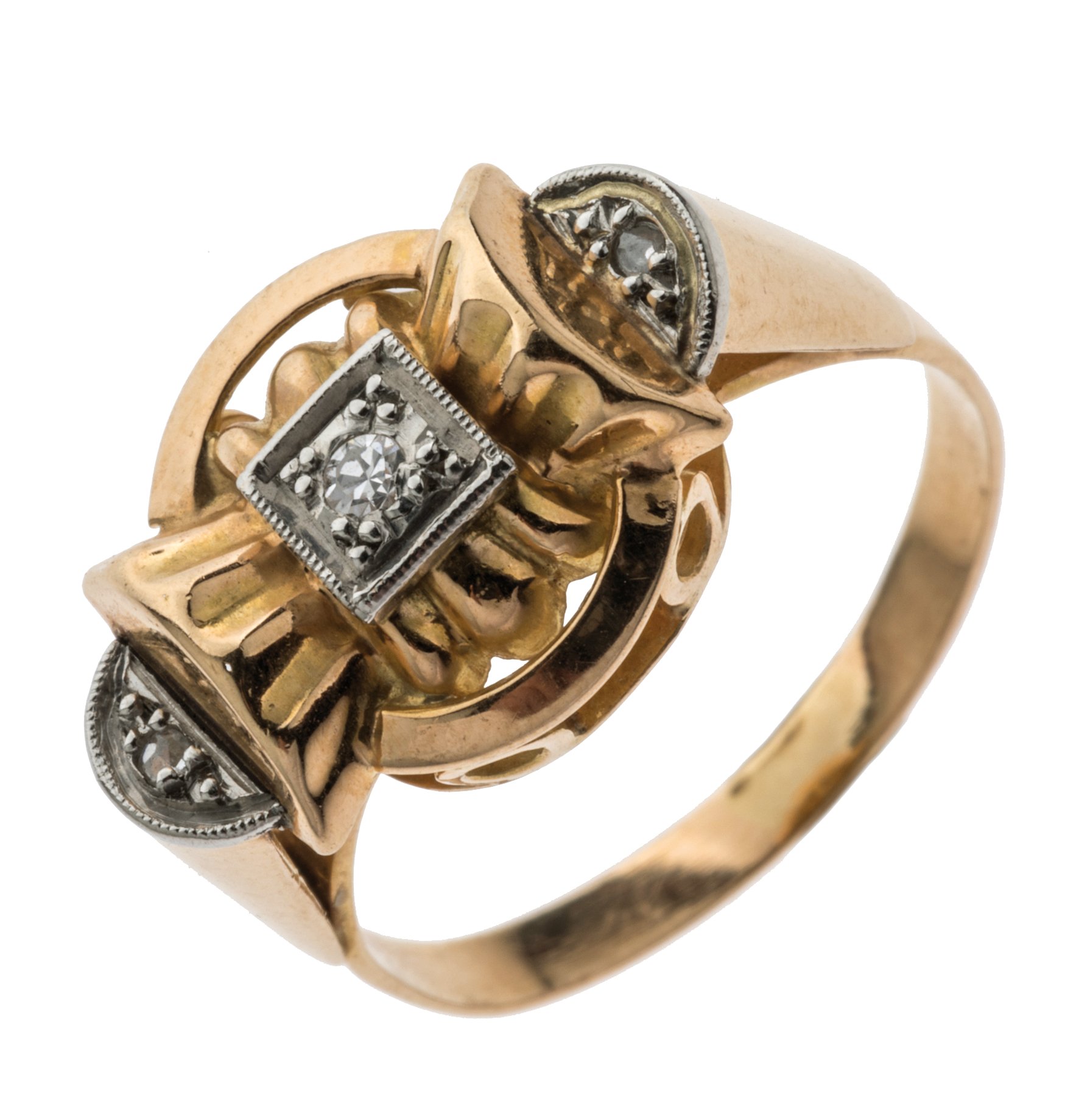Bague en or jaune 750 millièmes et platine 850 millièmes ornée d'un diamant central taillé en huit-huit entre deux diamants taillés en rose.