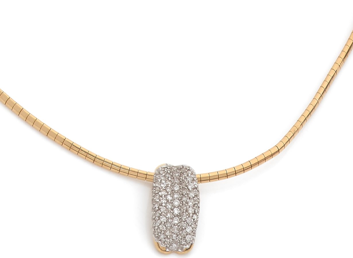 Collier souple en or jaune 750 millièmes supportant en pendentif un motif bombé pavé de diamants ronds de taille brillant.