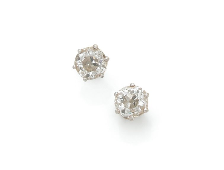 Paire de boutons d'oreilles en or gris 750 millièmes chacun orné d'un diamant coussin de taille ancienne.