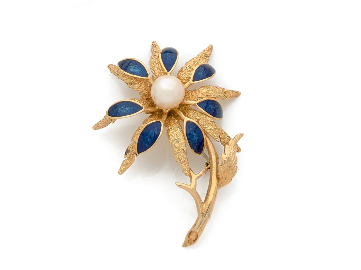 A pearl and blue enamel brooch in 18k yellow gold.