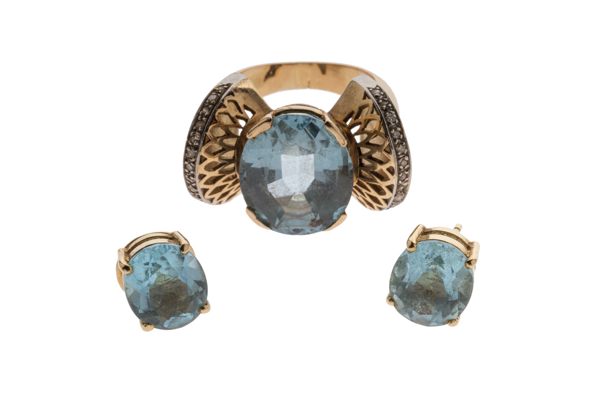 A jewelry set in 18k yellow gold made of lab-created spinel and diamond ring and a pair of earrings set with blue stones (topaz?).