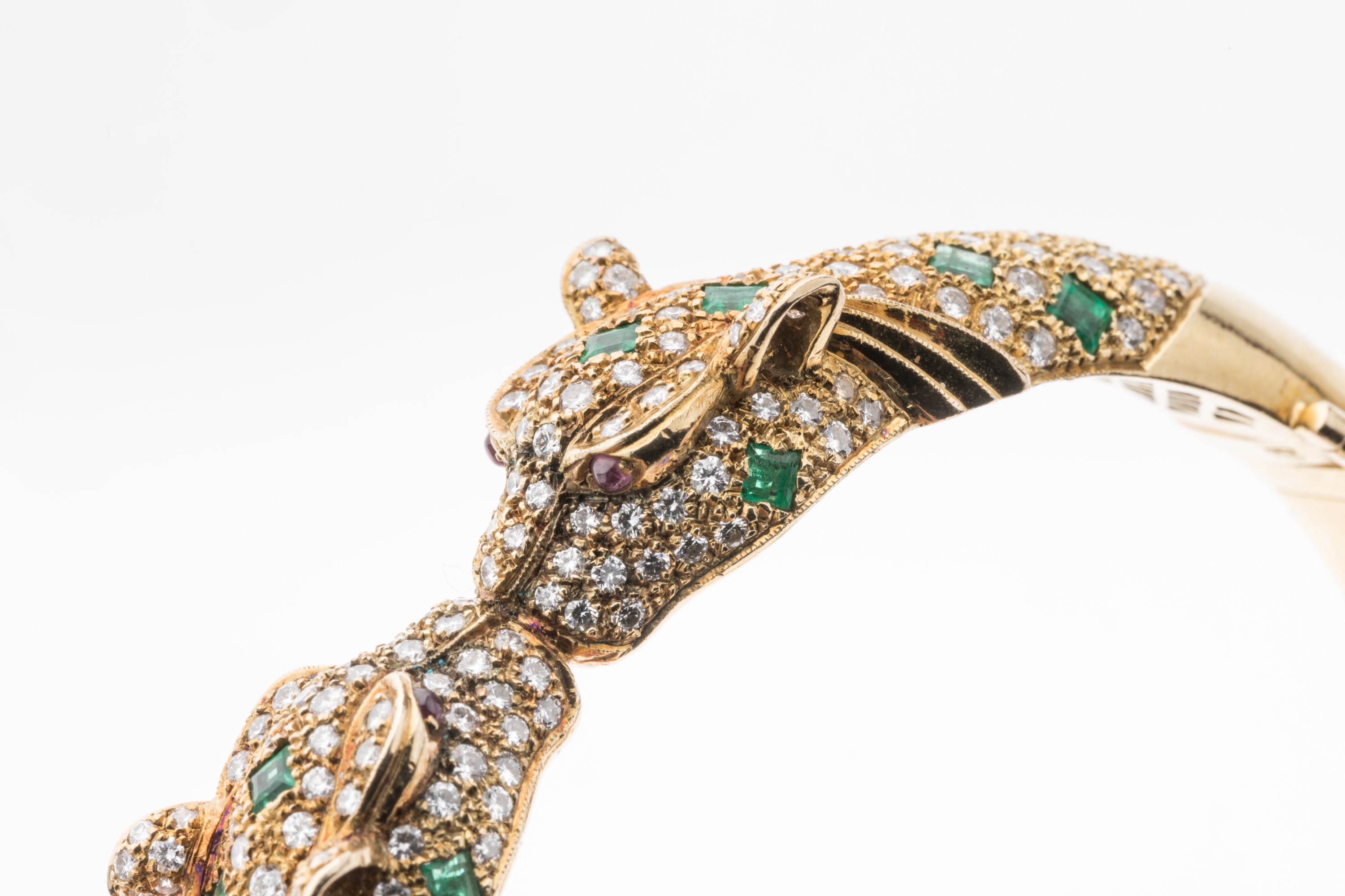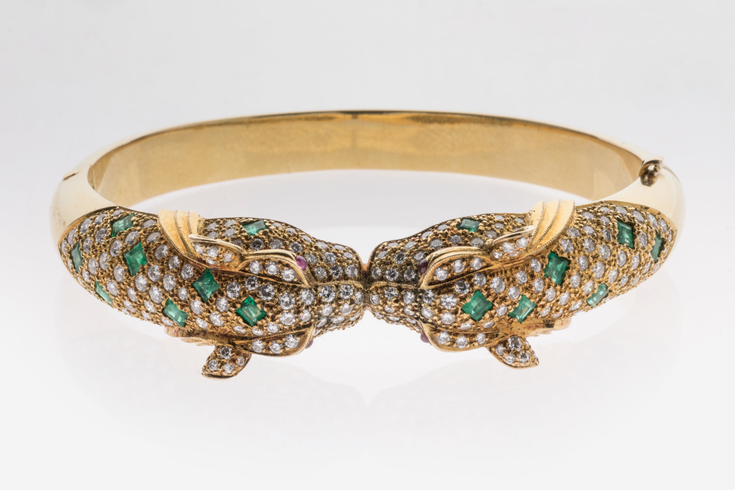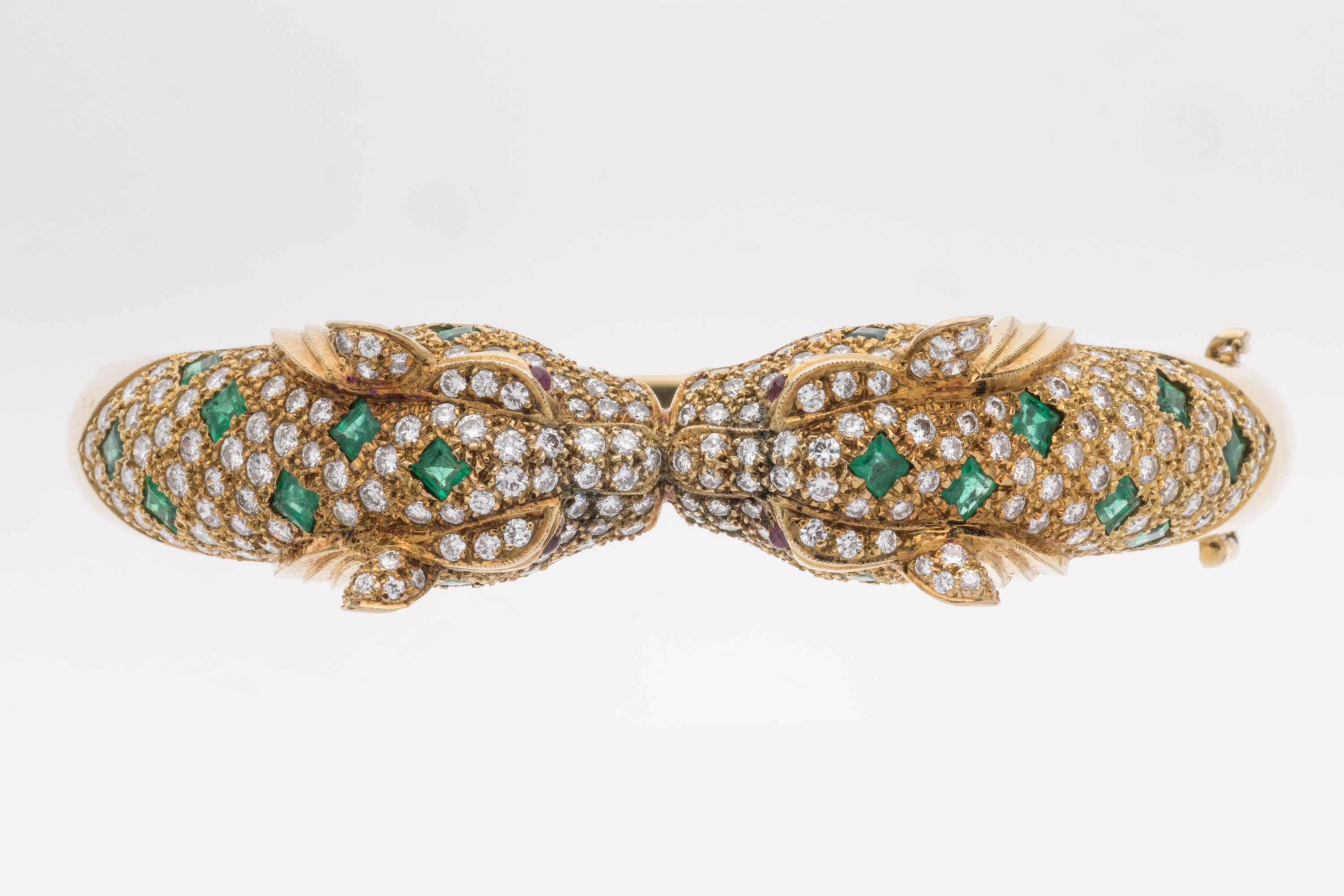 Bracelet rigide et ouvrant en or jaune 750 millièmes à décor de deux têtes de panthères affrontées serties de diamants et d'émeraudes calibrées.