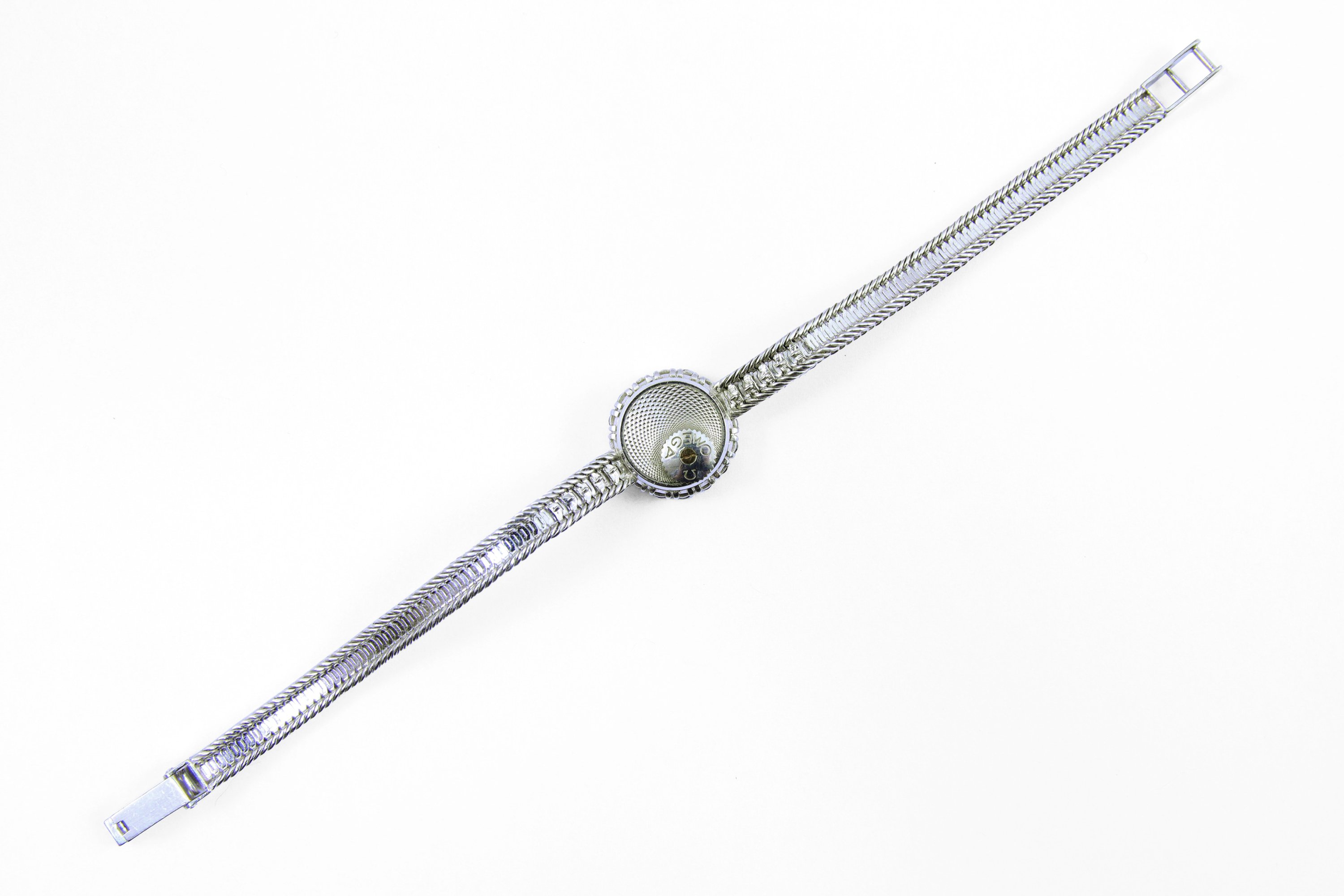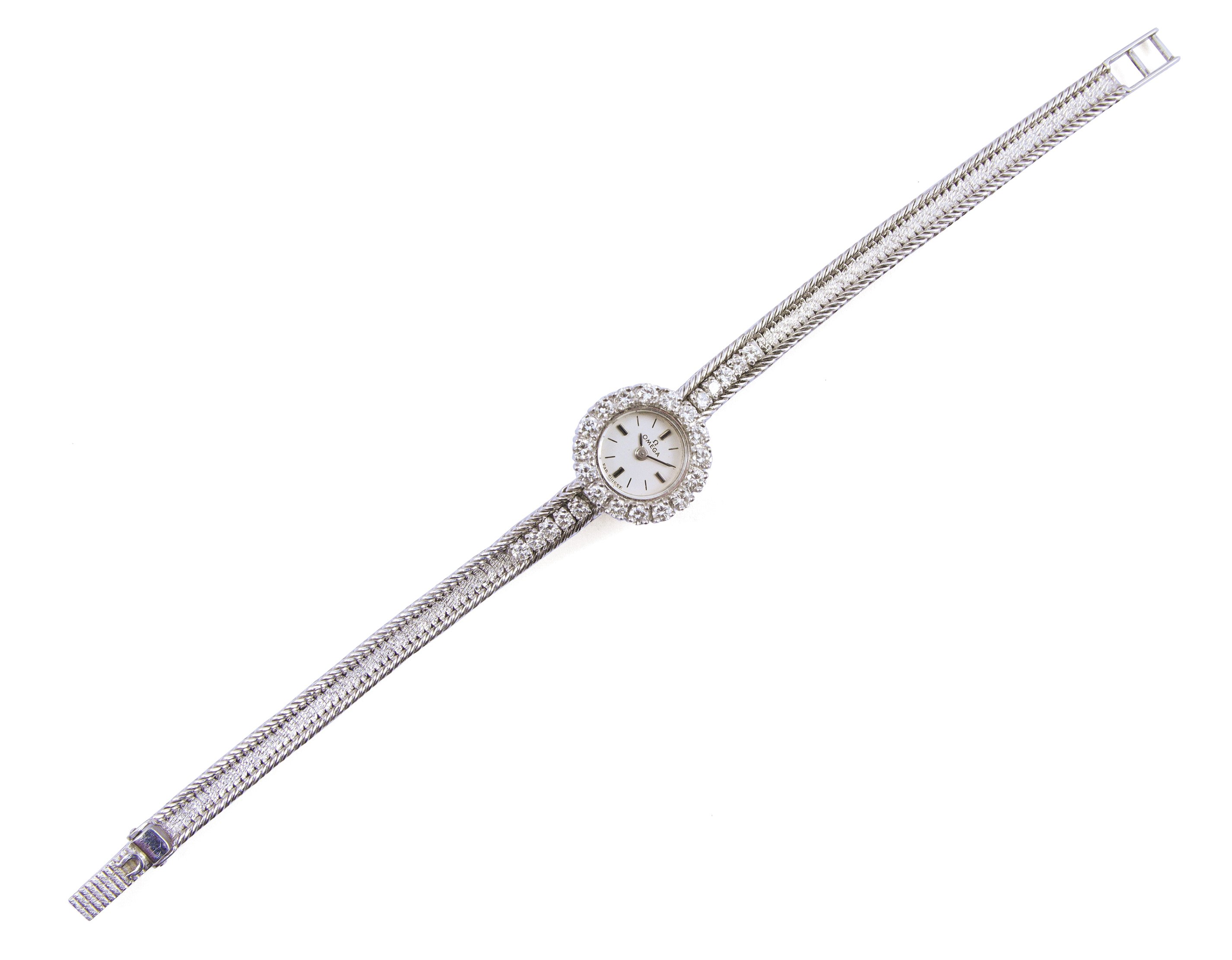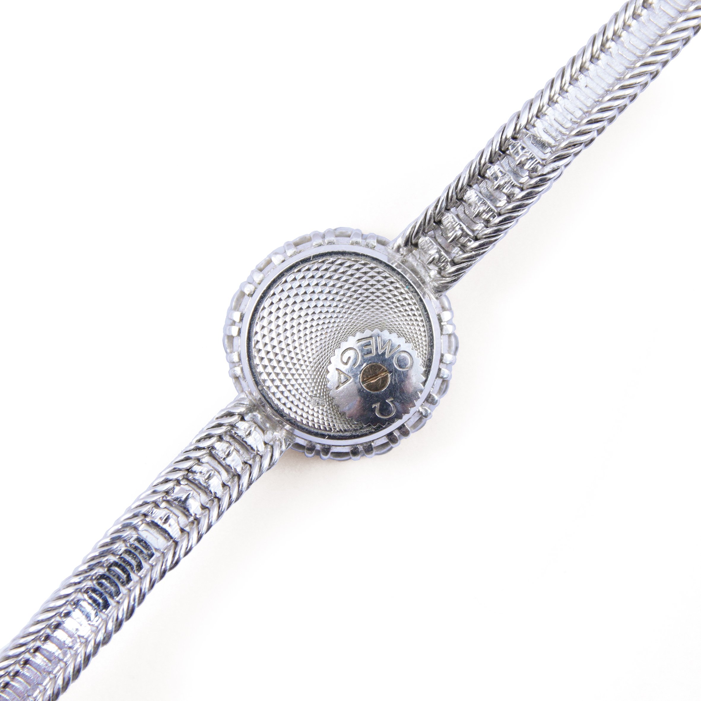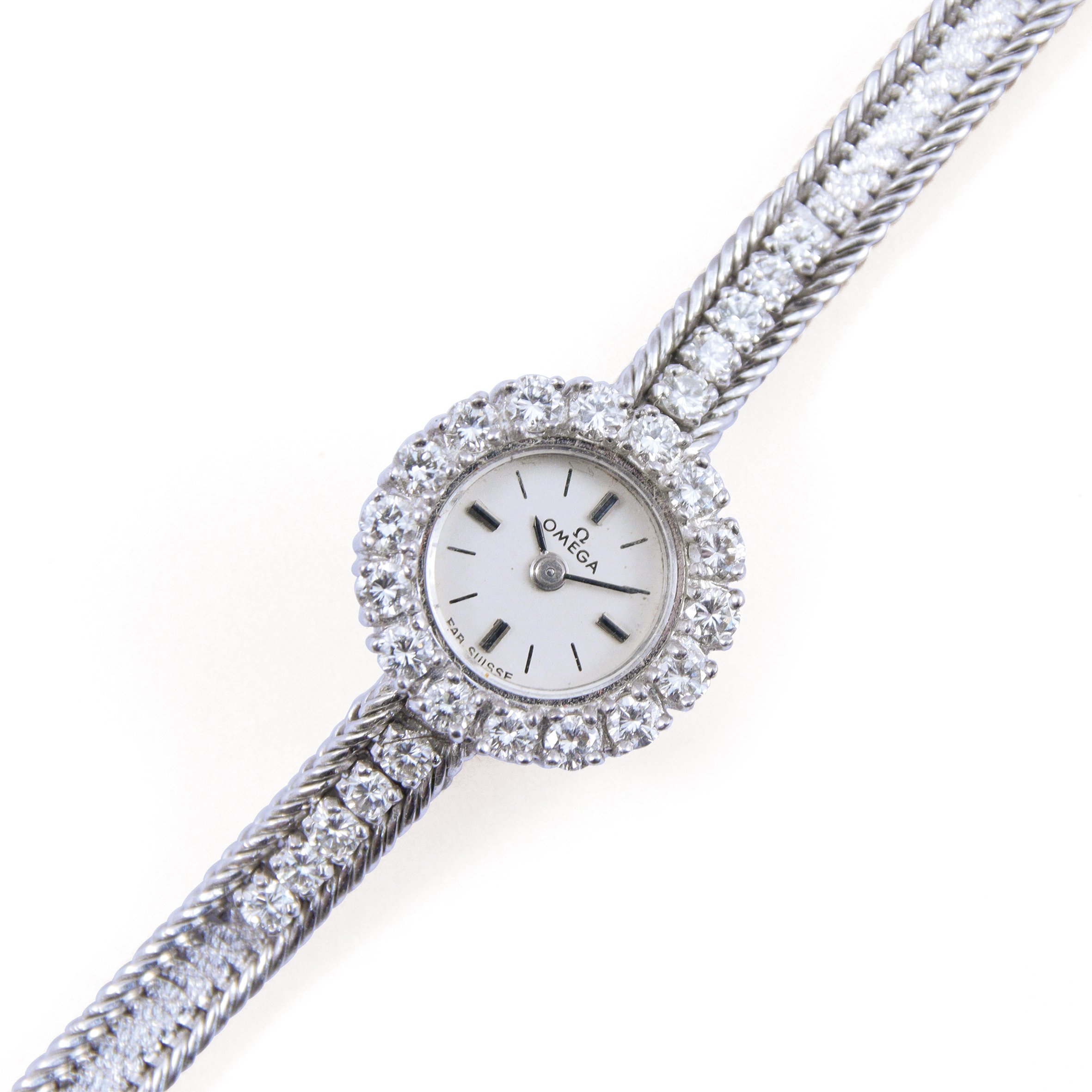 Omega. Montre bracelet en or blanc 750 millièmes. Boîtier rond orné de seize diamants. Cadran avec index noirs. Fond guilloché.