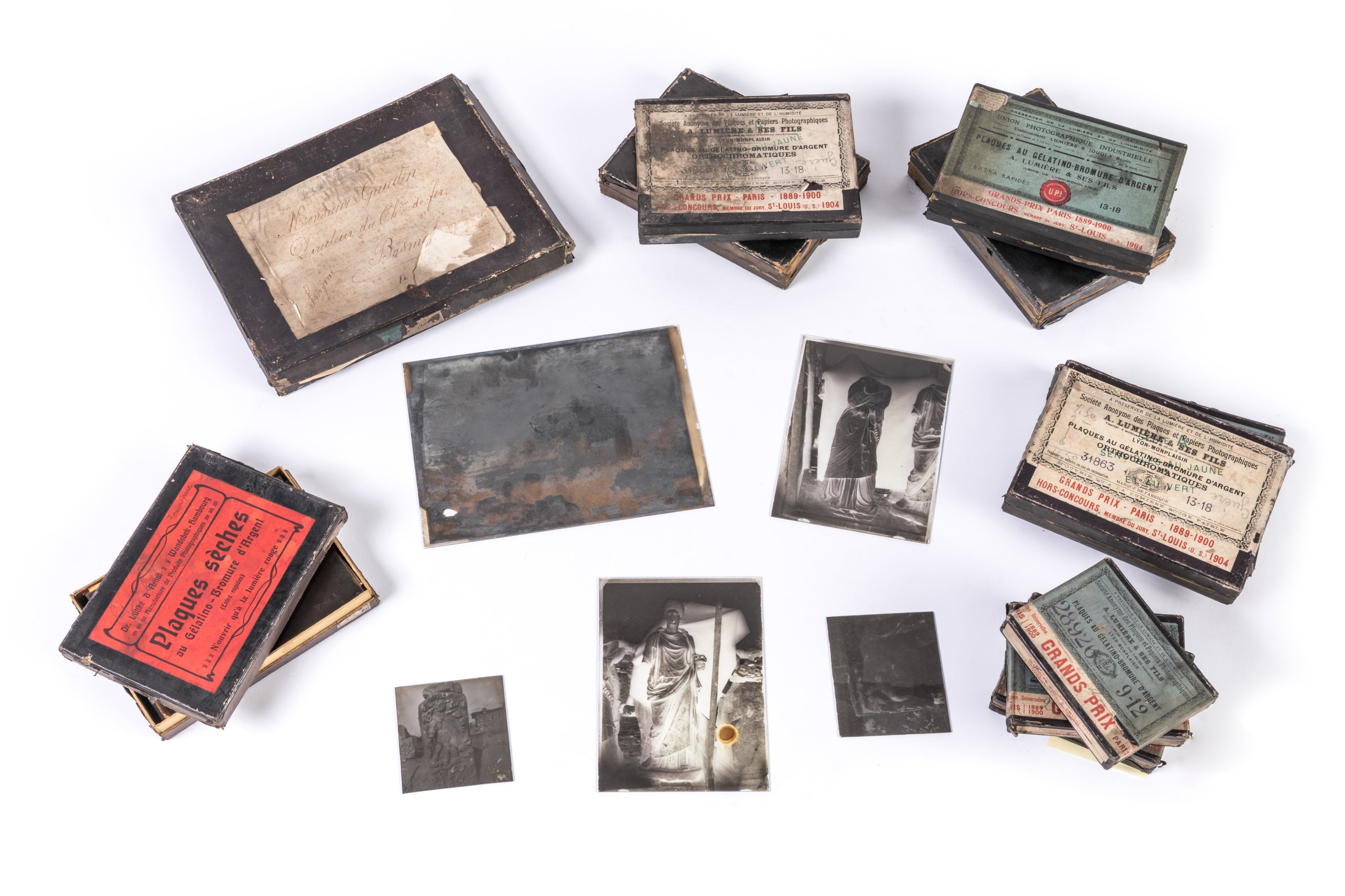 Environ 260 plaques de verre photographiques, quelques-unes cassées ou abimées, présentant des vues des fouilles, d'éléments d'architectures, de statues, etc. Il s'agit de négatifs dont certains tirages se retrouvent dans les deux albums faisant l'objet du lot précédent. Quelques positifs sont également présents.