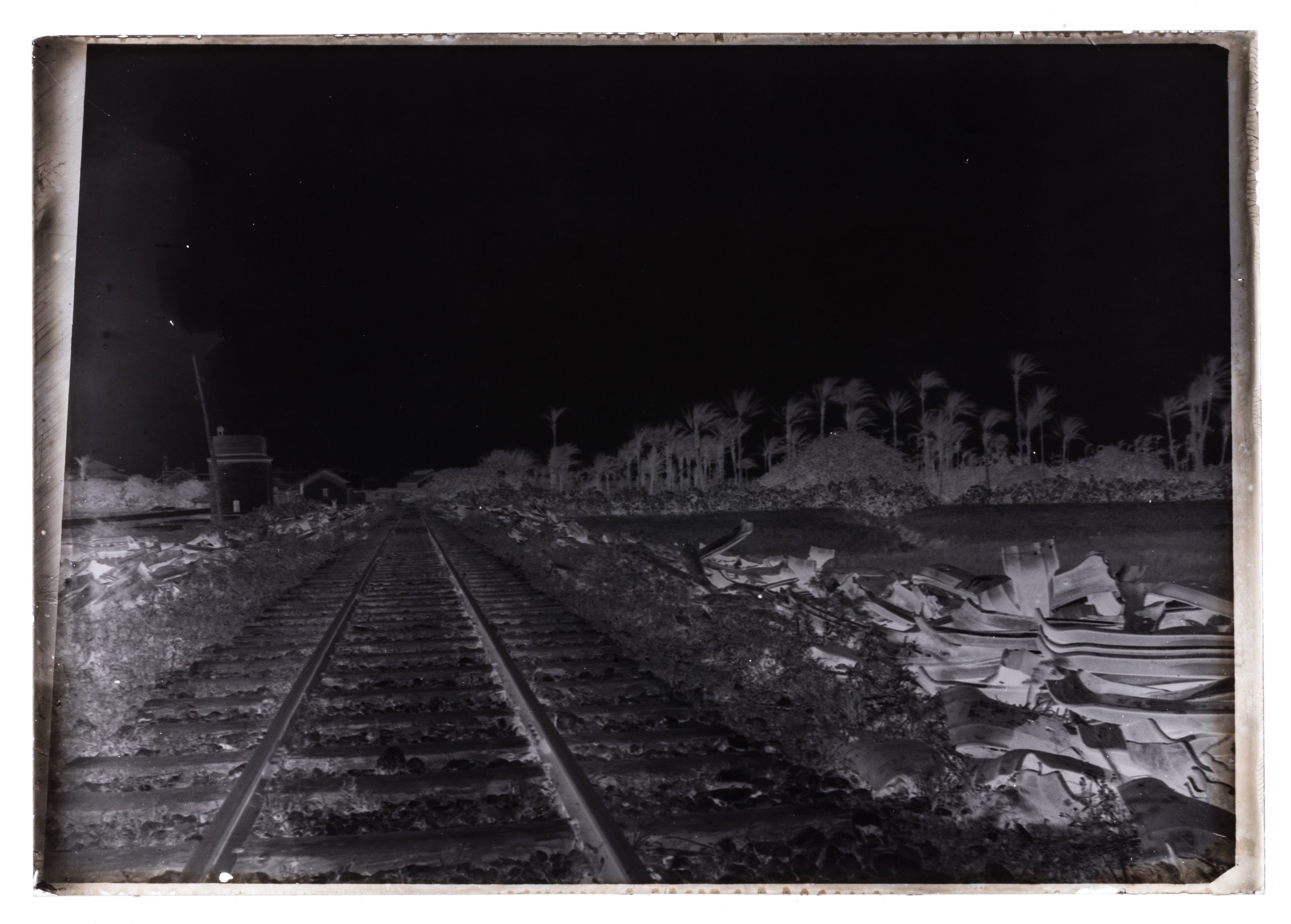 - une boîte au format 13x18 cm : quatre plaques : dont une vue de voie ferrée avec palmiers et quelques bâtiments à l’horizon,