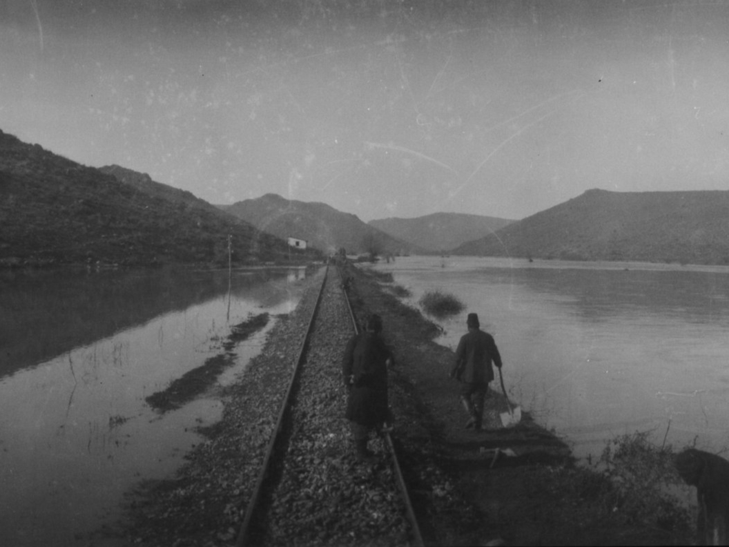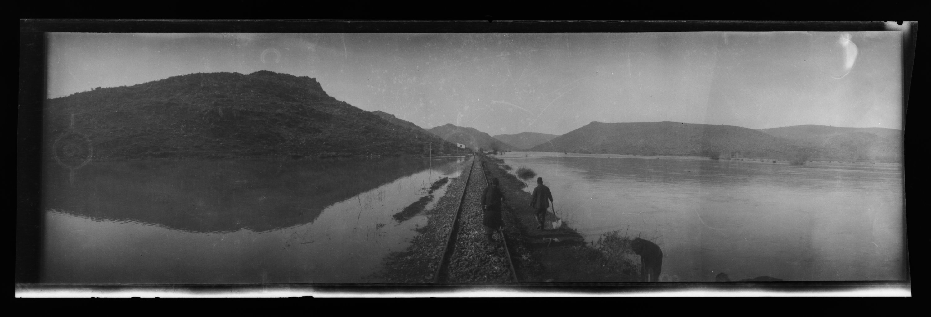 - trois négatifs souples 9,5x31 cm : vue d’une gare et de travaux sur une voie ferrée traversant un lac. Probablement Turquie, vers 1905,